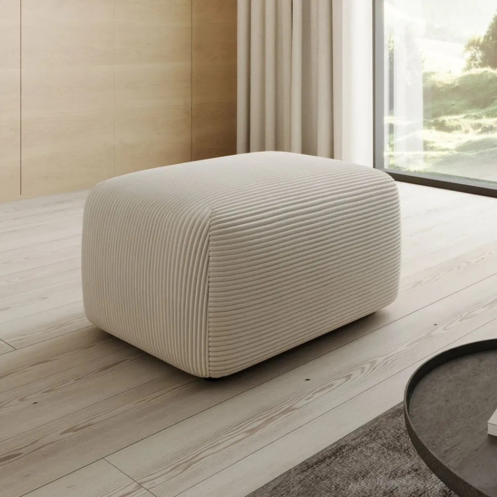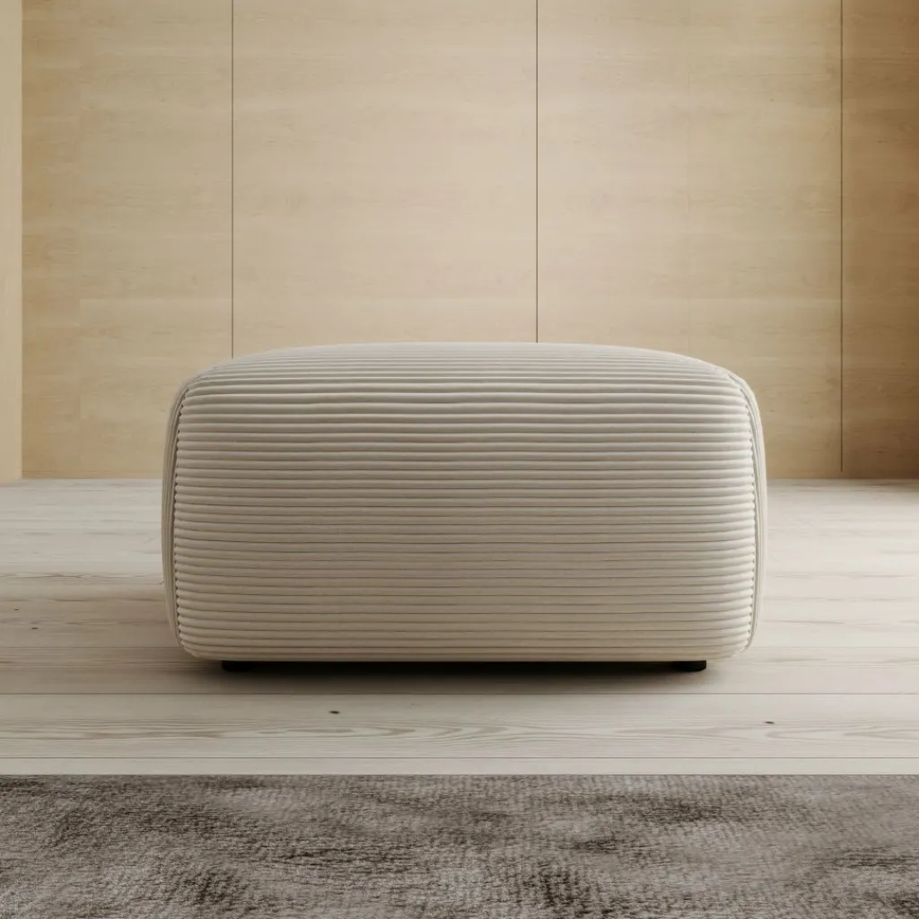 De Prudence poef is uitgevoerd in een zachte beige ribstof en heeft een rustige, organische vormgeving met afgeronde hoeken die zorgen voor een warme en uitnodigende uitstraling. De horizontale ribstructuur van de stof geeft de poef een herkenbaar karakter en sluit goed aan bij verschillende interieurstijlen, van Scandinavisch tot modern landelijk. Met afmetingen van 70 x 55 x 38 cm is de Prudence zowel geschikt als voetensteun bij een bank als als zelfstandig zitelement in de woonkamer.