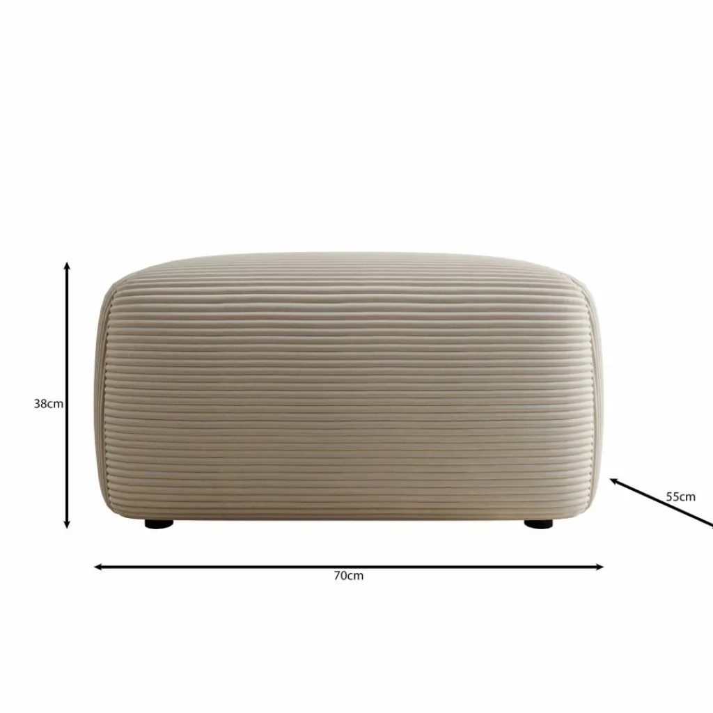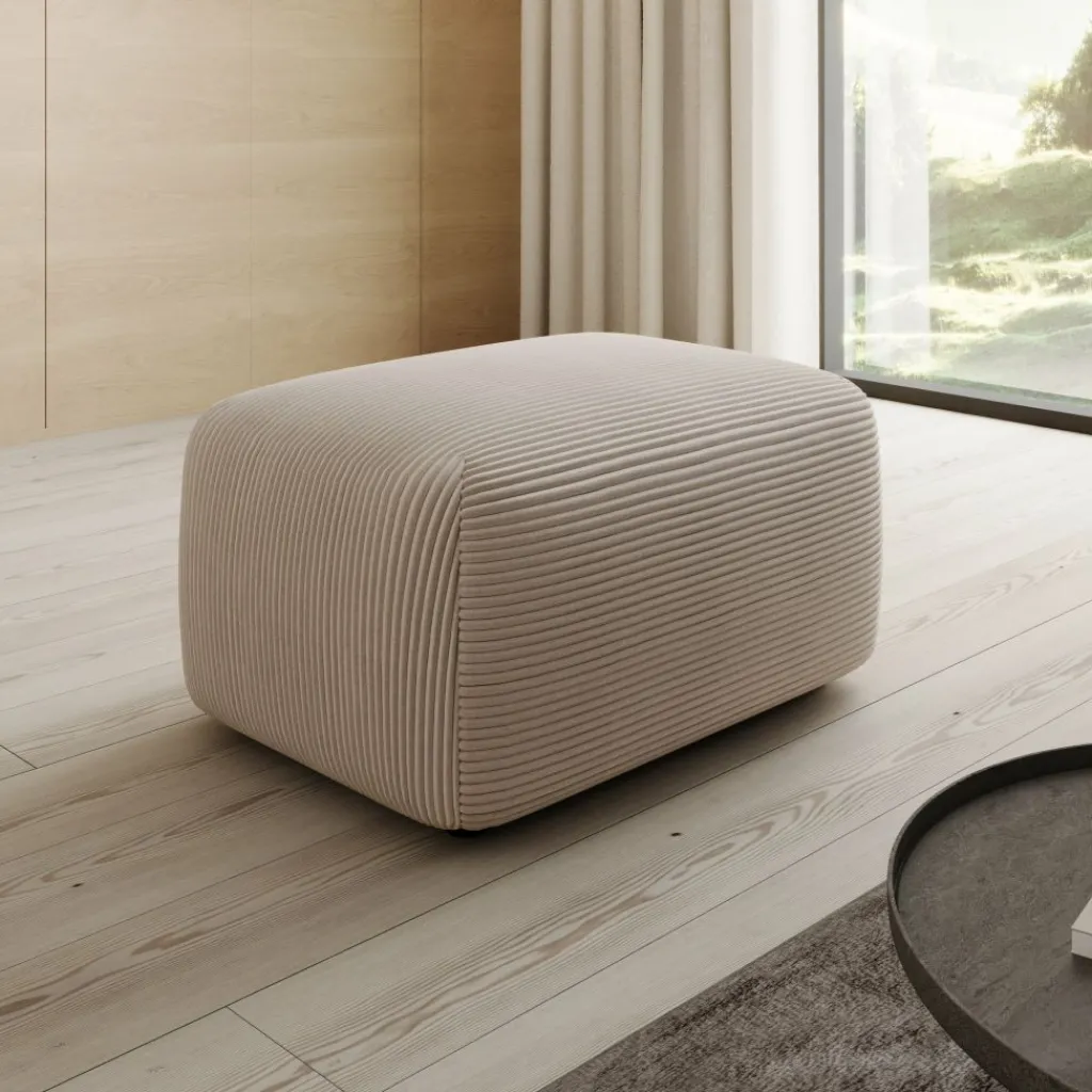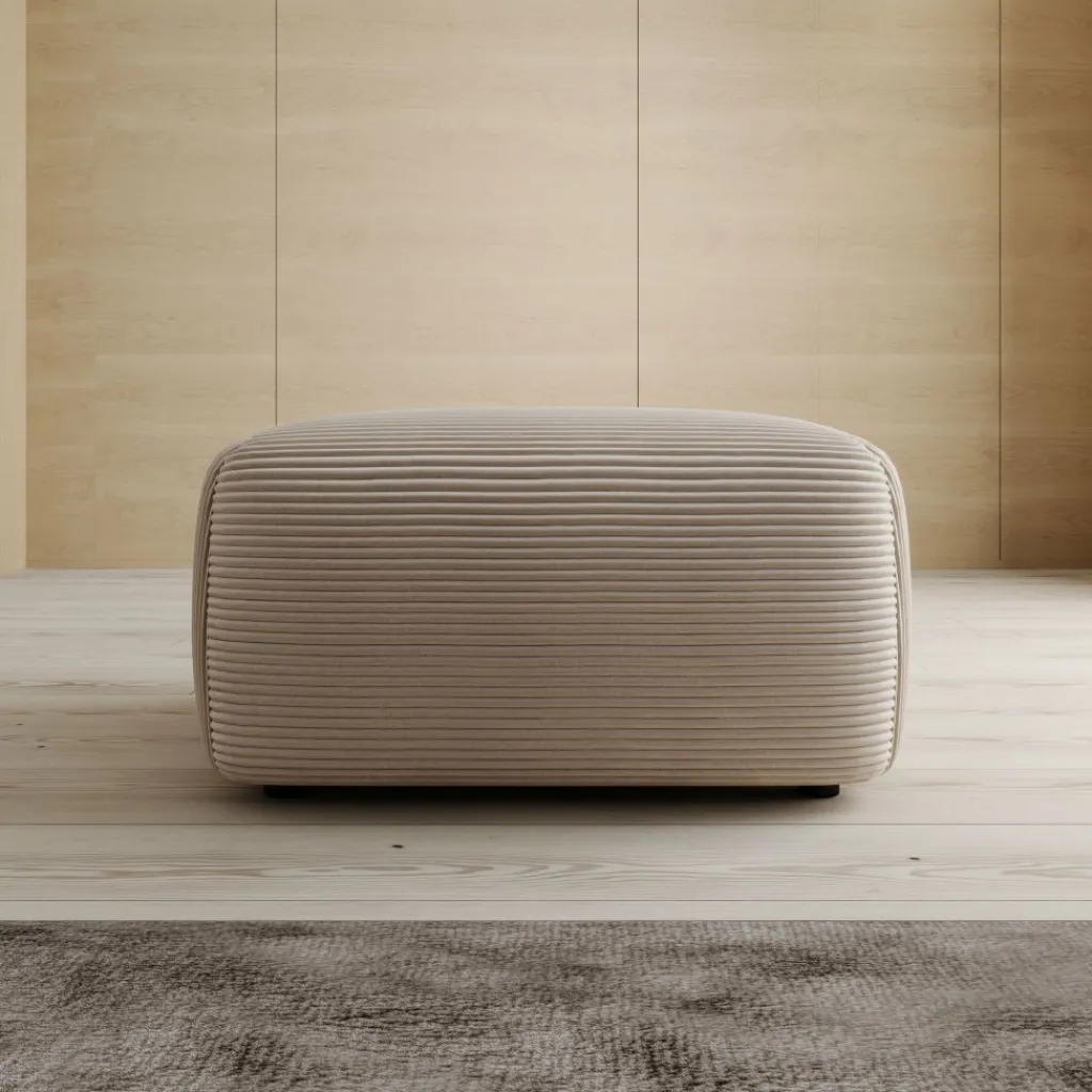 De Prudence poef is uitgevoerd in een warme bruine ribstof en heeft een rustige, organische vormgeving met afgeronde hoeken die zorgen voor een warme en uitnodigende uitstraling. De horizontale ribstructuur van de stof geeft de poef een herkenbaar karakter en sluit goed aan bij verschillende interieurstijlen, van Scandinavisch tot modern landelijk. Met afmetingen van 70 x 55 x 38 cm is de Prudence zowel geschikt als voetensteun bij een bank als als zelfstandig zitelement in de woonkamer.
