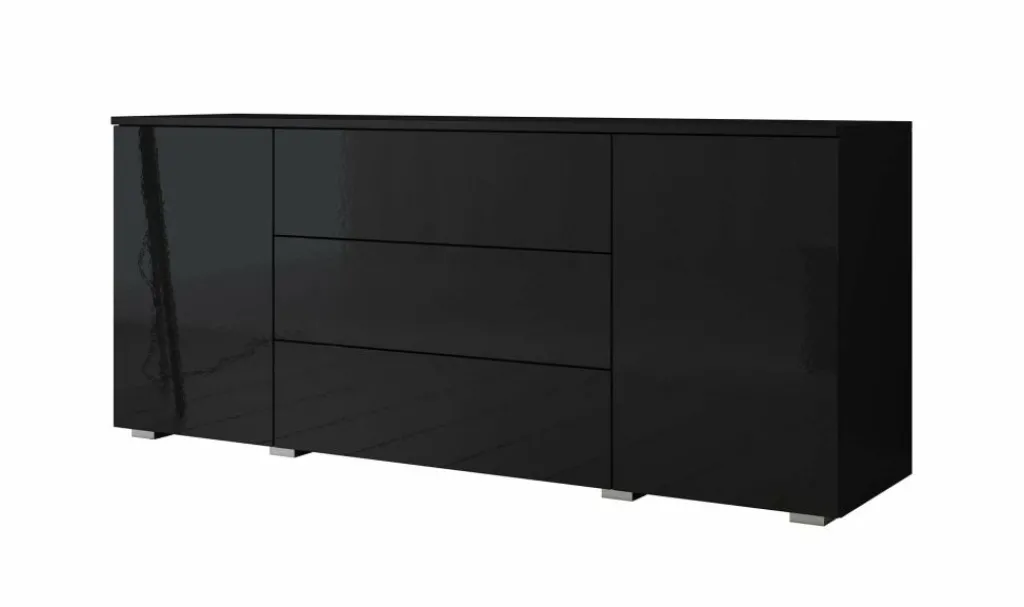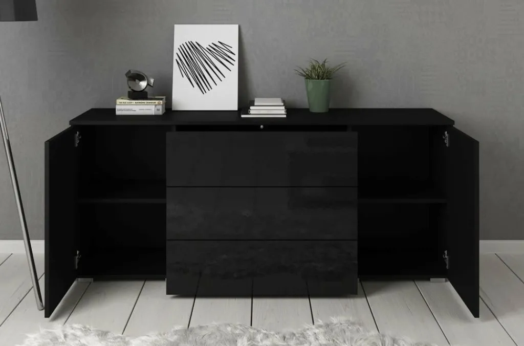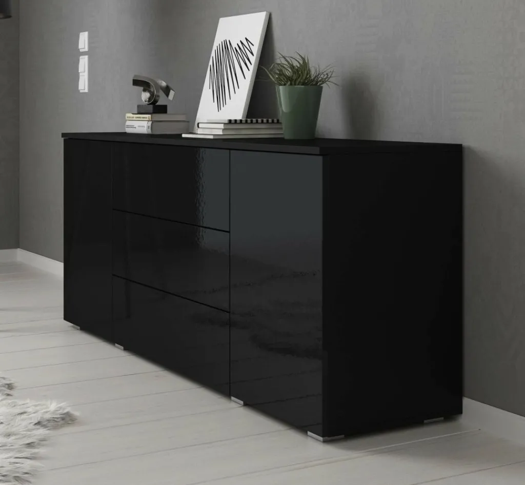 Dressoir Pure is een praktisch en moderne designkast, uitgevoerd in een zwarte kleur. De voorzijde is geheel uitgevoerd in hoogglans zwart. De ombouw in mat zwart. De kast beschikt over 2 openslaande deuren en 3 brede opberglades. Door het strakke en eenvoudige design is dit meubel vooral passend binnen een moderne woonstijl.