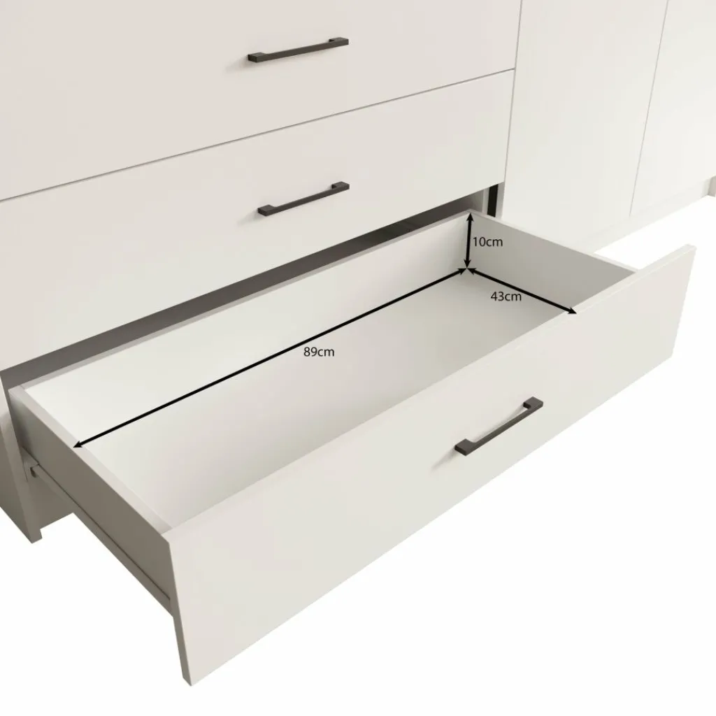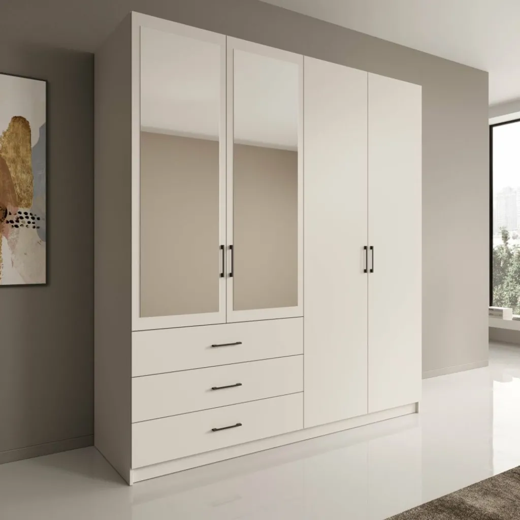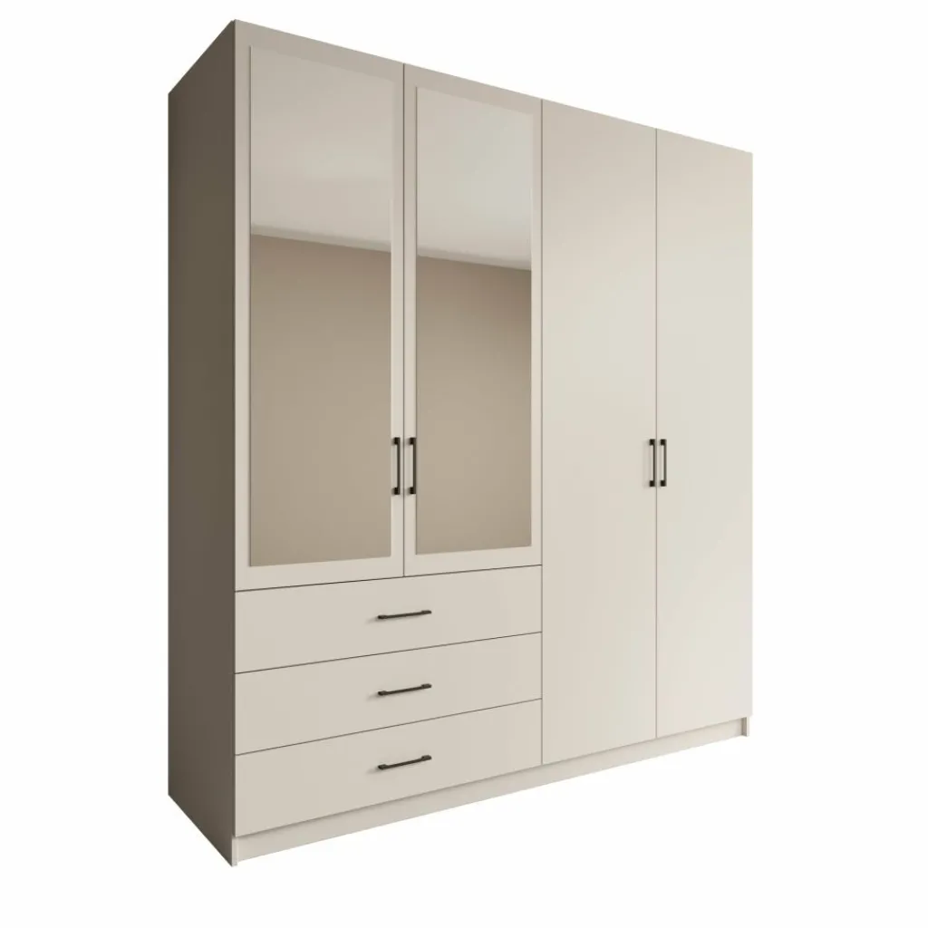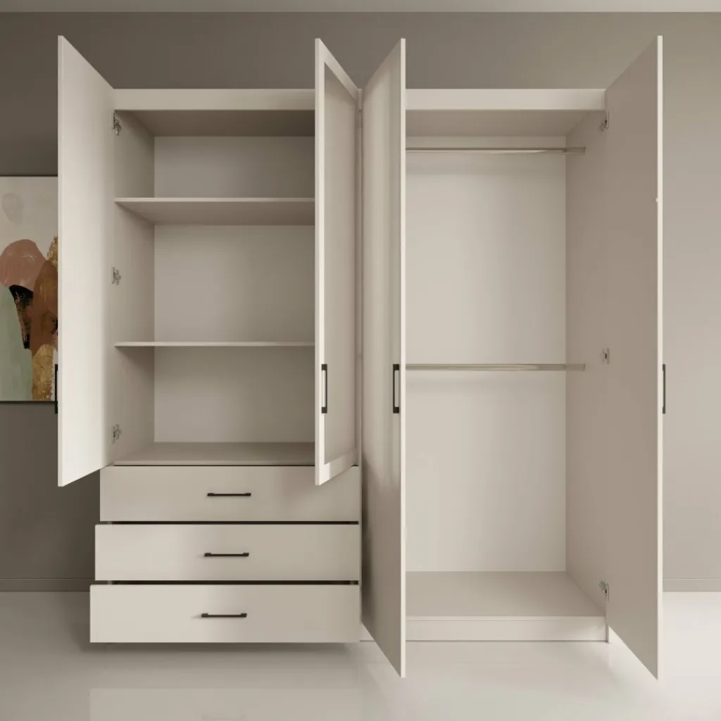 Aan de linkerzijde is de kast voorzien van meerdere legplanken boven drie lades, geschikt voor gevouwen kleding en kleinere items. De rechterzijde bestaat uit een hanggedeelte met daaronder een extra onderplank, ideaal voor jassen, jurken en andere langere kledingstukken. De vier draaideuren zorgen voor een duidelijke scheiding tussen de verschillende opbergzones en bieden gemakkelijke toegang. De zwarte handgrepen vormen een strak contrast met de beige afwerking.
