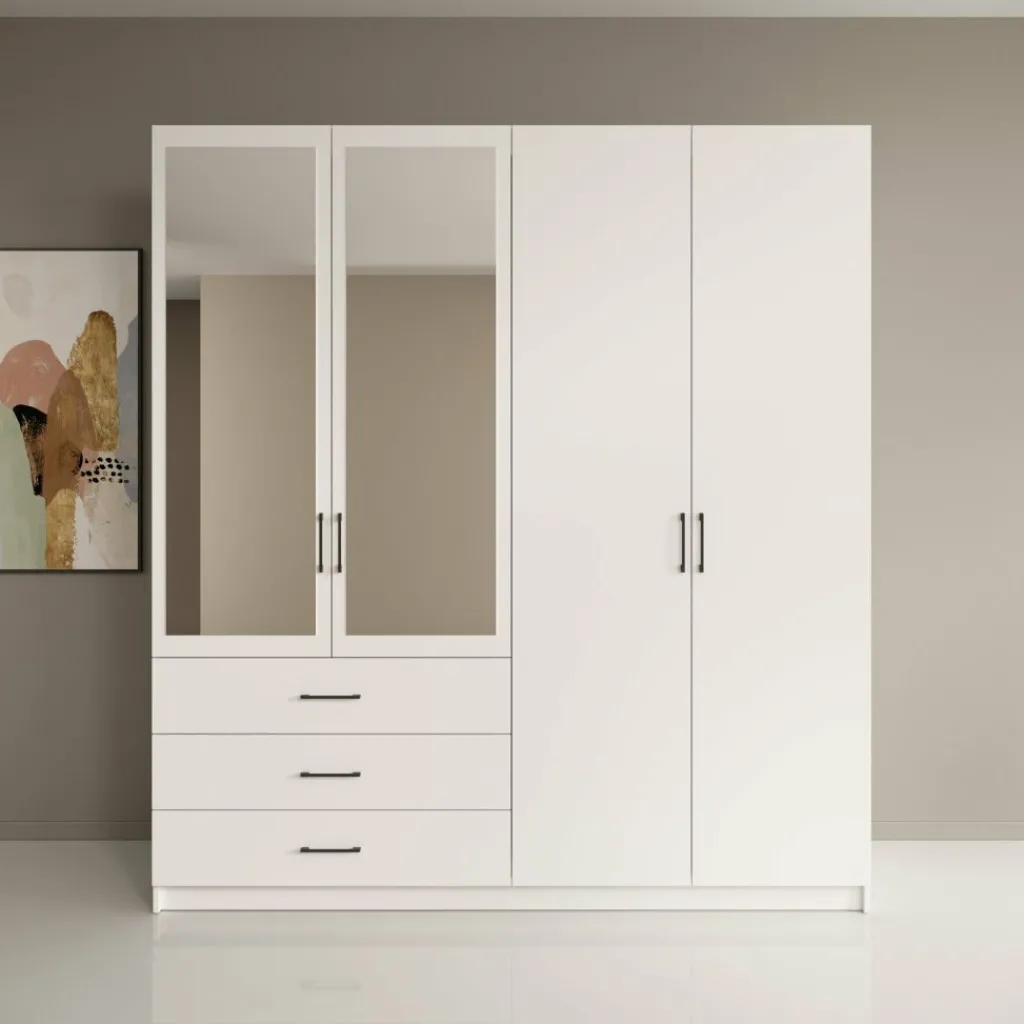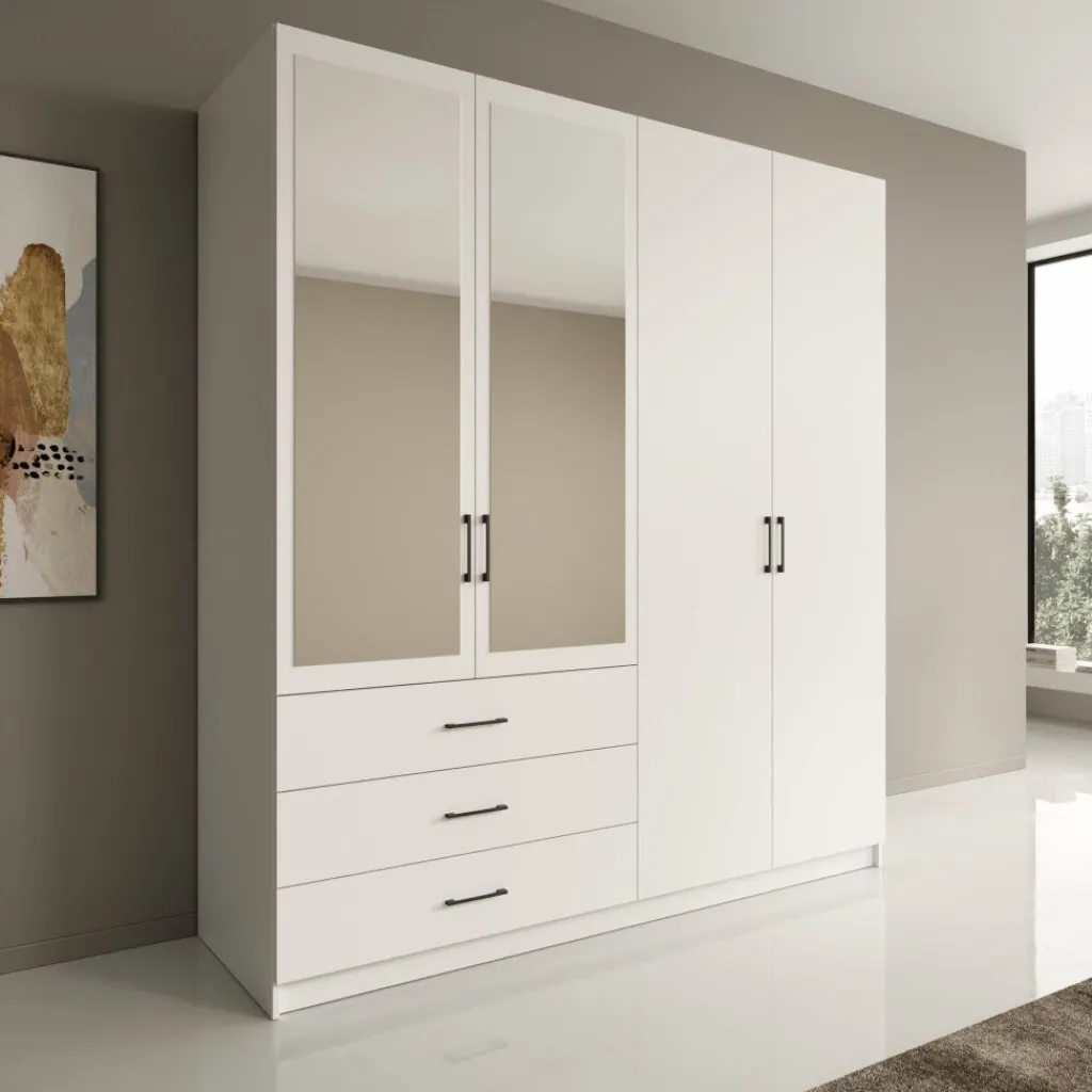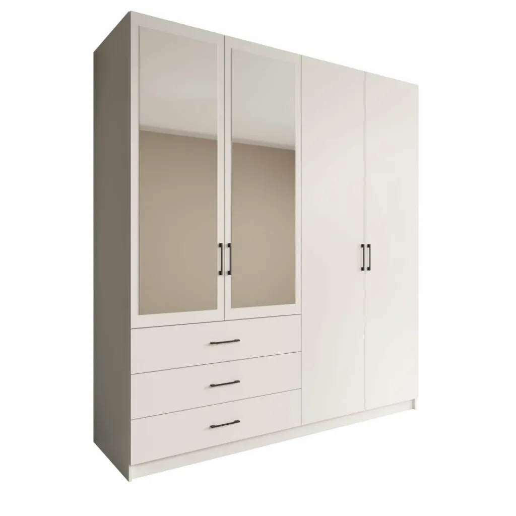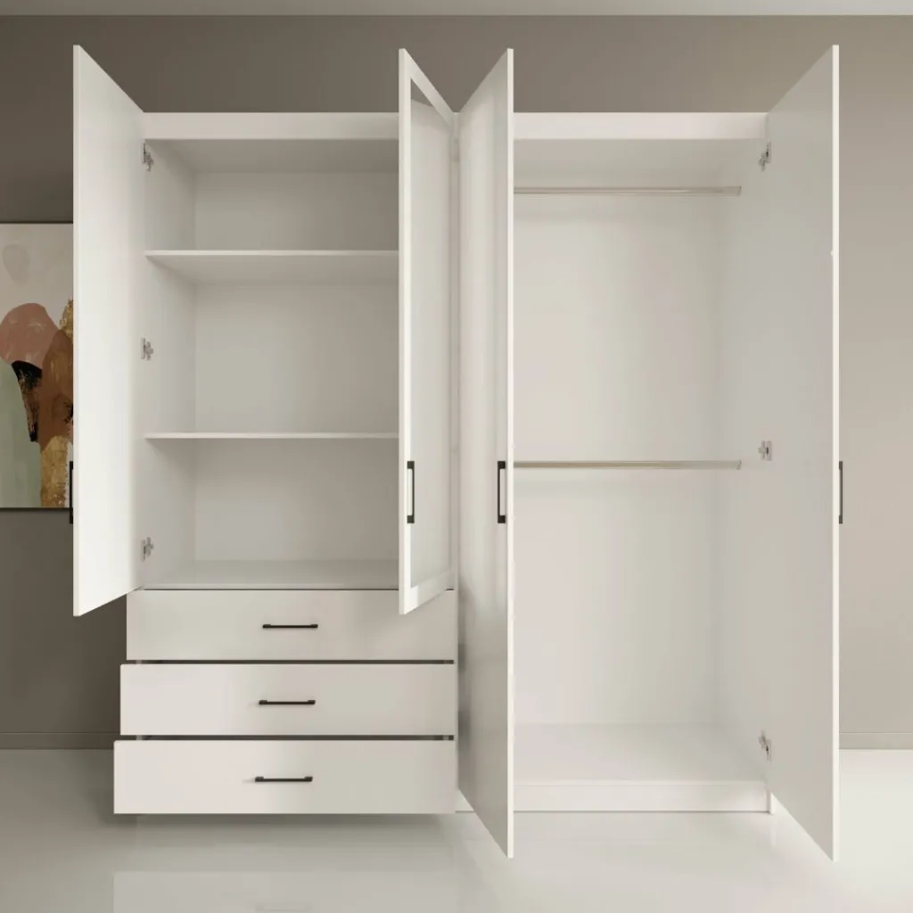 Aan de linkerzijde beschikt de kast over meerdere legplanken boven drie lades, geschikt voor gevouwen kleding en kleinere items. De rechterzijde is ingericht met een hanggedeelte en een extra onderplank, ideaal voor jassen, jurken en langere kledingstukken. De vier draaideuren zorgen voor een duidelijke indeling en gemakkelijke toegang tot alle compartimenten. De zwarte grepen geven het geheel een strak en rustig contrast met de witte afwerking.