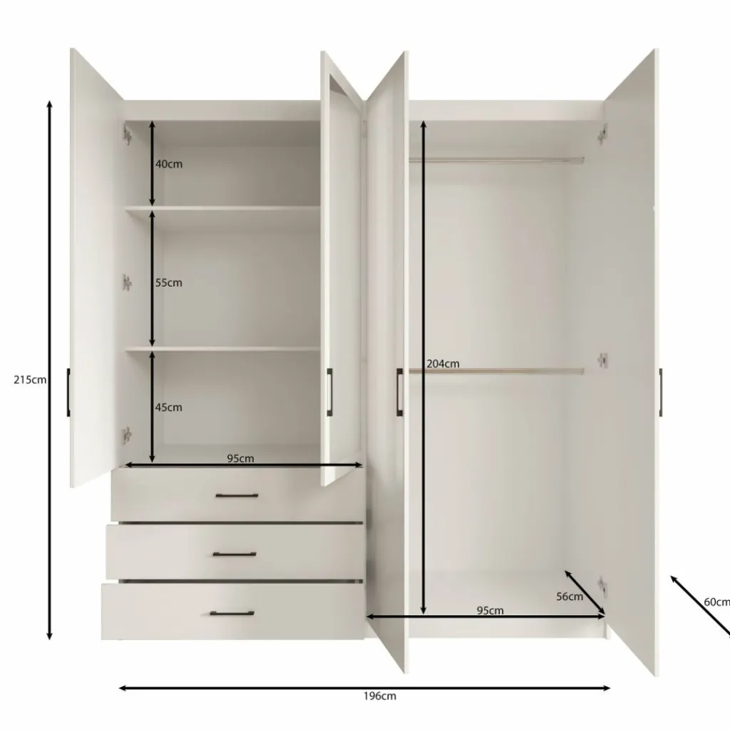 De Puro kledingkast met 4 deuren in wit biedt veel opbergruimte binnen een overzichtelijke indeling. Met een breedte van 196 cm, een diepte van 60 cm en een hoogte van 215 cm is deze kast geschikt voor het opbergen van kleding, linnengoed en accessoires in één meubel.