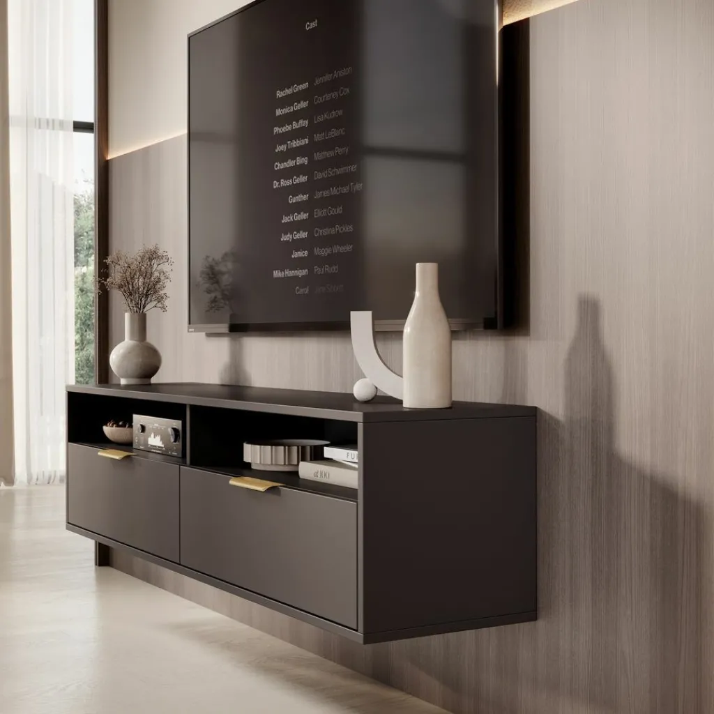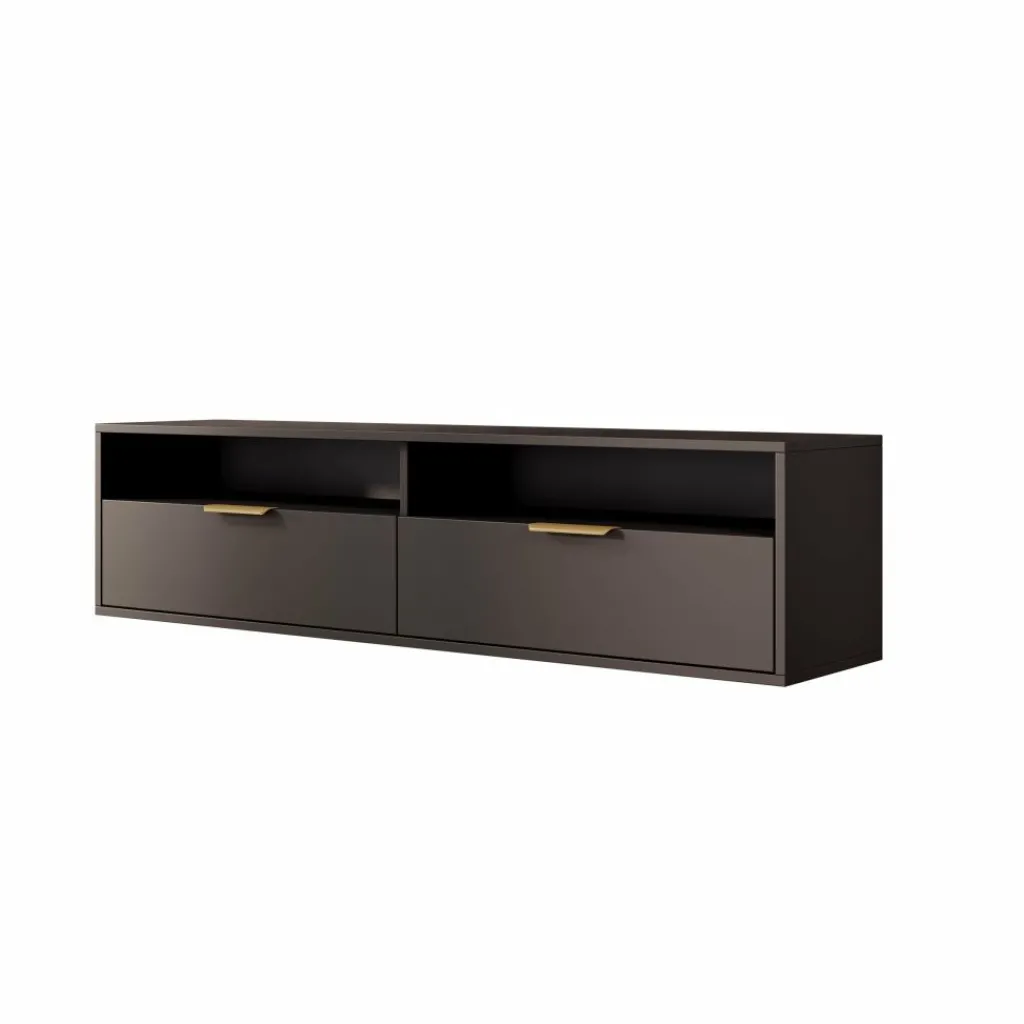 TV-meubel Qipp is een strak vormgegeven meubel in zwart met goudkleurige grepen. Het zwevende ontwerp creëert een moderne uitstraling en biedt praktische opbergruimte zonder vloeroppervlak te verliezen.