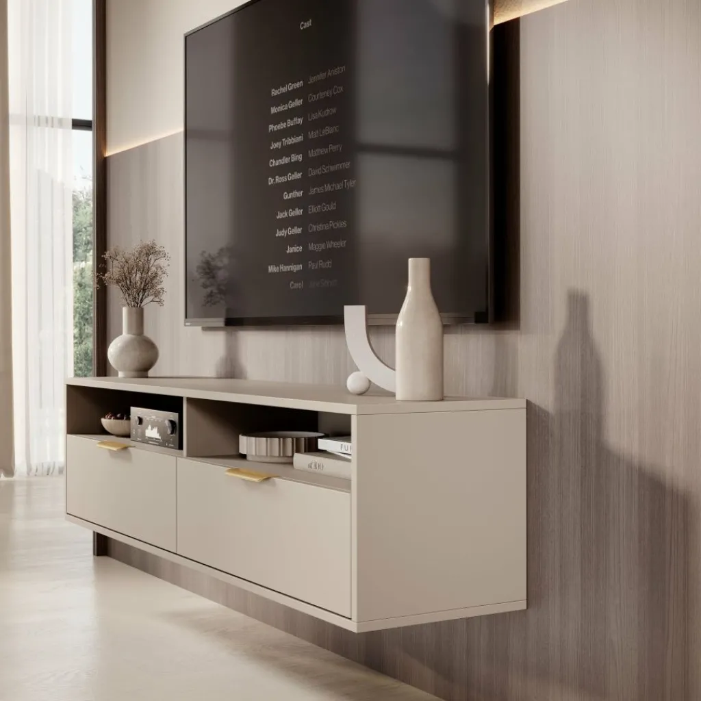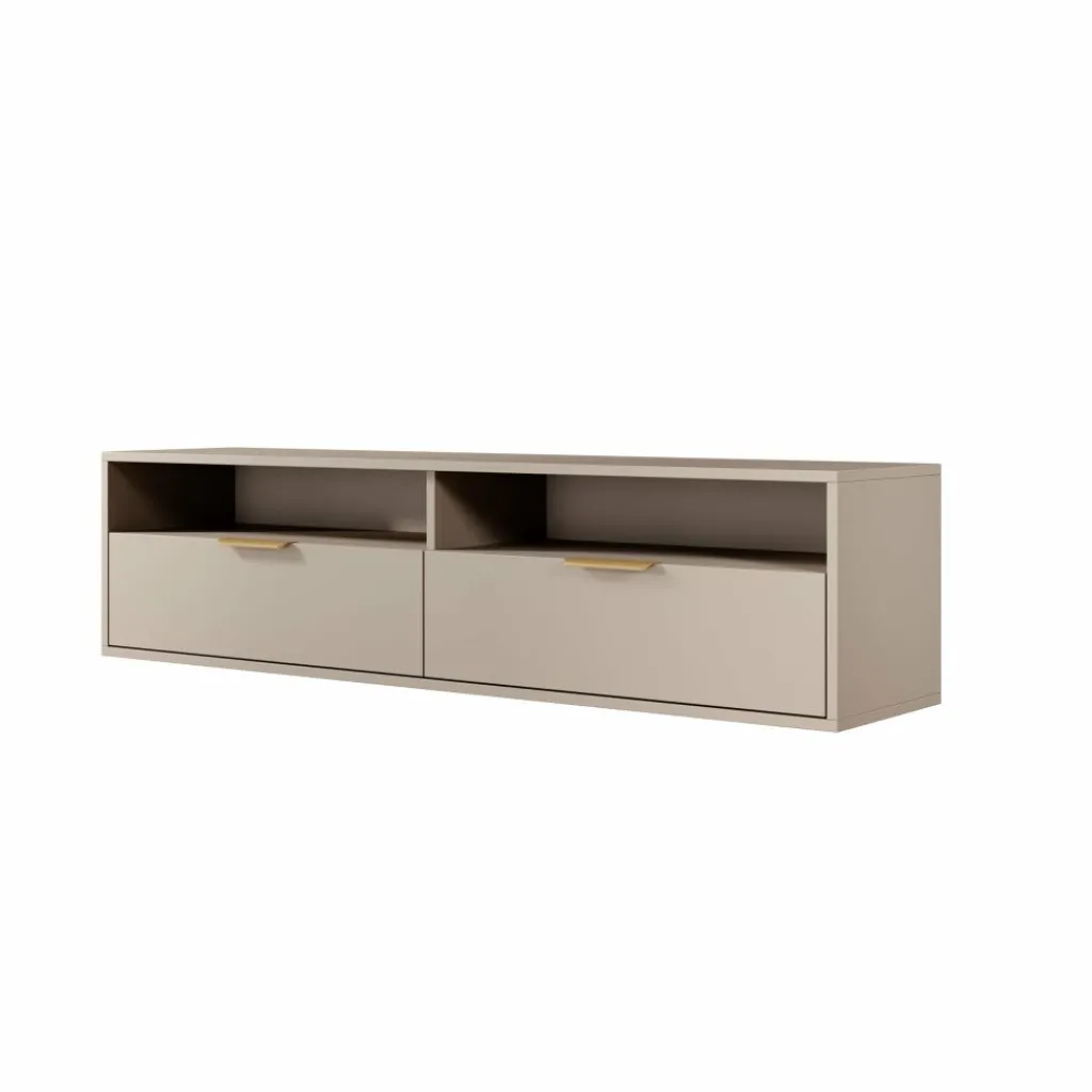 Qipp is een strak vormgegeven TV-meubel in beige met goudkleurige grepen. Het zwevende ontwerp creëert een moderne uitstraling en biedt praktische opbergruimte zonder vloeroppervlak te verliezen.