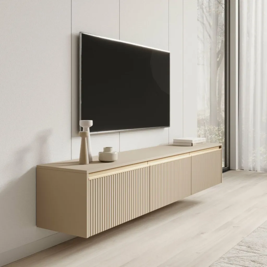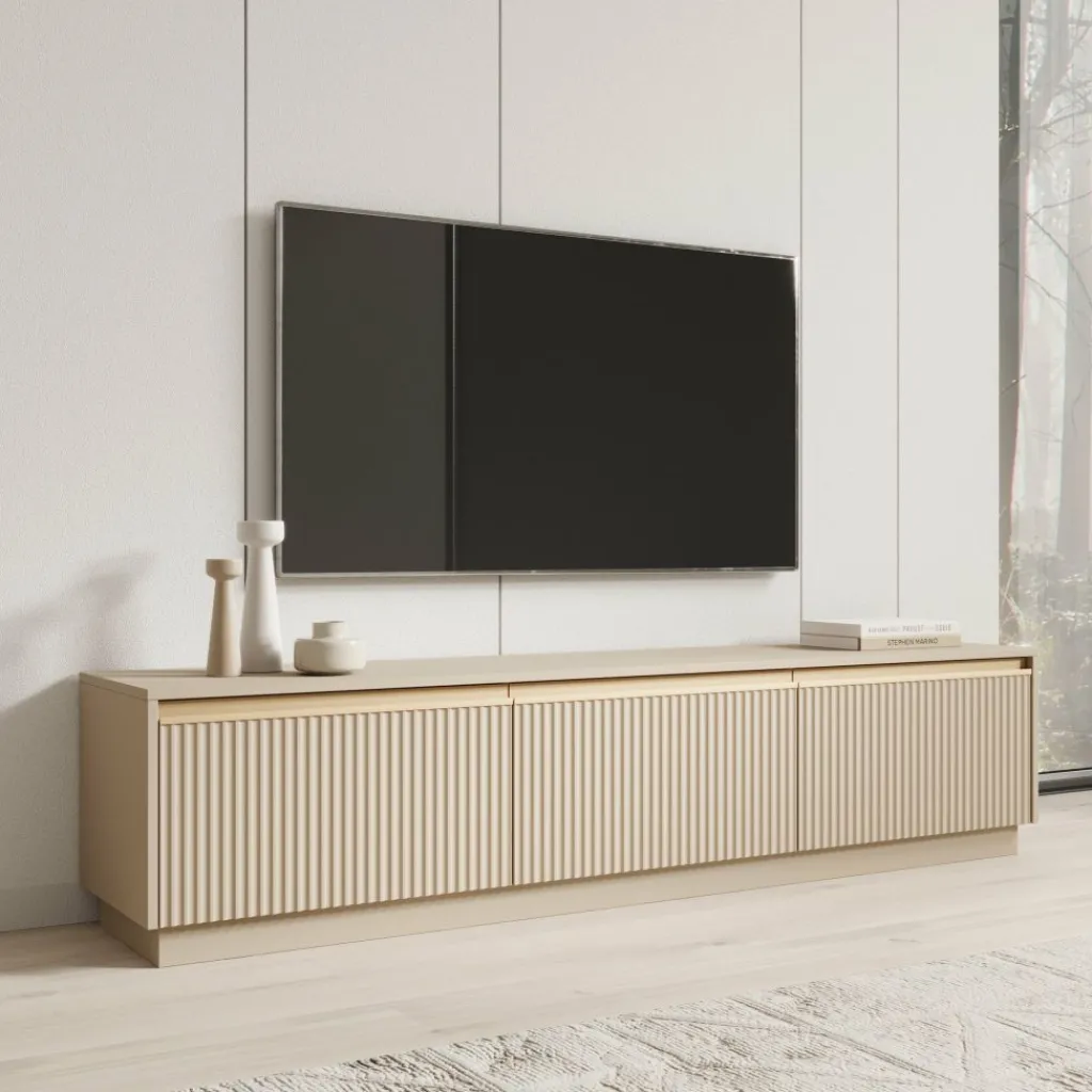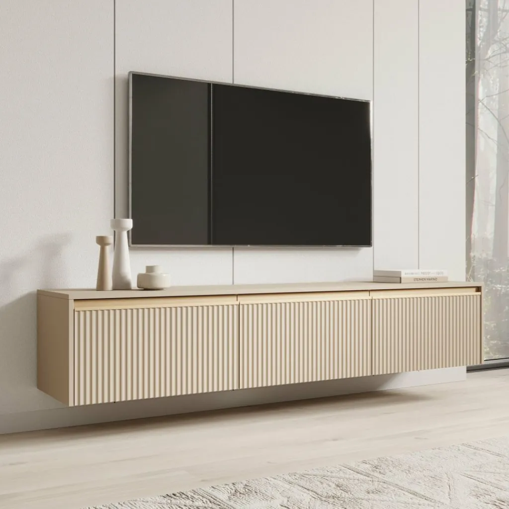 TV-Meubel Remy is een opbergkast voor onder de tv in een moderne stijl. De TV-kast is gemaakt in een beige kleur. TV-Meubel Remy beschikt over 3 deuren waarachter in totaal 3 opbergvakken zitten. De voorkant van deze deuren hebben een latten patroon. Tijdens het monteren heb je de keuze om het meubel hangend of staand te monteren. In de achterwand zit geen uitsparing voor bedrading.