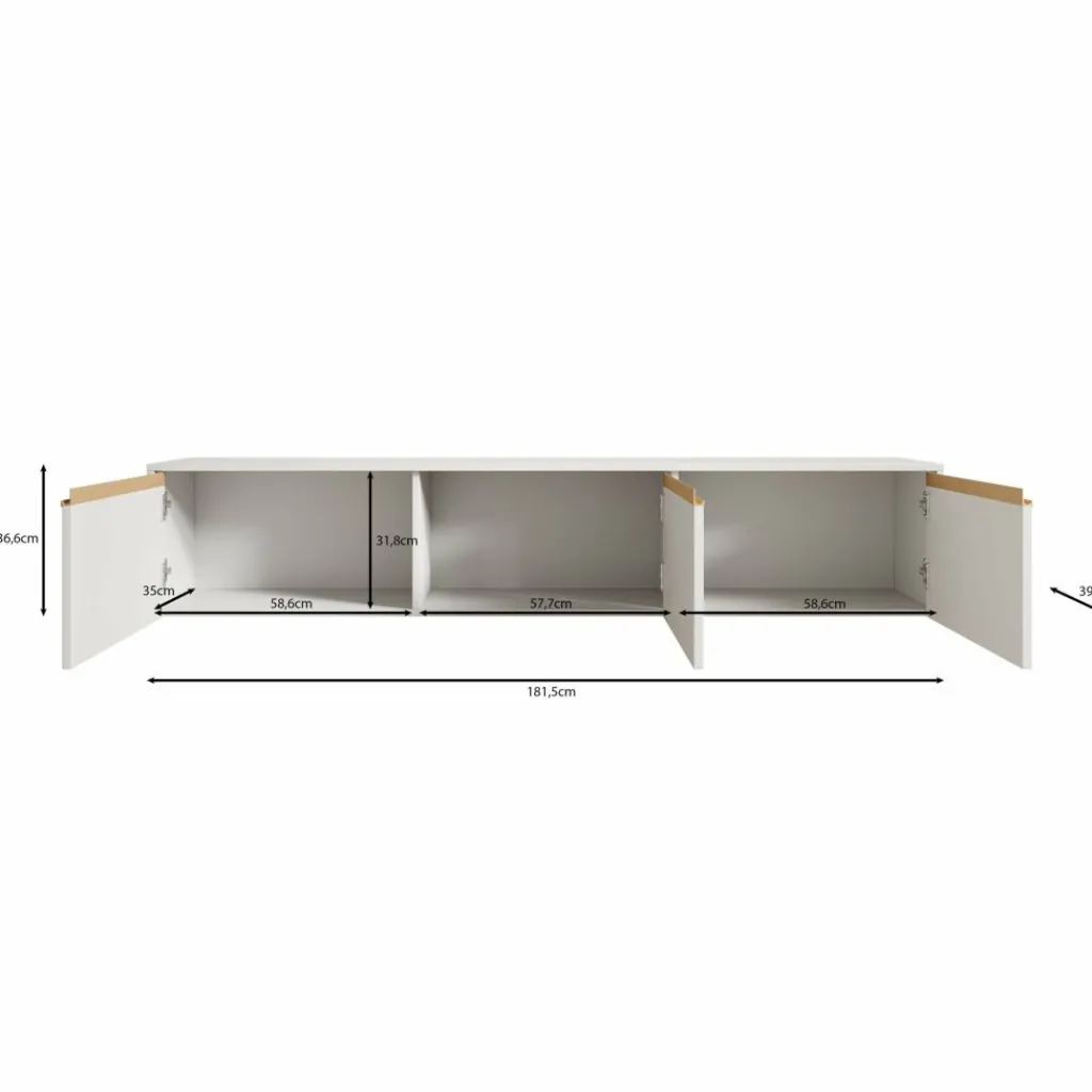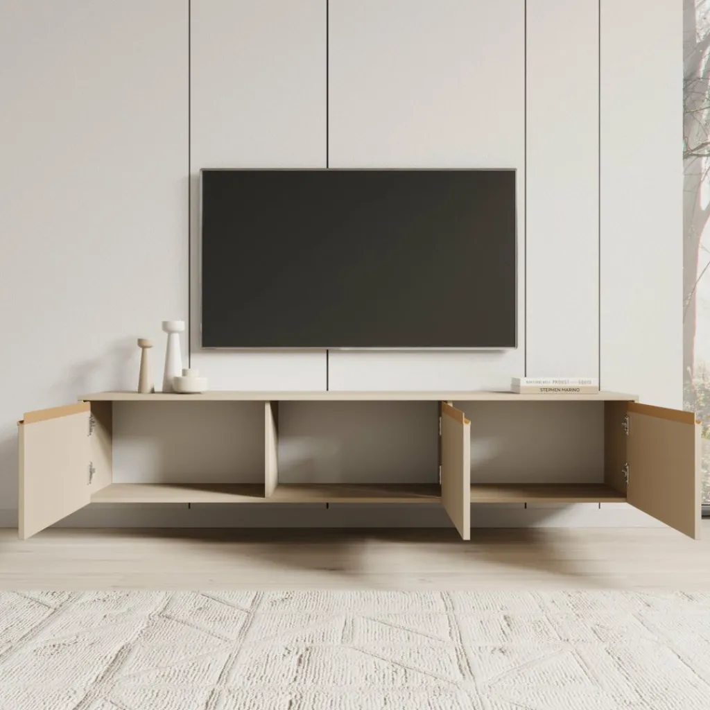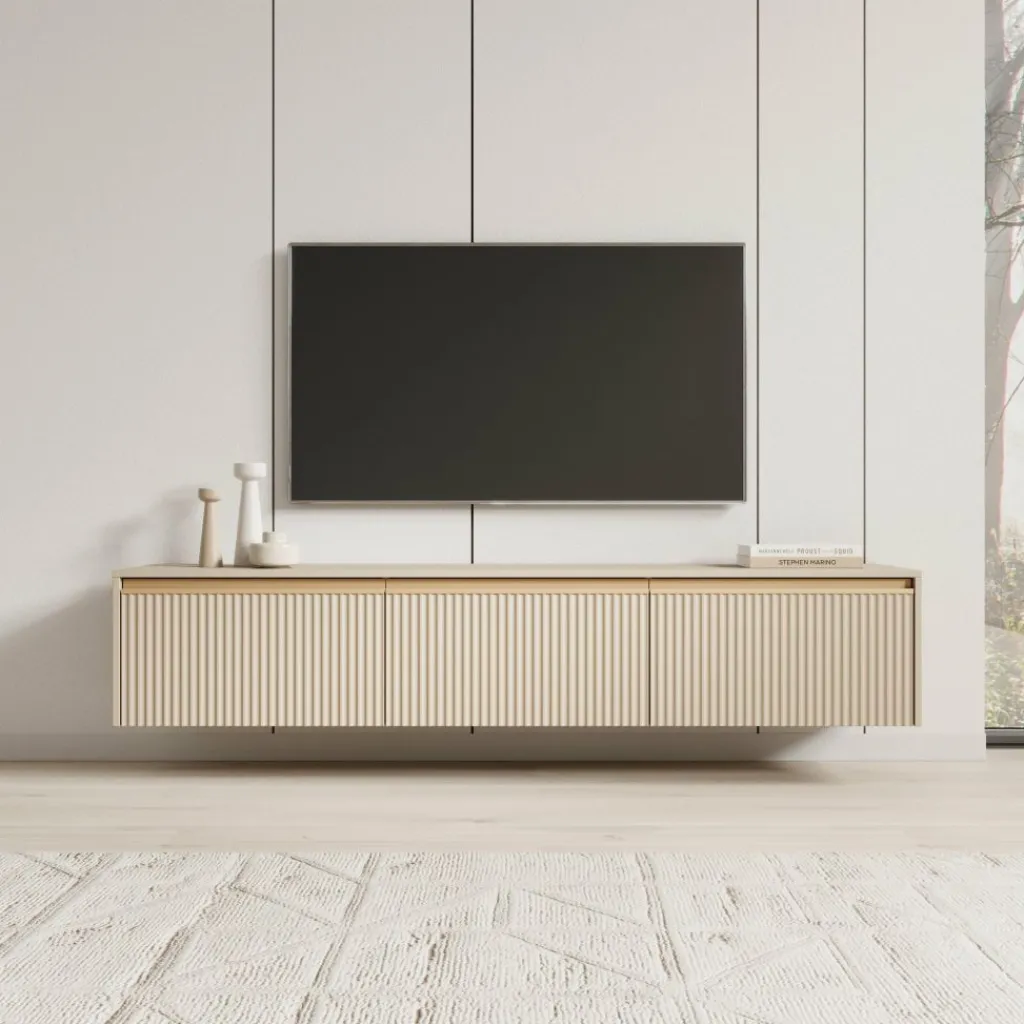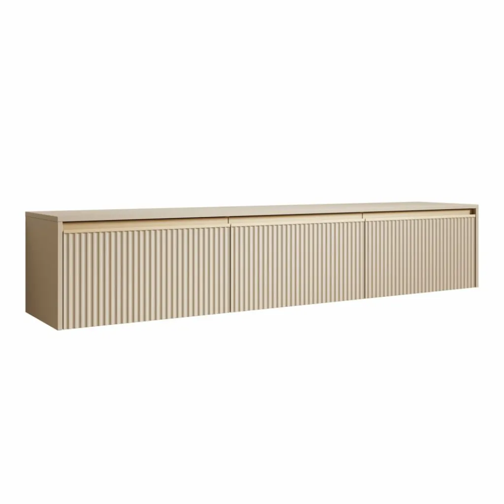 TV-Meubel Remy is een opbergkast voor onder de tv in een moderne stijl. De TV-kast is gemaakt in een beige kleur. TV-Meubel Remy beschikt over 3 deuren waarachter in totaal 3 opbergvakken zitten. De voorkant van deze deuren hebben een latten patroon. Tijdens het monteren heb je de keuze om het meubel hangend of staand te monteren. In de achterwand zit geen uitsparing voor bedrading.