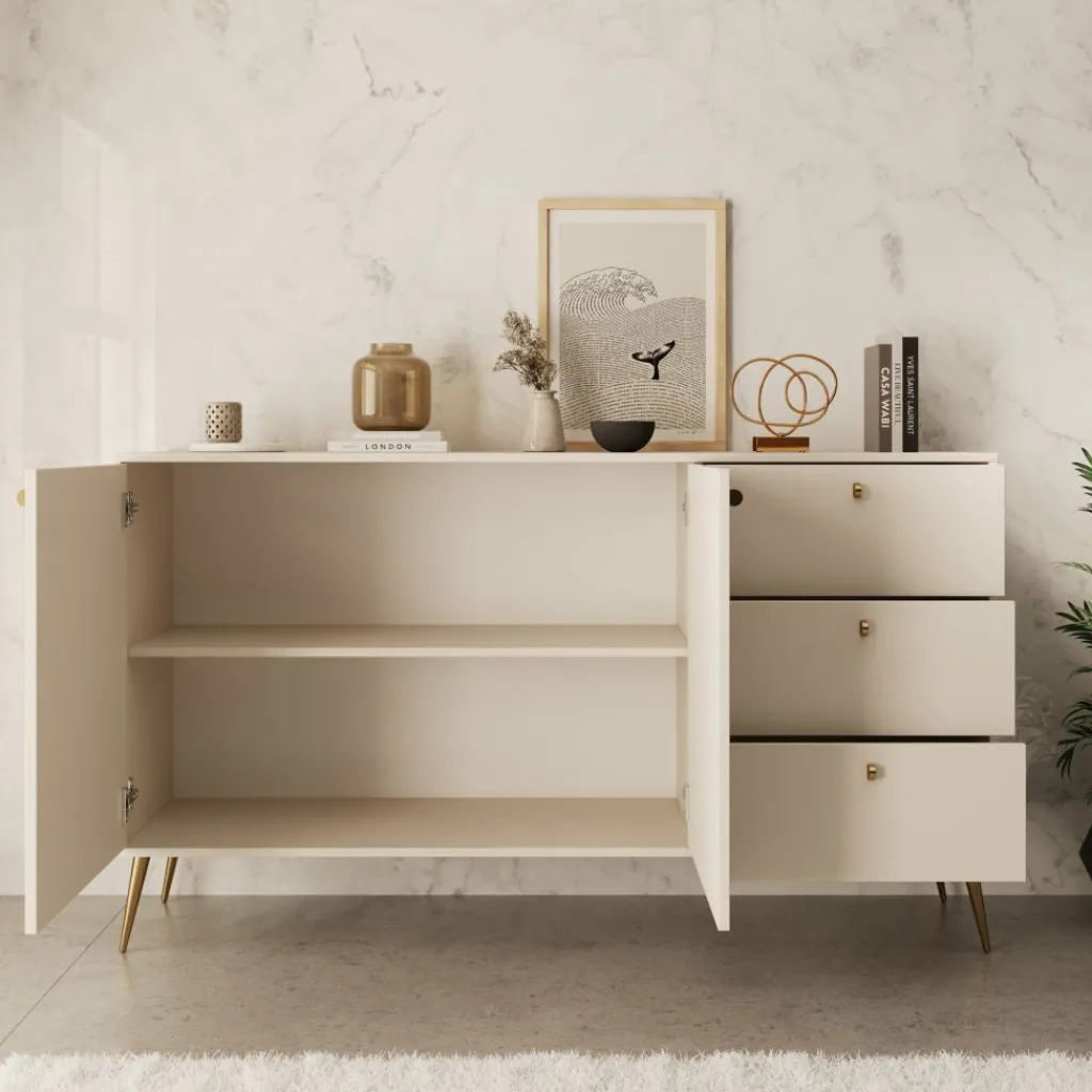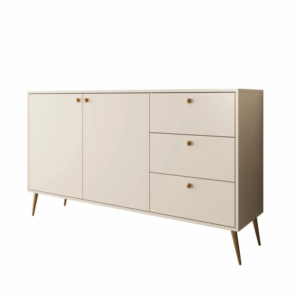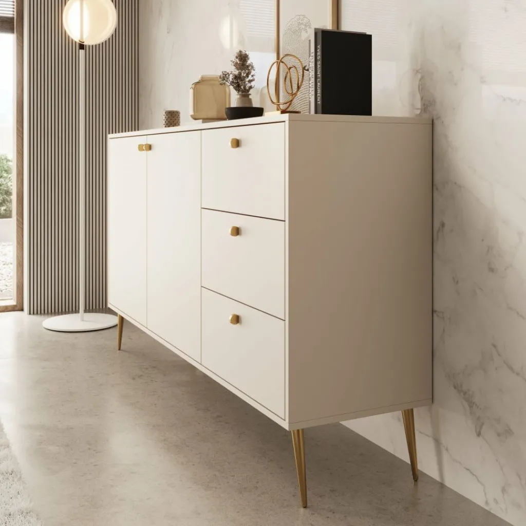 Het Reunion dressoir in beige straalt moderne elegantie uit en voegt een rustige, chique sfeer toe aan je interieur. Het minimalistische ontwerp wordt stijlvol aangevuld met de slanke gouden pootjes en knopjes, waardoor het dressoir een verfijnde uitstraling krijgt.