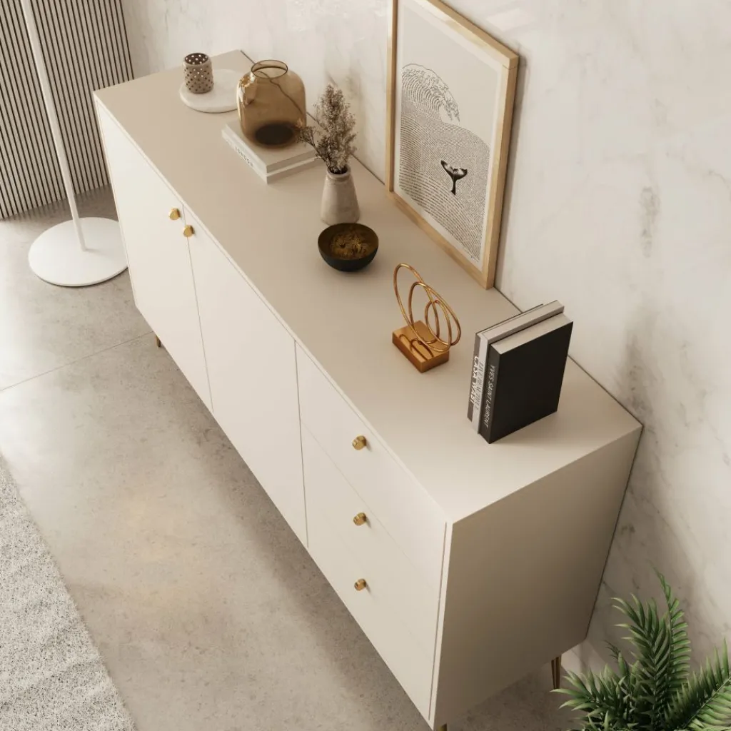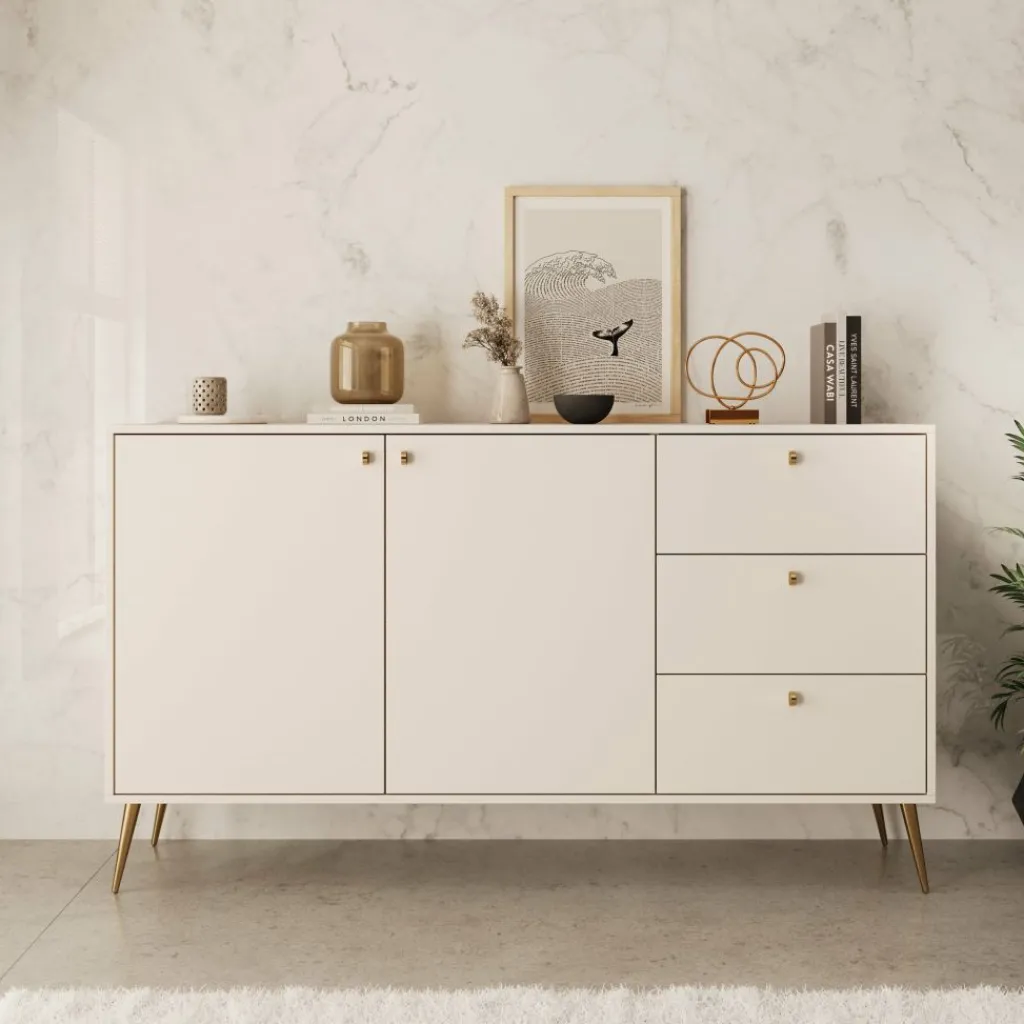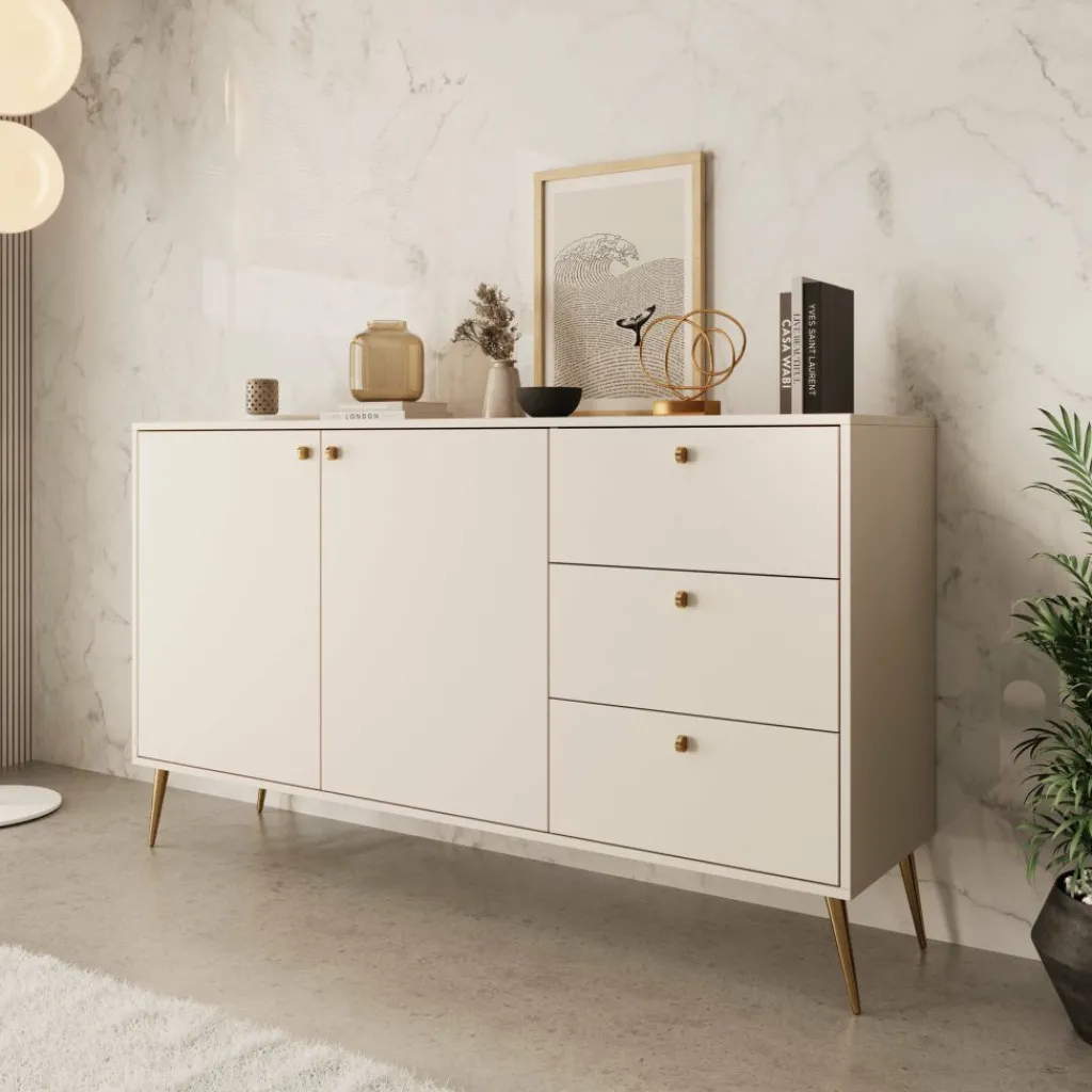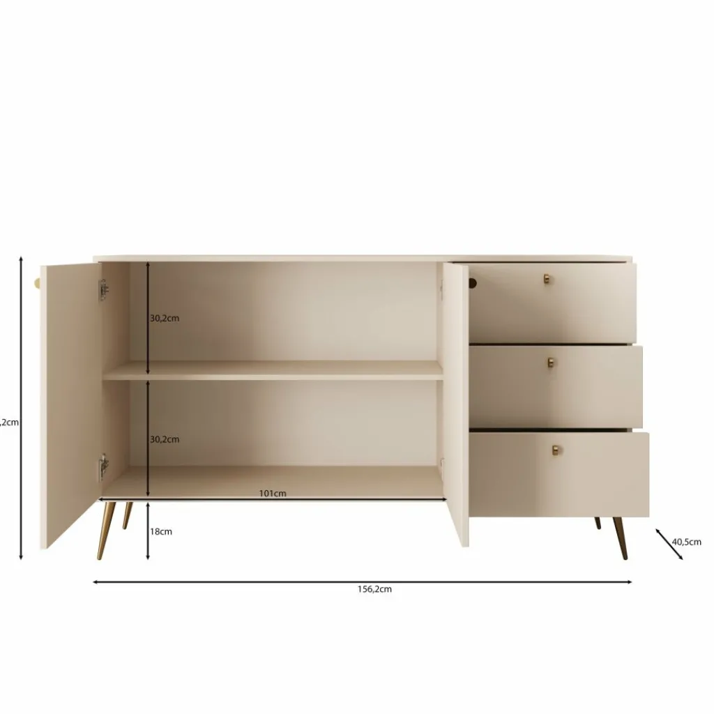 Het Reunion dressoir in beige straalt moderne elegantie uit en voegt een rustige, chique sfeer toe aan je interieur. Het minimalistische ontwerp wordt stijlvol aangevuld met de slanke gouden pootjes en knopjes, waardoor het dressoir een verfijnde uitstraling krijgt.