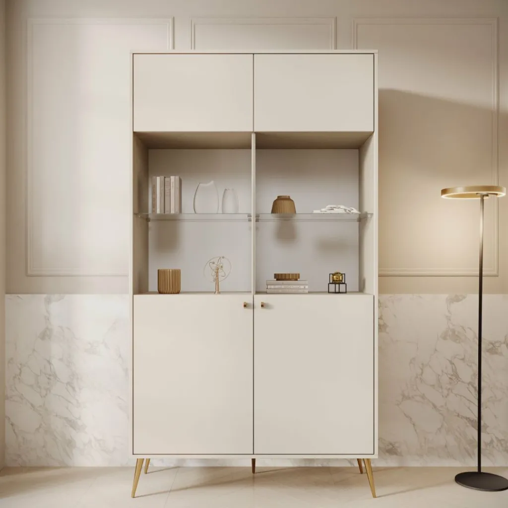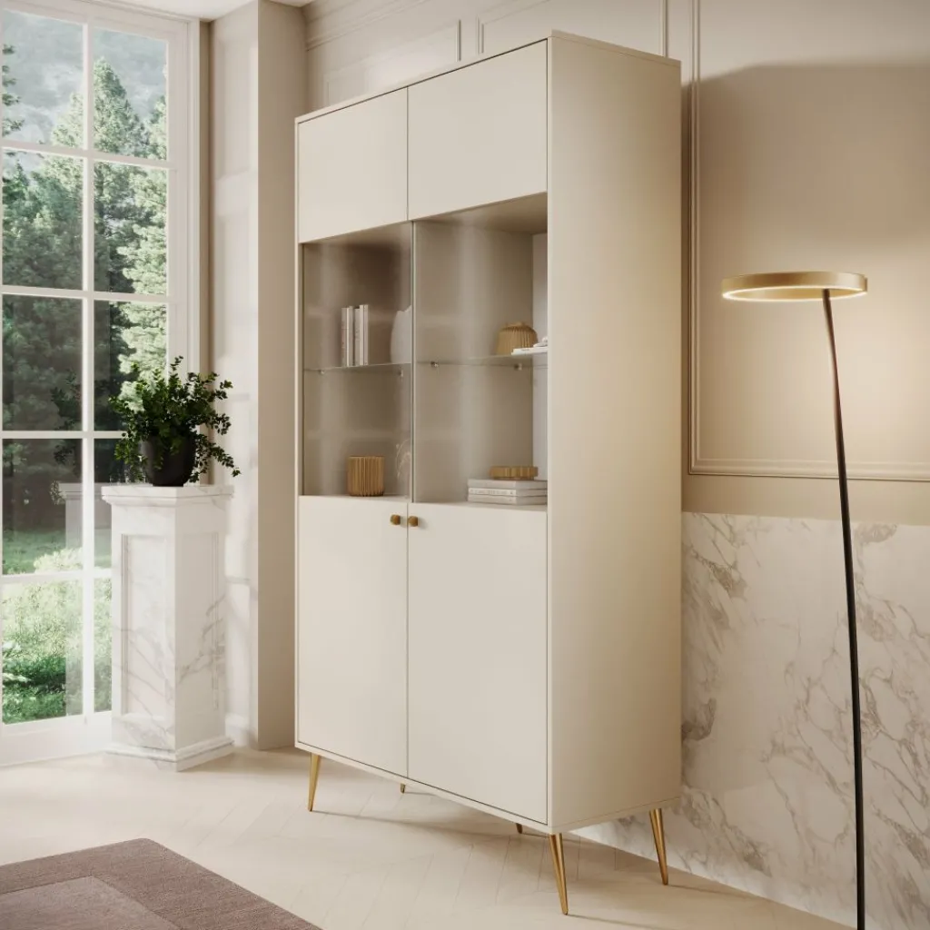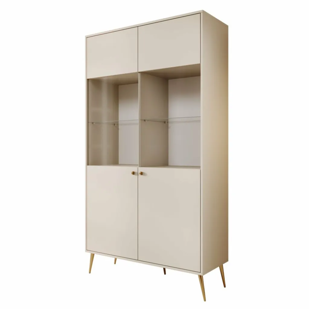 De Reunion vitrinekast in beige combineert stijl en functionaliteit in een elegant ontwerp. De kast biedt volop ruimte voor servies, boeken of decoratieve items en maakt ze dankzij de glazen deuren mooi zichtbaar. De goudkleurige accenten en slanke poten geven de kast een chique uitstraling die perfect past in een modern of luxueus interieur.