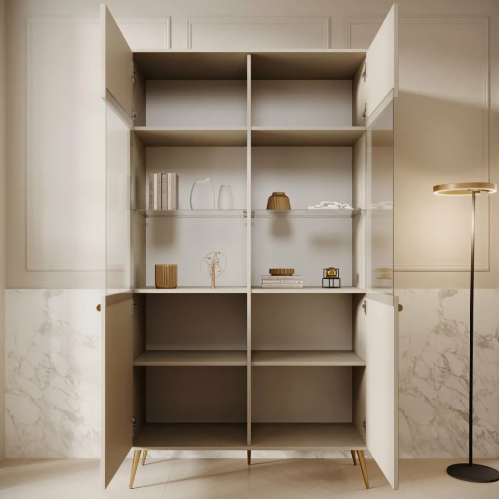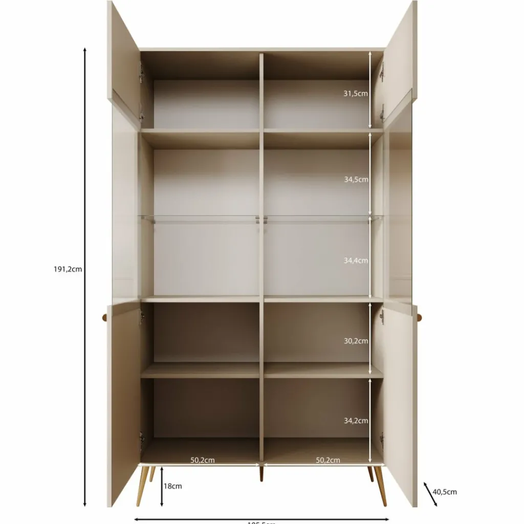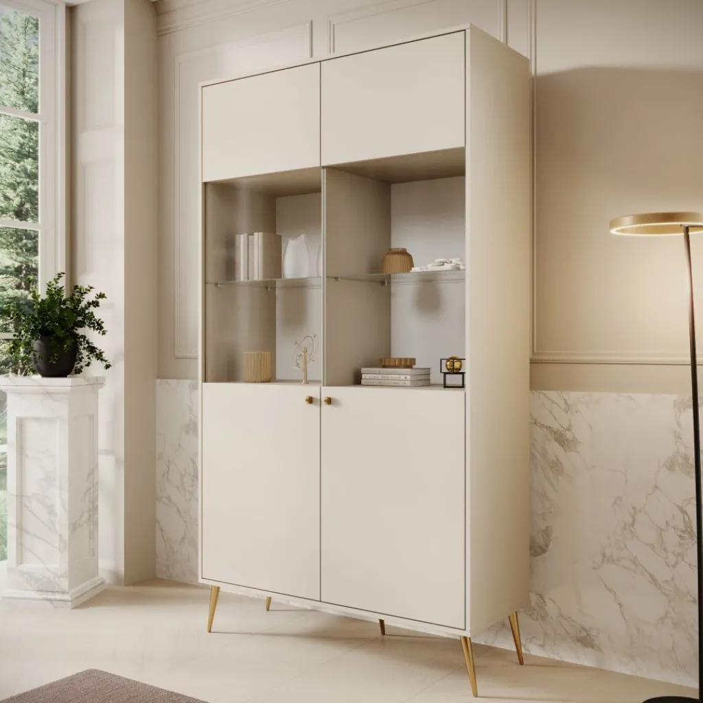 De Reunion vitrinekast in beige combineert stijl en functionaliteit in een elegant ontwerp. De kast biedt volop ruimte voor servies, boeken of decoratieve items en maakt ze dankzij de glazen deuren mooi zichtbaar. De goudkleurige accenten en slanke poten geven de kast een chique uitstraling die perfect past in een modern of luxueus interieur.