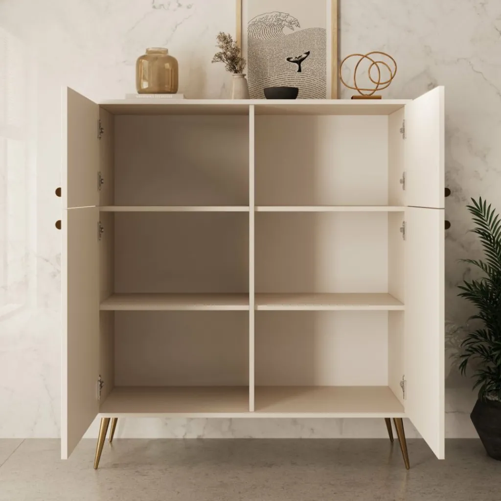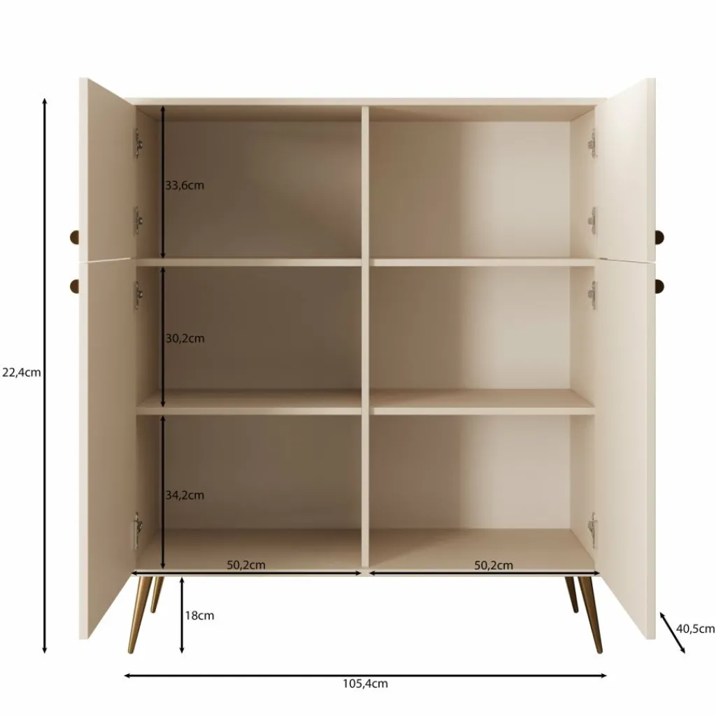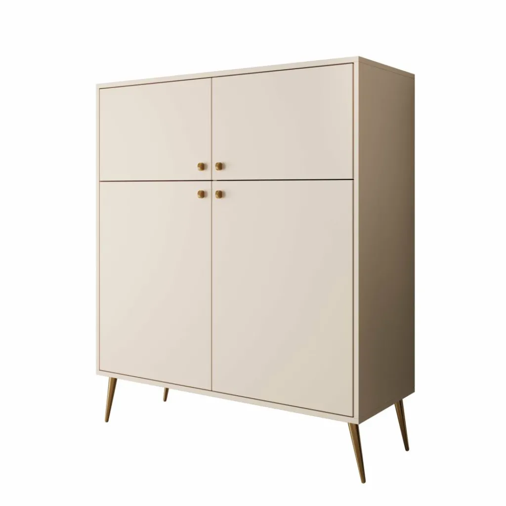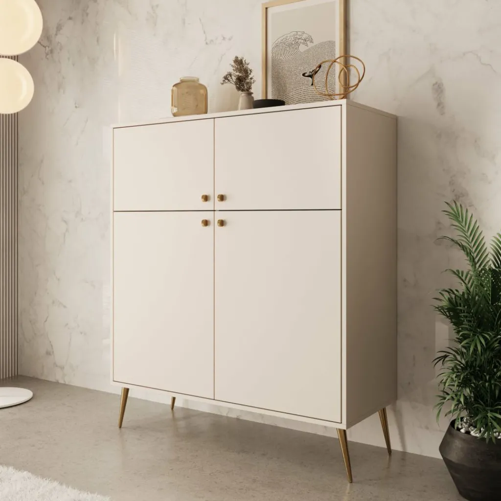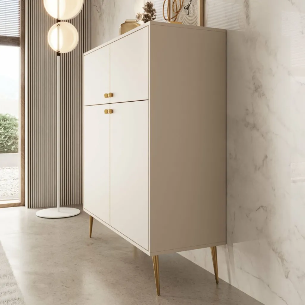 Het Reunion dressoir in beige combineert functionaliteit met een verfijnde uitstraling. Het strakke ontwerp wordt versterkt door de slanke gouden pootjes en subtiele knoppen, wat zorgt voor een chique en moderne uitstraling.