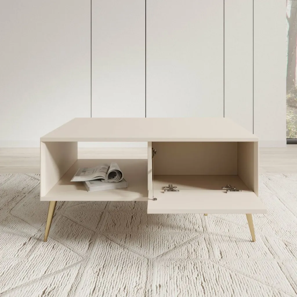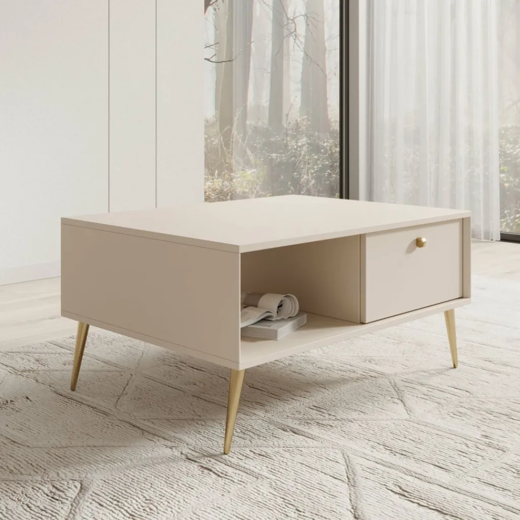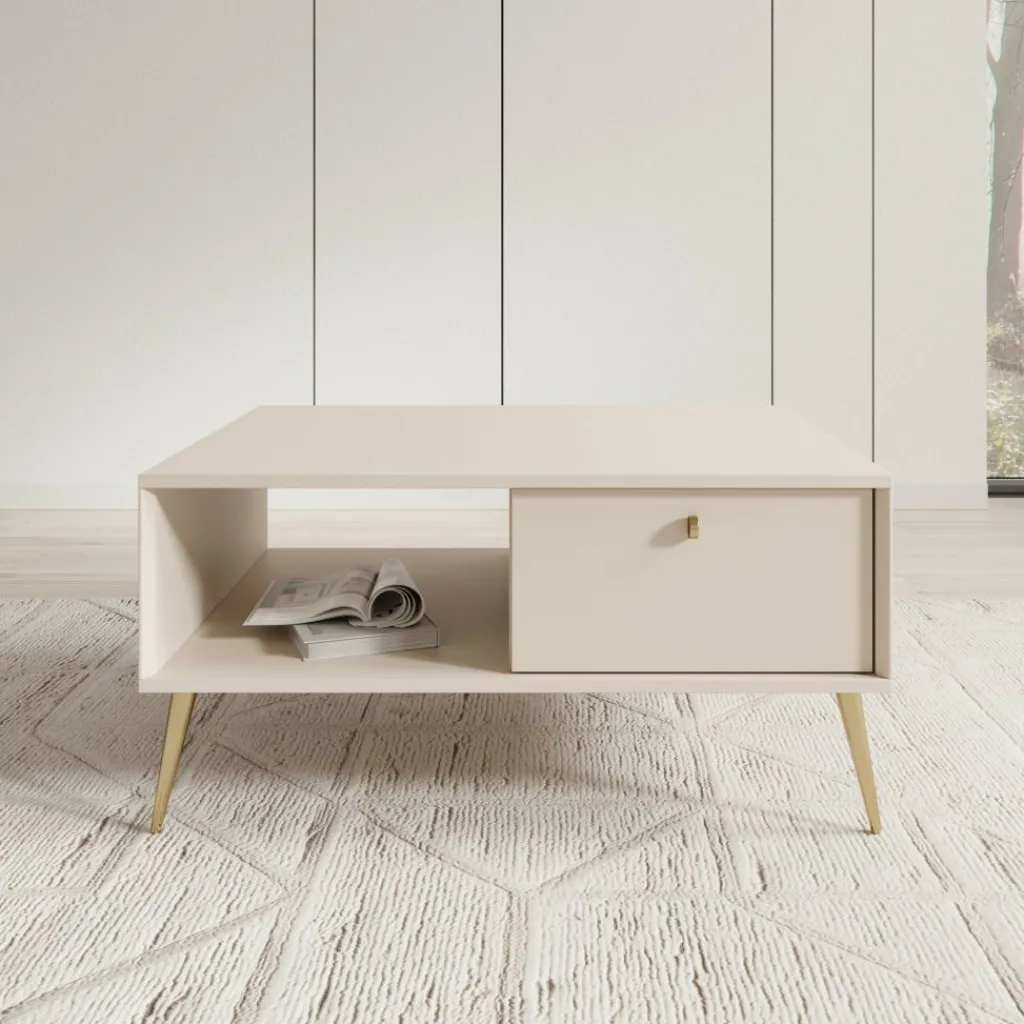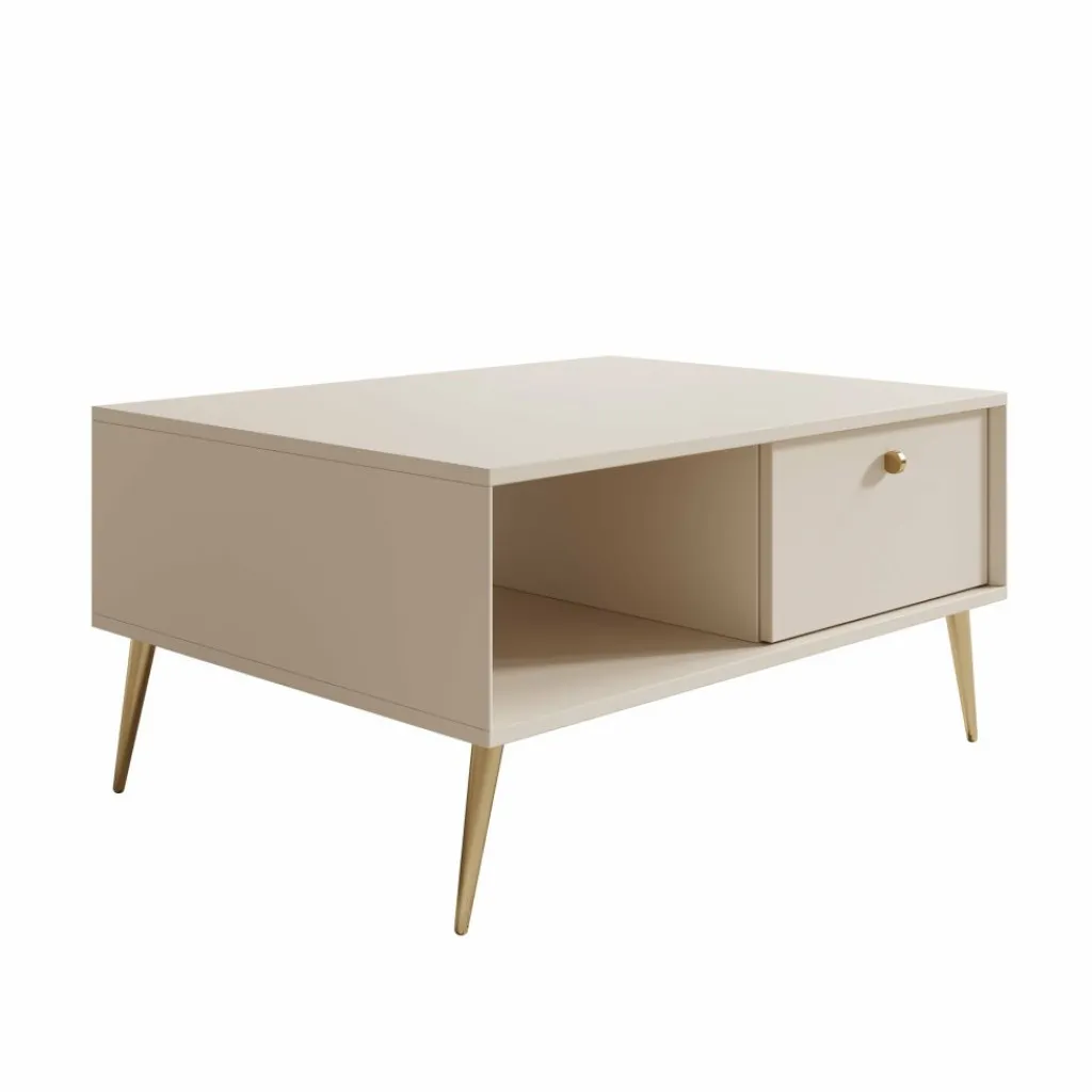 De Reunion salontafel in beige brengt een rustige en stijlvolle sfeer in je woonkamer. Het minimalistische ontwerp wordt gecombineerd met verfijnde details, zoals slanke gouden poten en een subtiele lade met ronde knop, wat zorgt voor een elegante uitstraling.