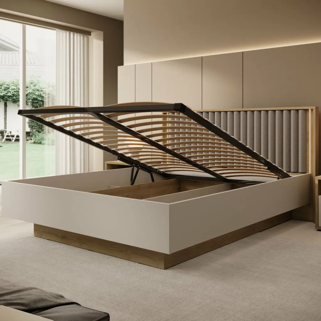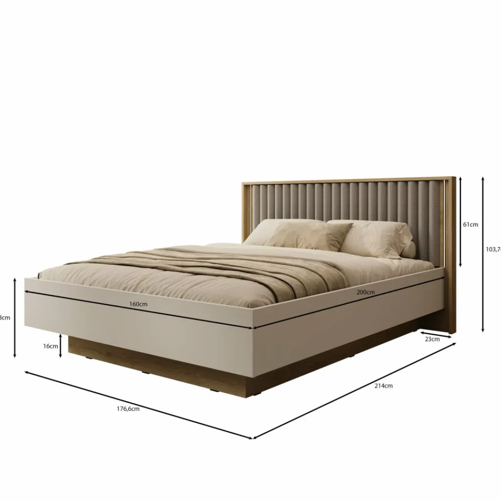 Tweepersoonsbed Riggs is een bed geschikt voor matrasmaat 160×200 cm. Het meubel is gemaakt van stevig spaanplaat in de kleur beige. Het hoofdbord is bezet met een grijze stof en beschikt over verlichting aan de zijkanten. Het bed wordt geleverd zonder matras. De lattenbodem is wel inbegrepen. Deze lattenbodem beschikt over een gasliftsysteem. Hierdoor kan je de bodem omhoog kantelen zodat er opbergruimte ontstaat. Handig voor bijvoorbeeld kussens, beddengoed of dekens.