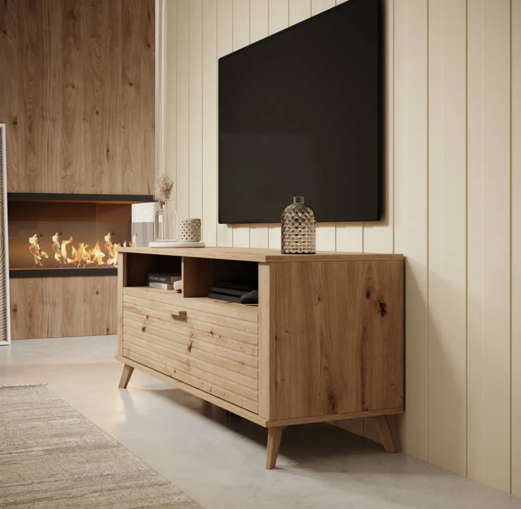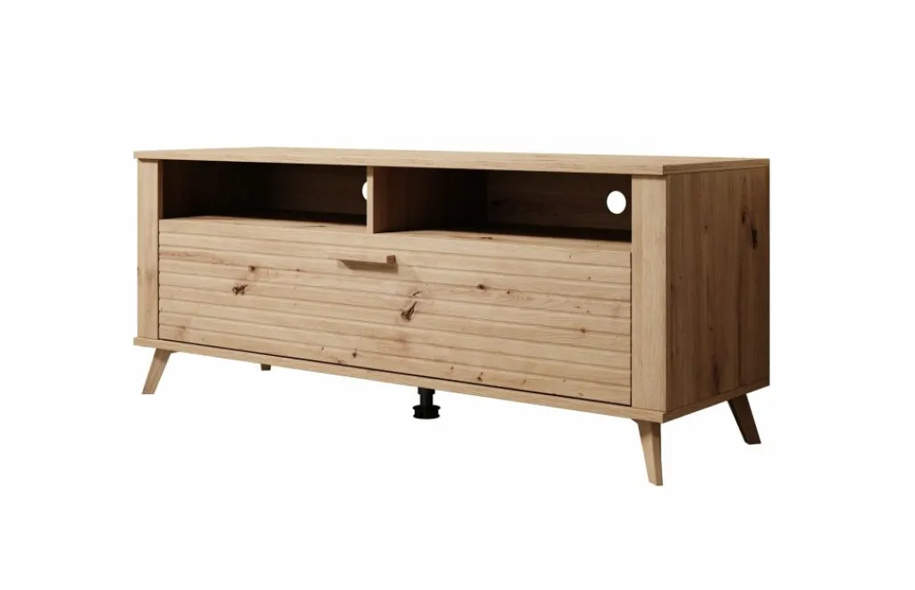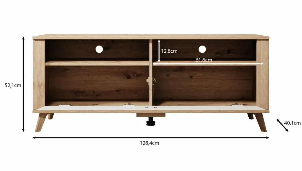 TV-Meubel Ritch is een opbergkast voor onder de tv in een moderne stijl. De TV kast beschikt over 2 open vakken en 1 klep. Deze klep is te openen met een handgreep en hierachter zitten 2 opbergvakken. In de achterwand zitten 2 uitsparingen om eventuele bedrading netjes te kunnen wegwerken. Het meubel is uitgevoerd in een eiken kleur.