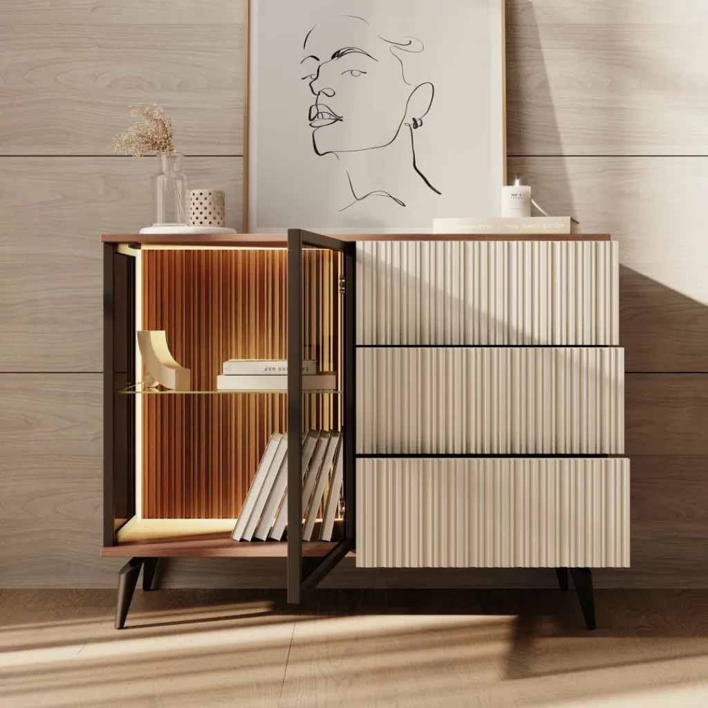 De kast is voorzien van drie lades die veel opbergruimte bieden voor bijvoorbeeld servies, boeken of andere spullen die je graag uit het zicht houdt. Aan de linkerkant vind je een glazen vitrinevak, uitgerust met geïntegreerde LED-verlichting en een glazen legplank. Dit creëert twee overzichtelijke compartimenten van elk 31 cm hoog, perfect voor het uitstallen van decoratie of boeken.