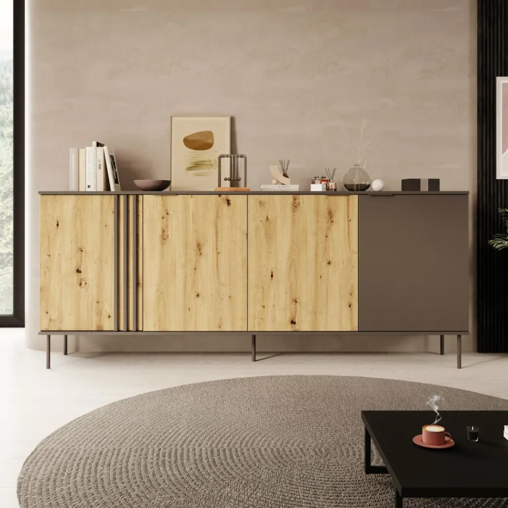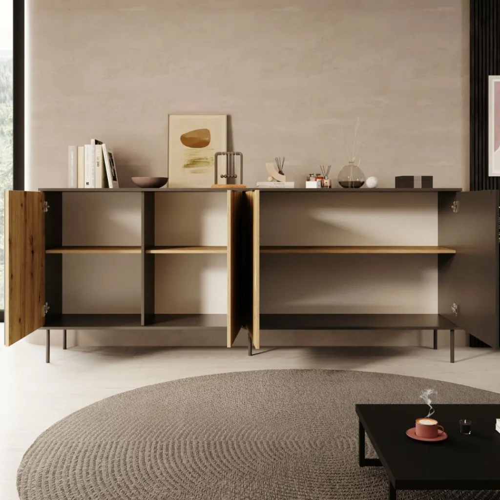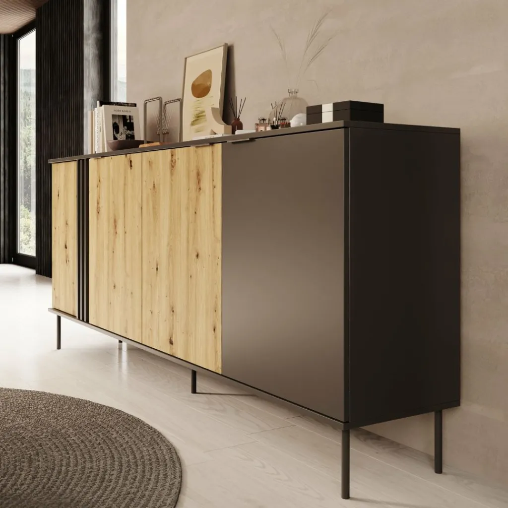 Het Rogan dressoir combineert een strak zwart design met warme houtaccenten, wat zorgt voor een stoere en eigentijdse uitstraling. Met vier ruime deuren biedt dit dressoir volop opbergruimte voor servies, linnengoed of andere spullen die je netjes uit het zicht wilt bewaren.