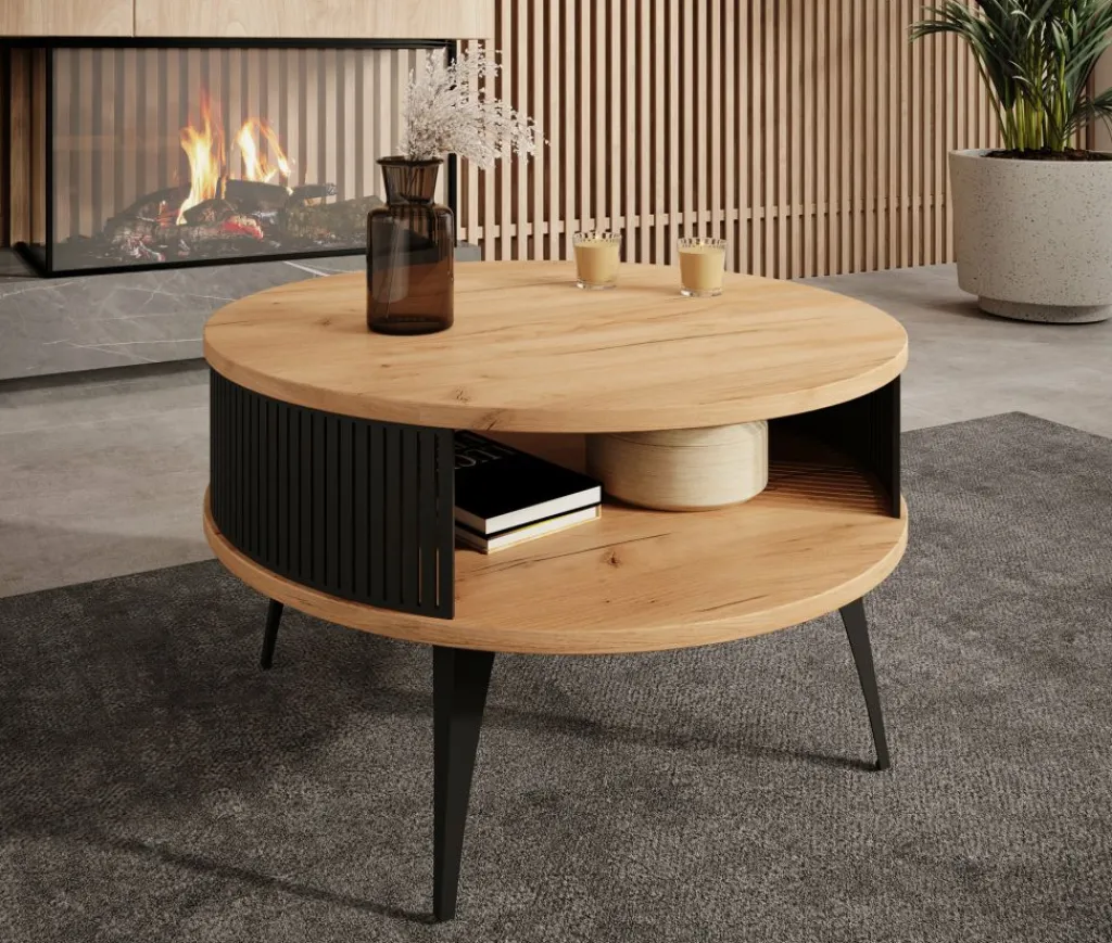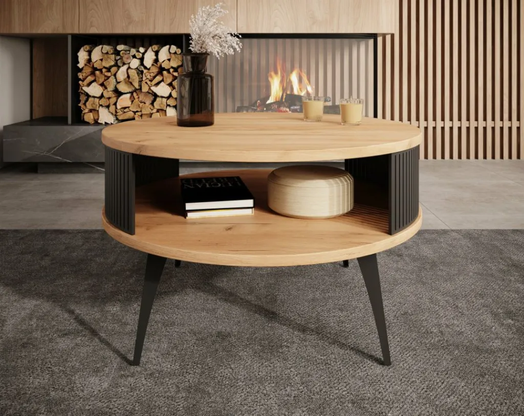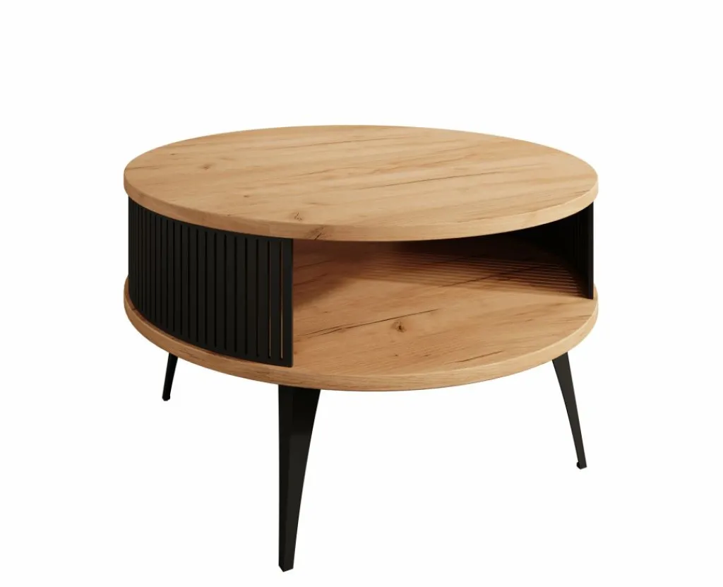 Salontafel Roslyn is een ronde salontafel met een moderne uitstraling. De tafel heeft een diameter van 75 cm en beschikt over een handige opbergplank. Het meubel is uitgevoerd in de kleur eiken met zwart. De zwarte onderdelen zijn gemaakt van metaal.
