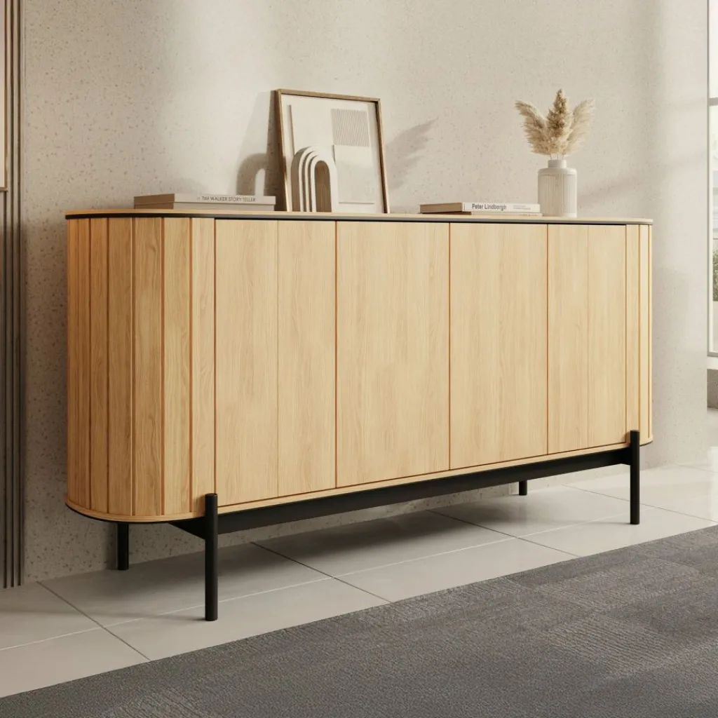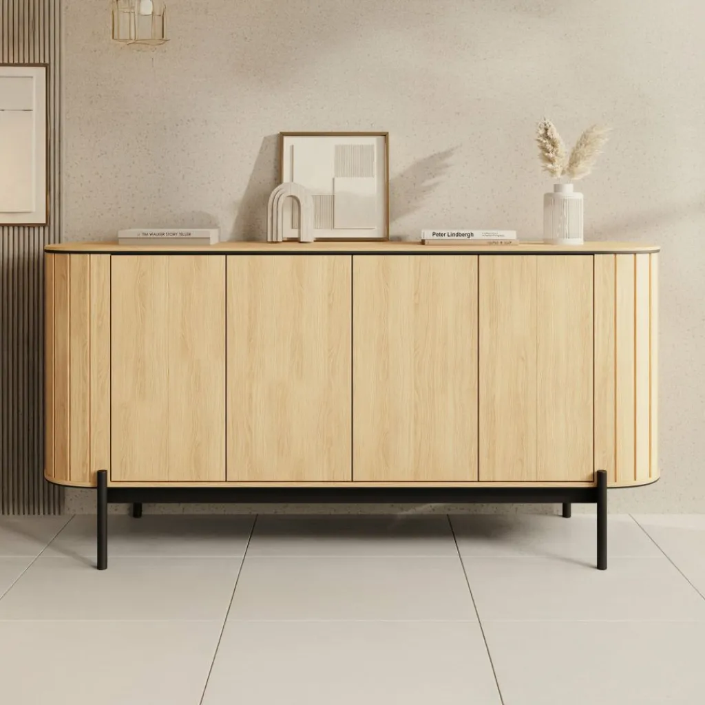 Dressoir Royale is een opbergkast in moderne stijl in een eiken kleur. Het ronde design geeft het meubel een speelse en elegante uitstraling. De kast heeft 4 deuren die openen met het push to open systeem. Hierachter zitten 6 opbergvakken. De Royale staat op een metalen onderstel in de kleur zwart.