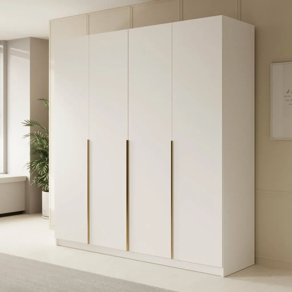 De Sabre is afgewerkt in een frisse witte kleur met opvallende, goudkleurige handgrepen die zorgen voor een hotelchique accent. Dankzij de hoogte van 215 cm benut je ook de verticale ruimte optimaal.