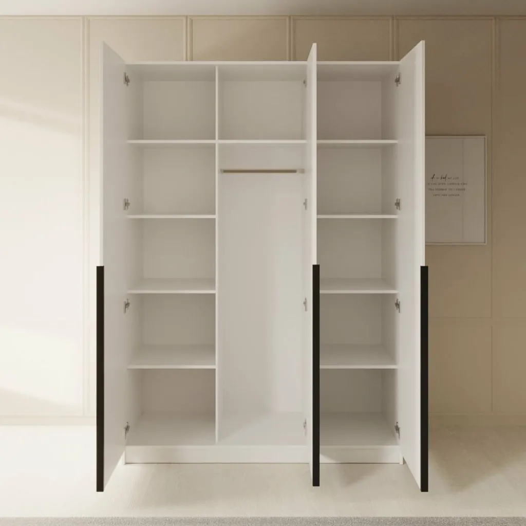 Met een afmeting van 150 cm breed, 215 cm hoog en 58 cm diep biedt deze kast volop ruimte voor al je kleding en accessoires. Achter de drie draaideuren vind je een praktische indeling met ruime kledingroedes voor het ophangen van kleding en legplanken voor het opbergen van bijvoorbeeld beddengoed, tassen of schoenen.