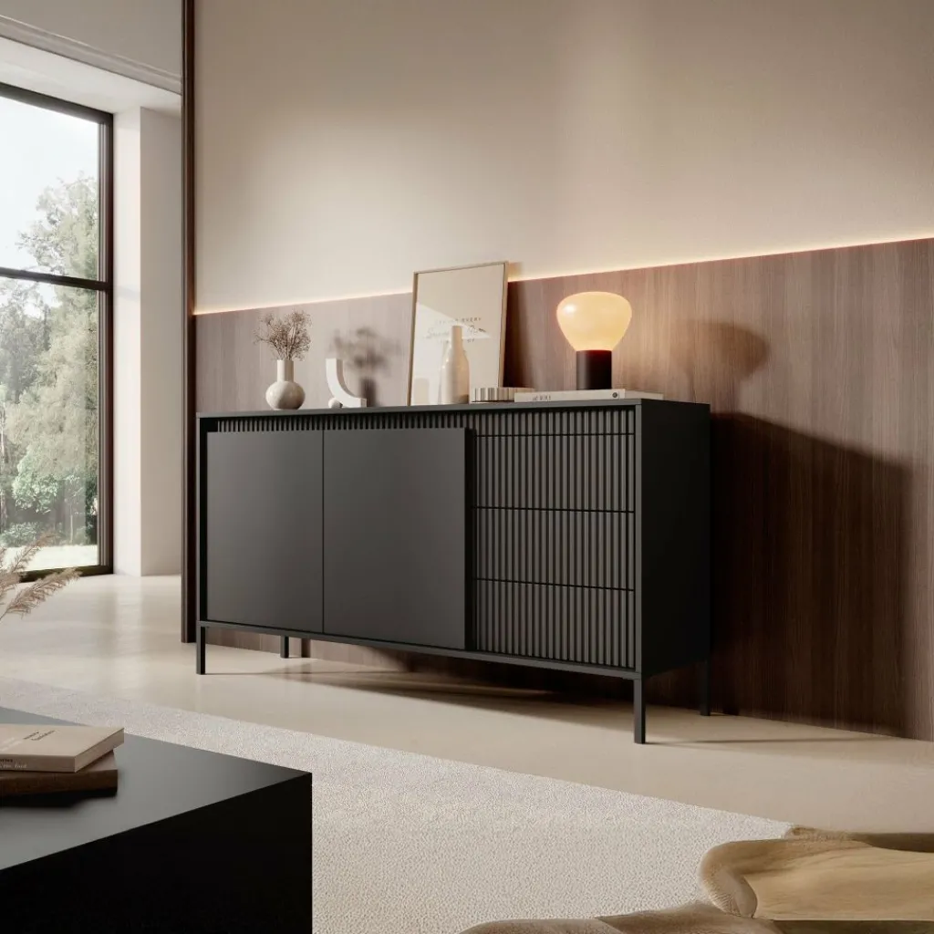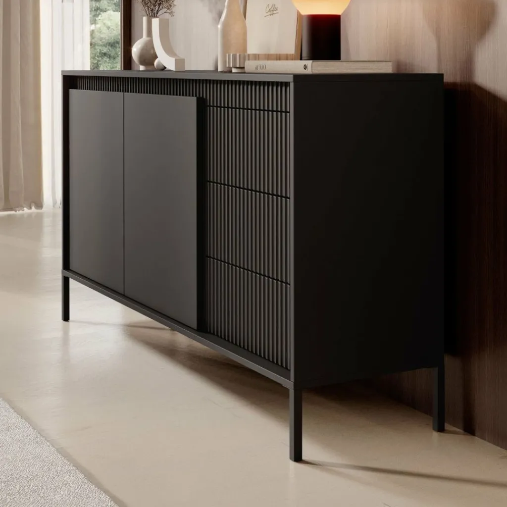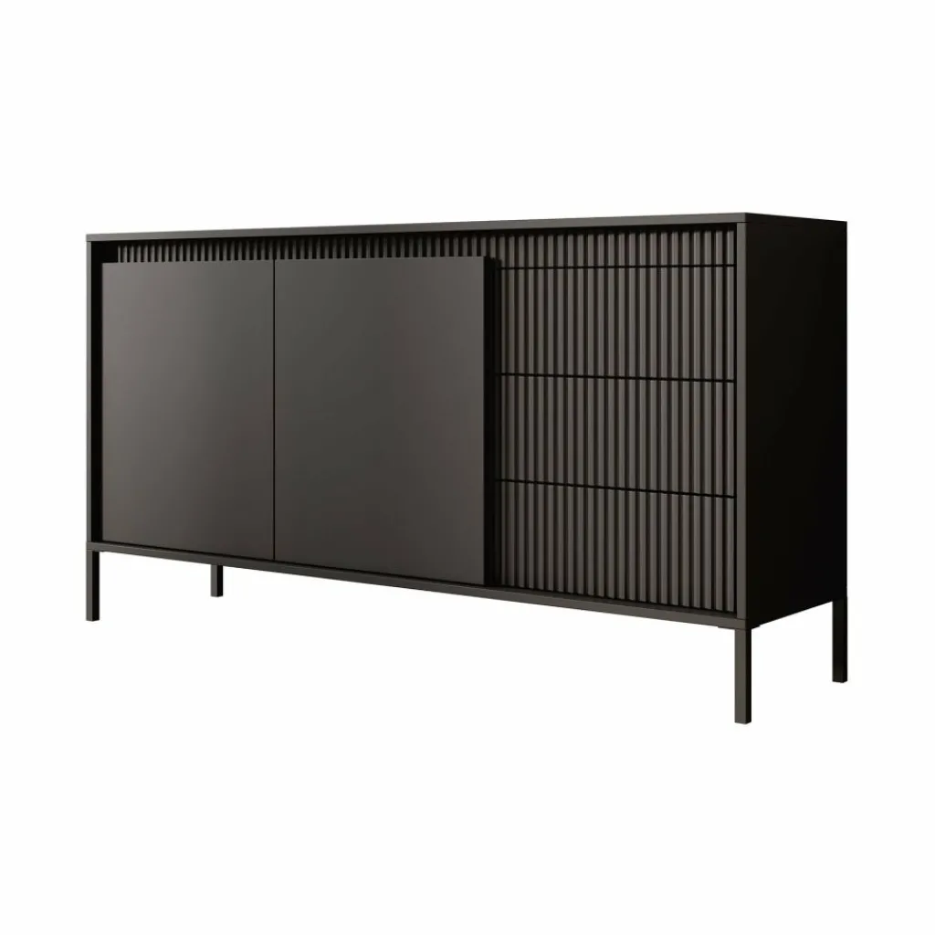 De kast heeft 2 greeploze deuren en 3 lades. Op de voorkant zit een latten patroon. Achter de deuren bevinden zich 4 opbergvakken. Het dressoir staat op hoge, zwarte pootjes.