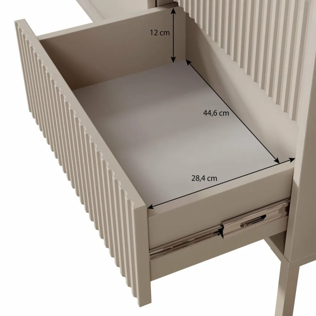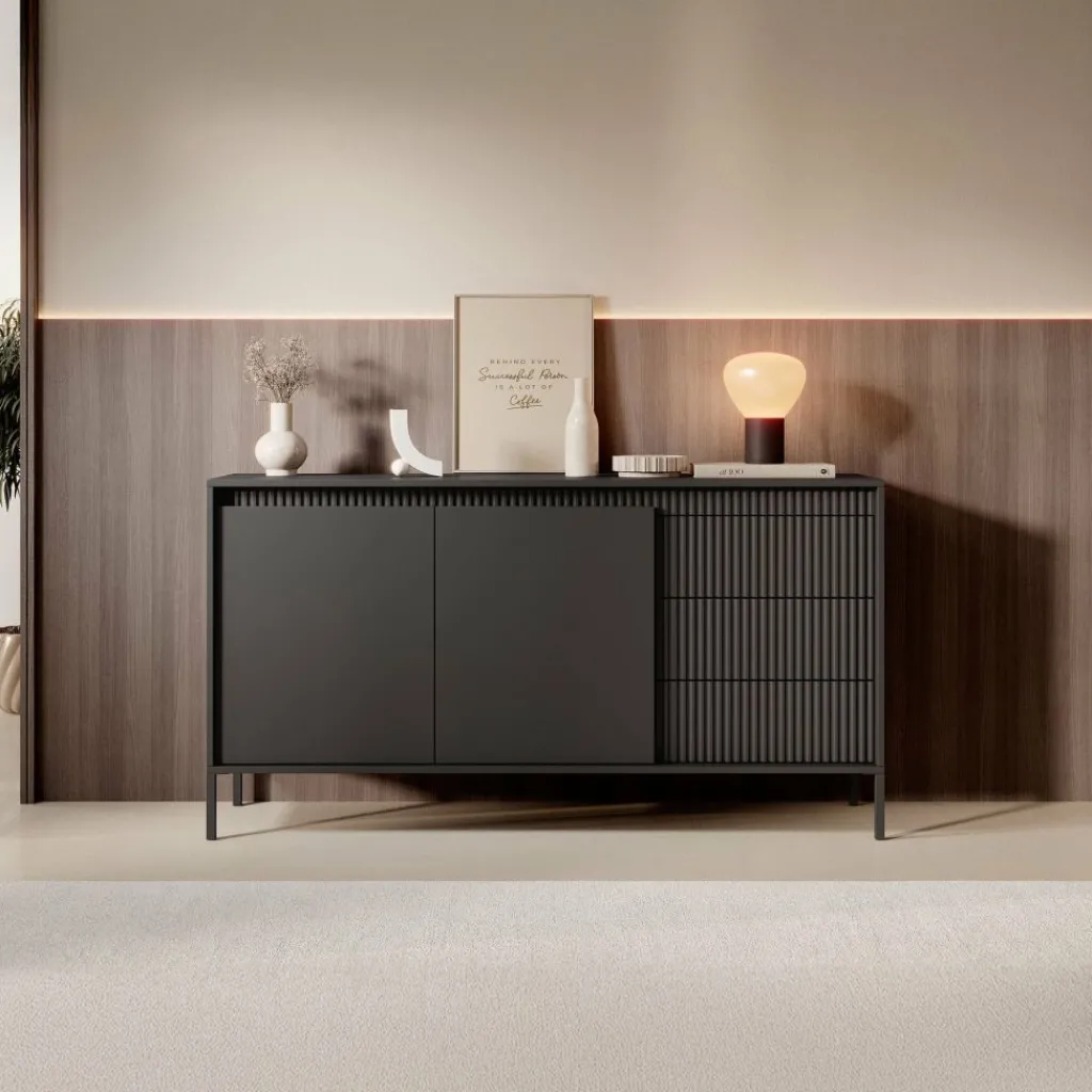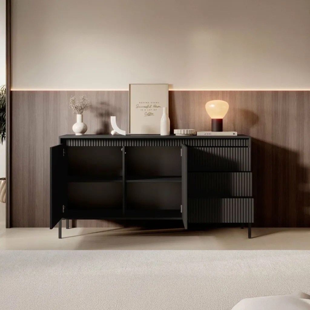 De kast heeft 2 greeploze deuren en 3 lades. Op de voorkant zit een latten patroon. Achter de deuren bevinden zich 4 opbergvakken. Het dressoir staat op hoge, zwarte pootjes.