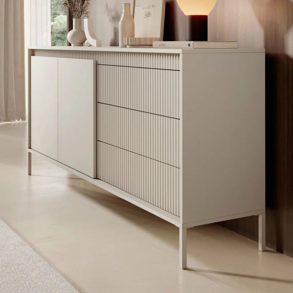 De kast heeft 2 greeploze deuren en 3 lades. Op de voorkant zit een latten patroon. Achter de deuren bevinden zich 4 opbergvakken. Het dressoir staat op hoge, beige pootjes.
