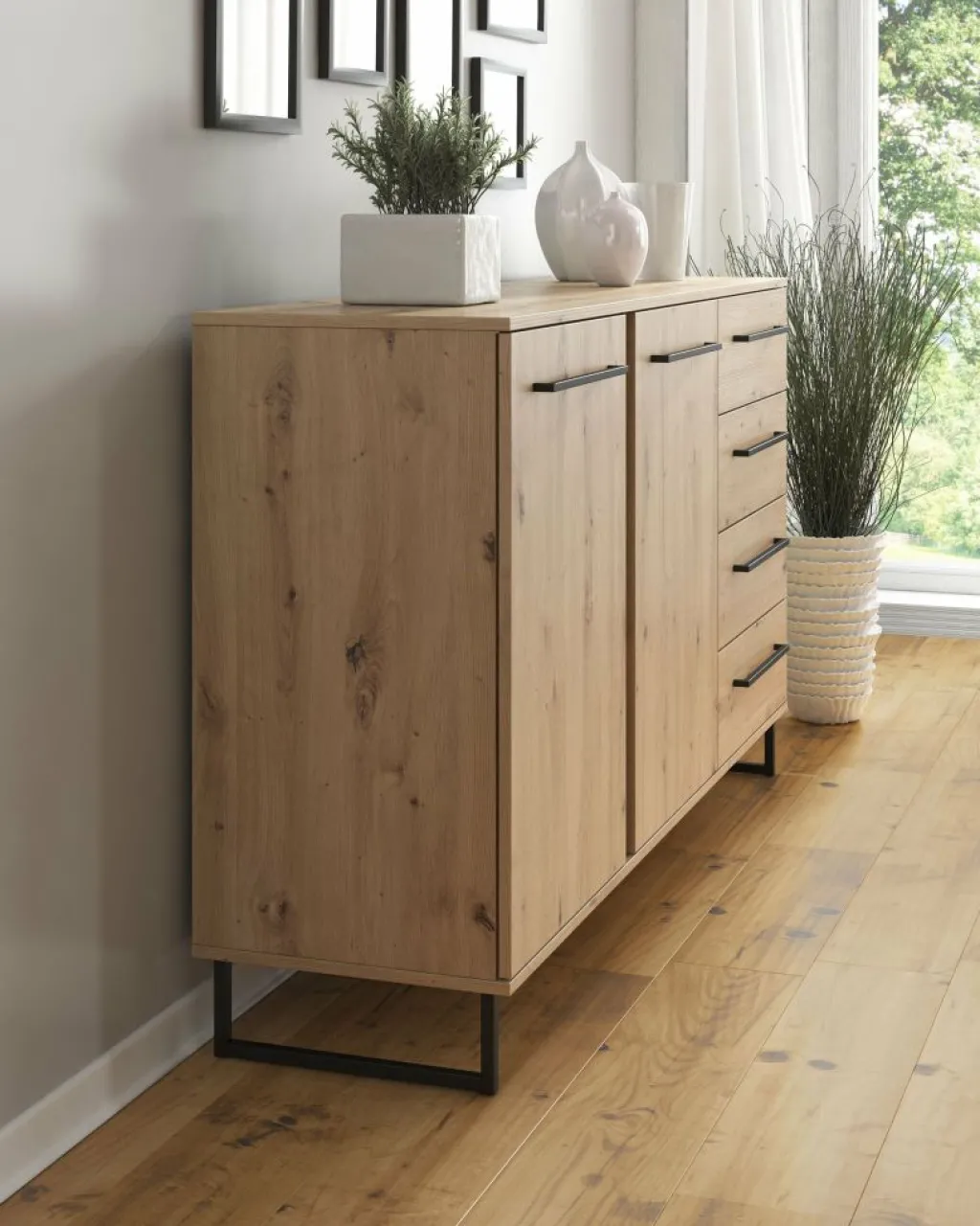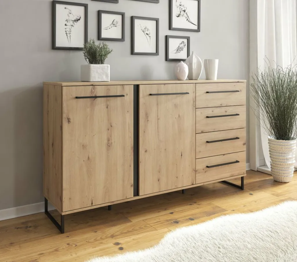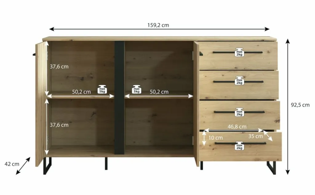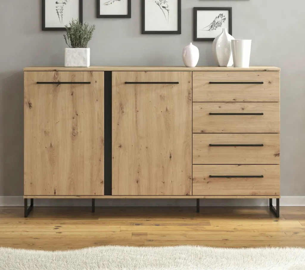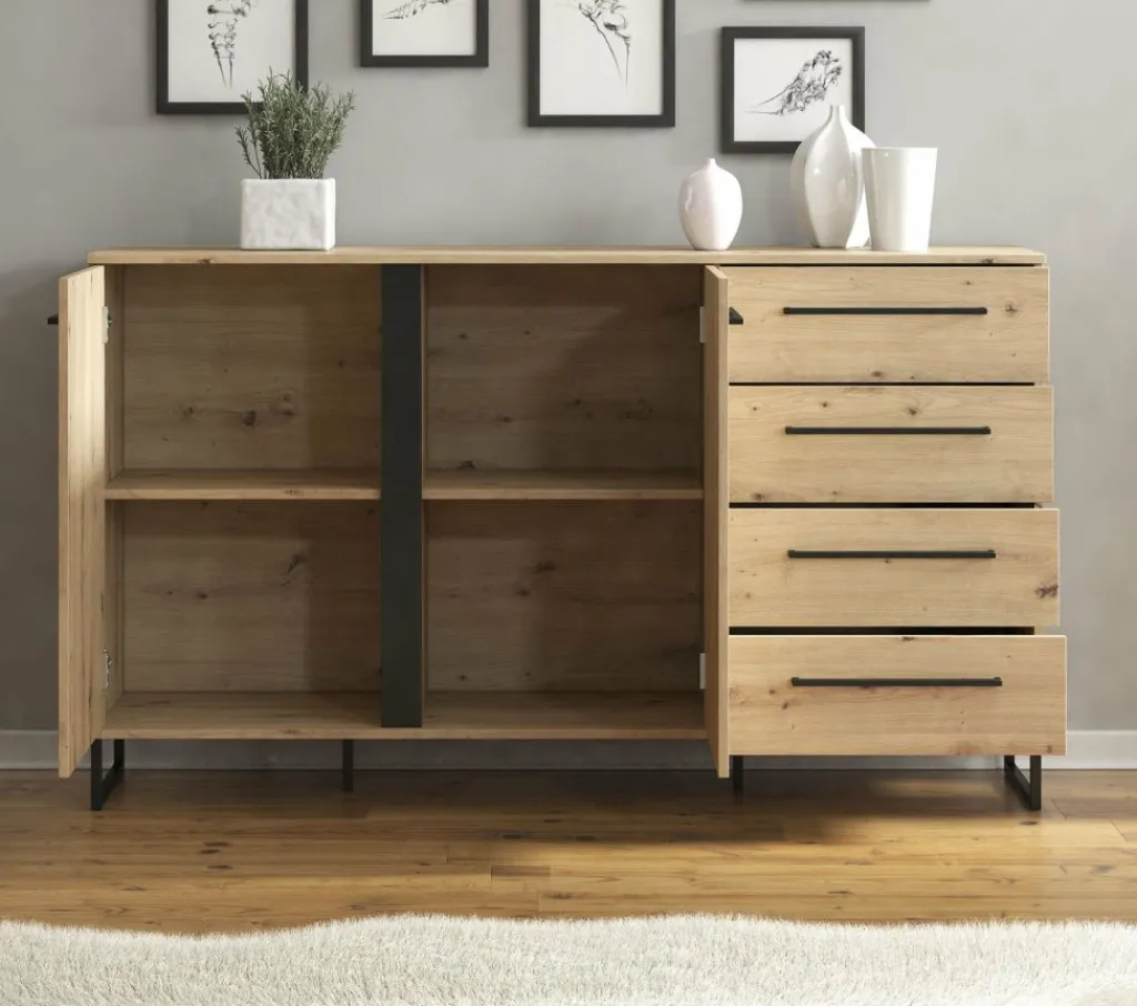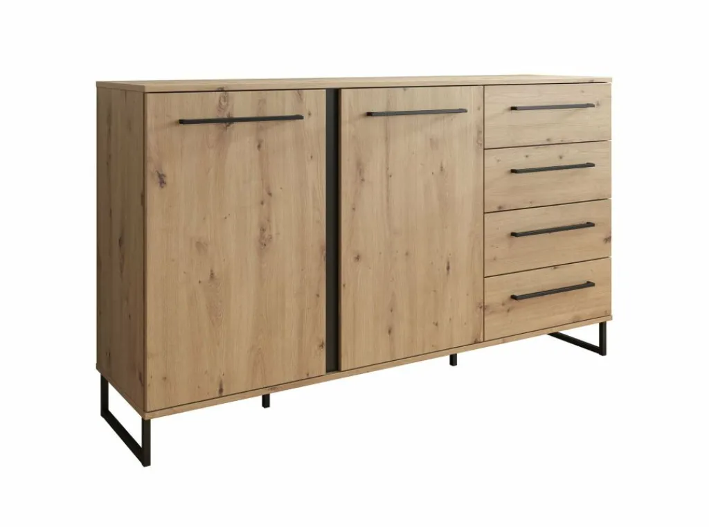 Dressoir Saturn is een stijlvolle kast uitgevoerd in eiken met zwarte details. Het dressoir heeft vier lades en twee deuren, met daarachter vier opbergvakken, wat veel opbergmogelijkheden geeft. Dit is te openen met de brede, zwarte handvaten.