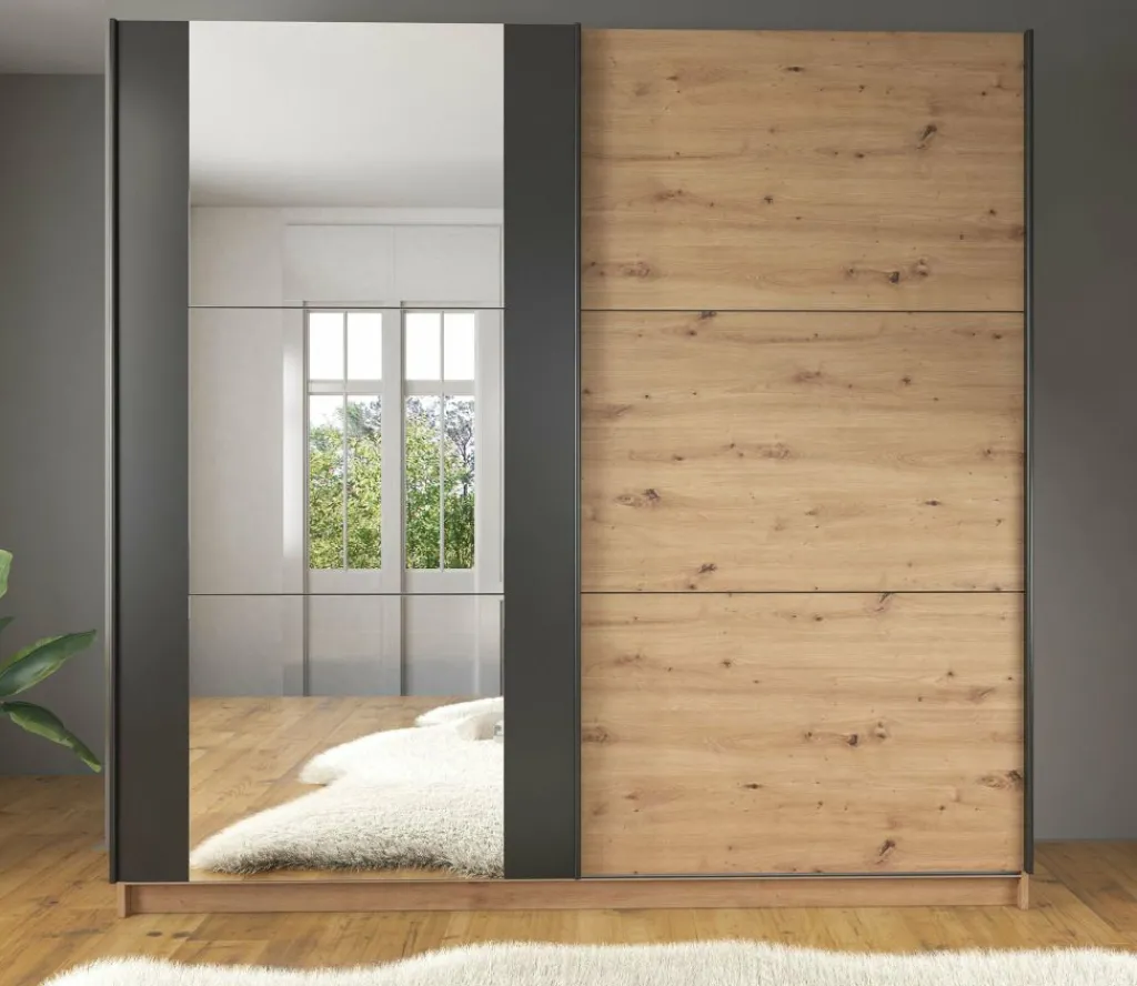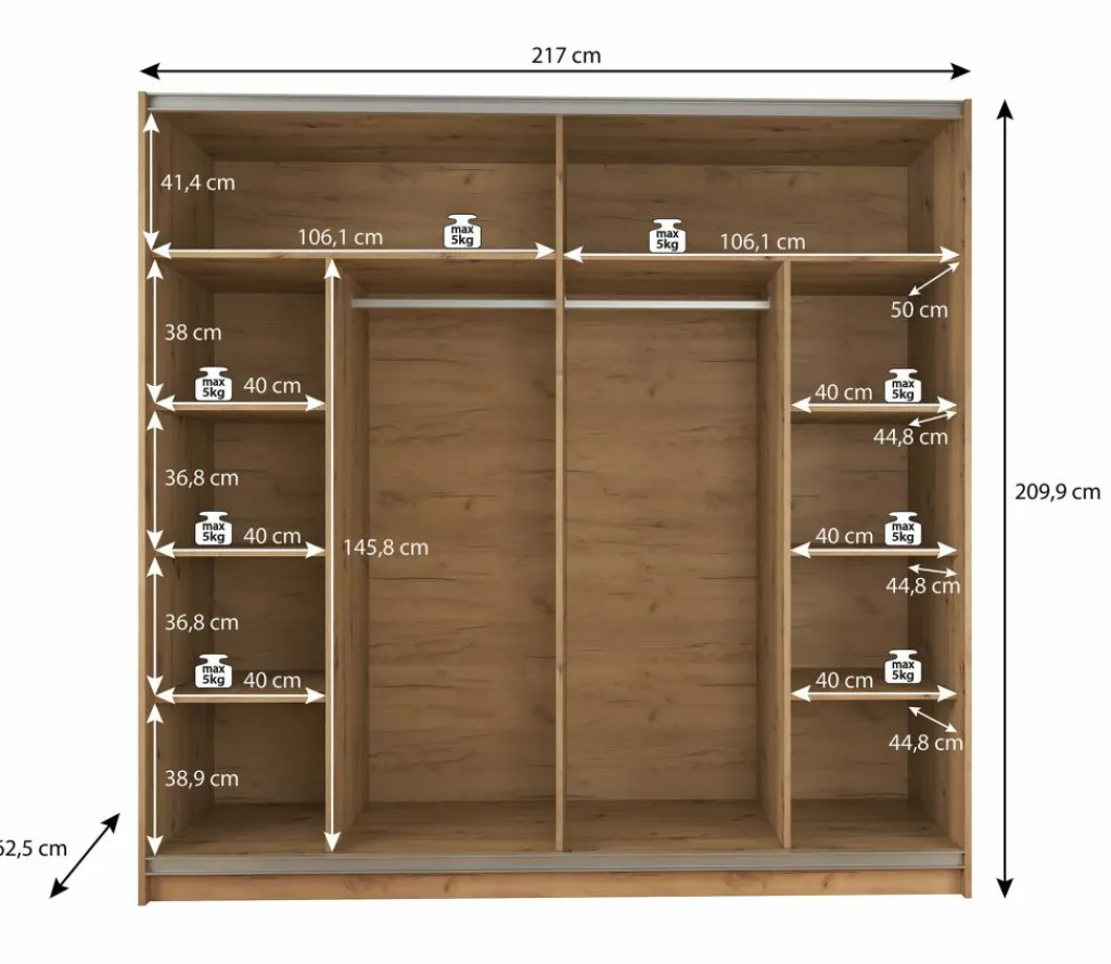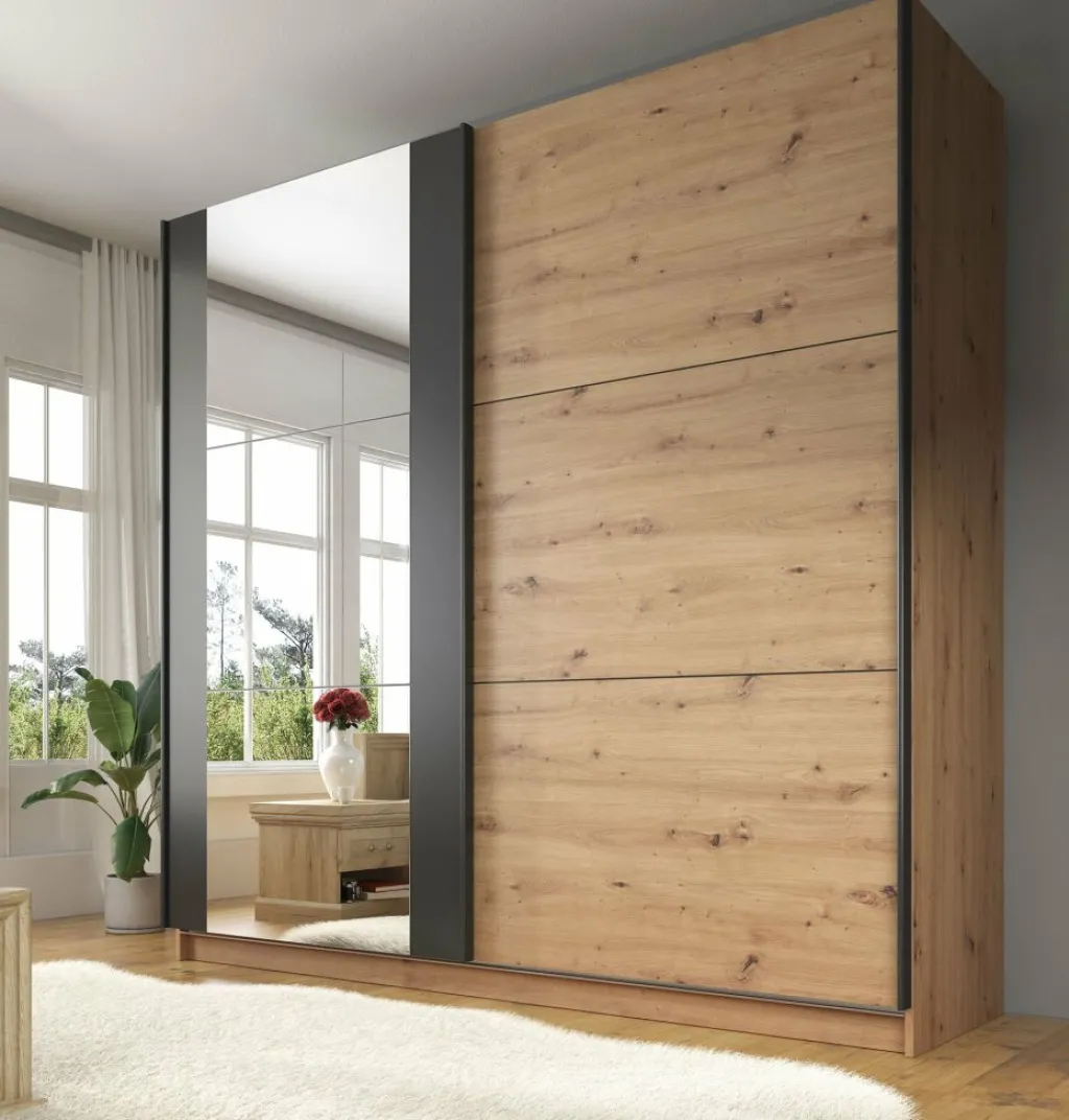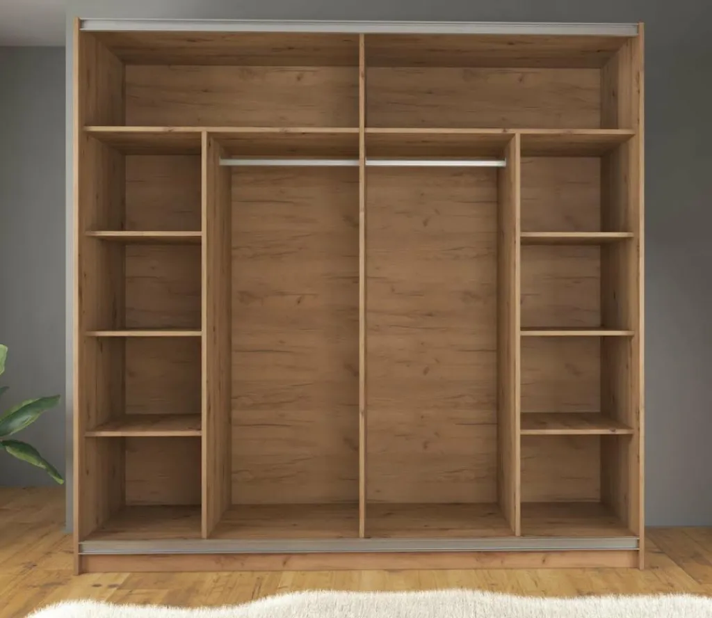 Kledingkast Saturn is een stijlvolle garderobekast uitgevoerd in eiken met zwarte details. Op de linker schuifdeur zit een grote spiegel. De kledingkast heeft twee schuifdeuren met daarachter veel opbergruimte. In het midden vind je twee stangen om kleding op te hangen en aan de linker-, rechter- en bovenkant vind je in totaal 12 vakken om kleding op te bergen.