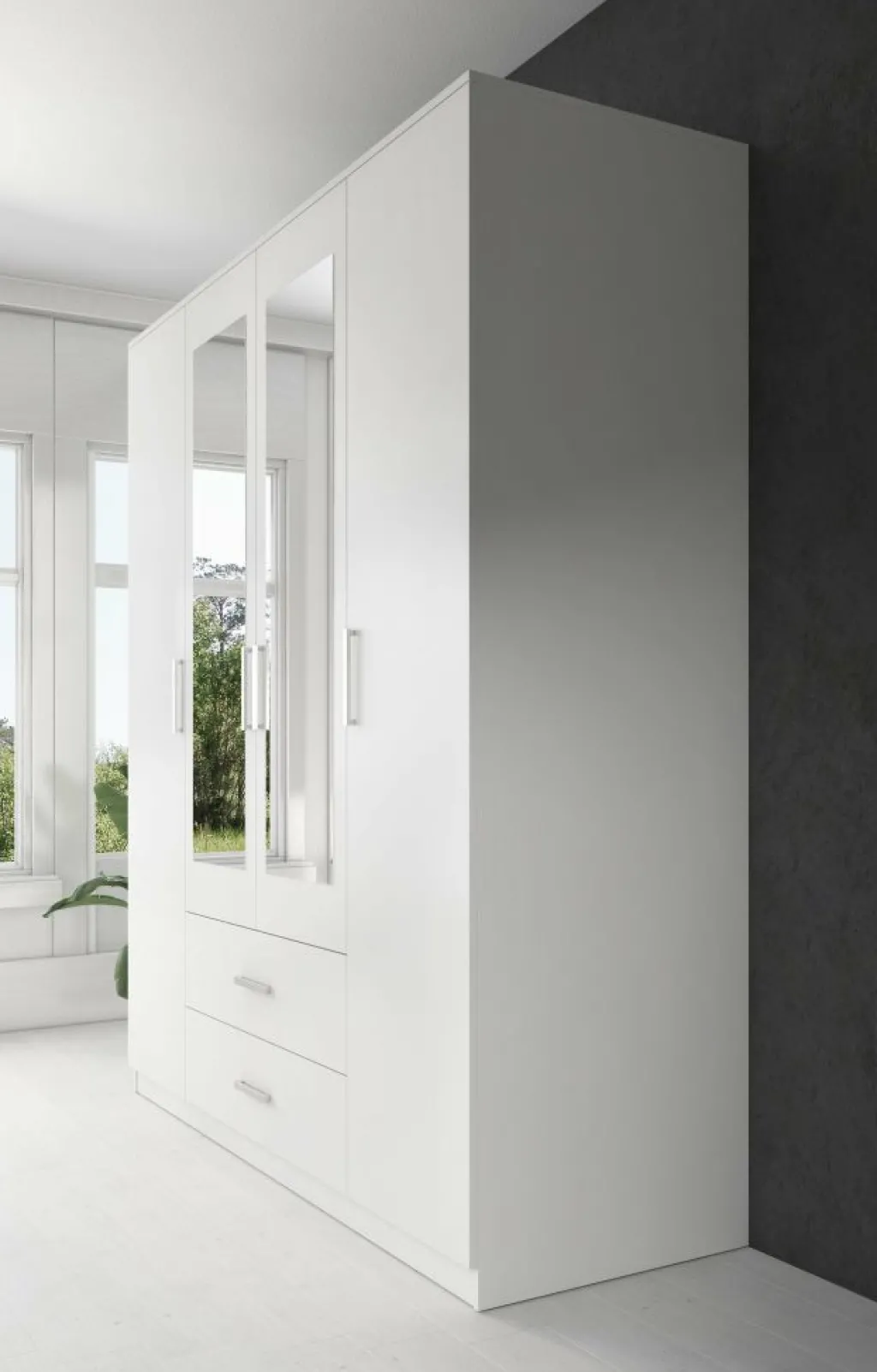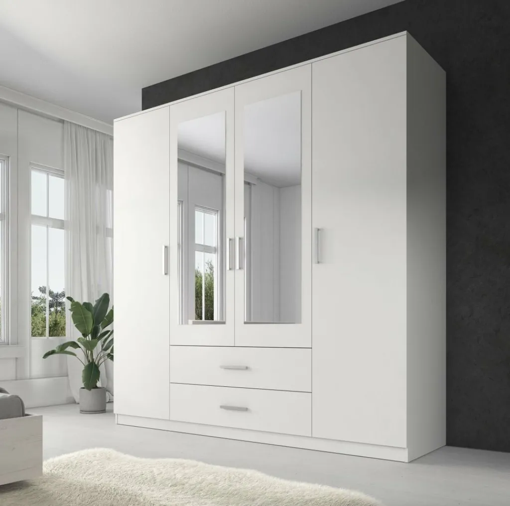 Garderobekast Savona is een praktische kast uitgevoerd in mat witte kleur. De kledingkast beschikt over 4 klapdeuren. De middelste deuren beschikken over een spiegel. Het binnenwerk bestaat uit twee metalen stangen om kleding aan op te hangen. Daarnaast beschikt de kast over 2 grote opberglades en 3 brede legplanken en biedt daardoor opbergruimte genoeg!