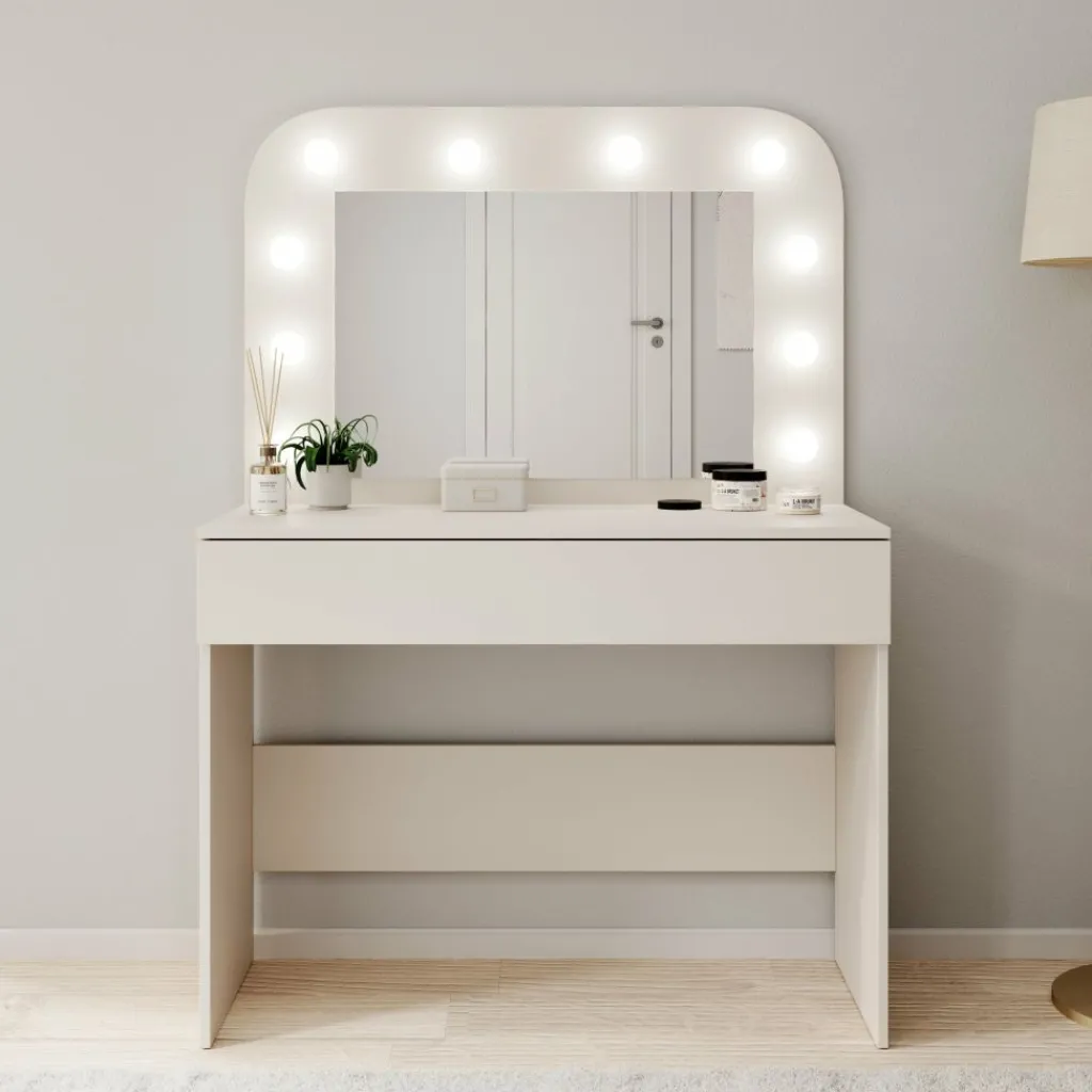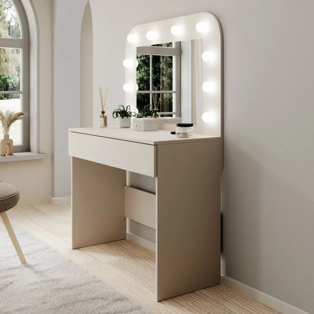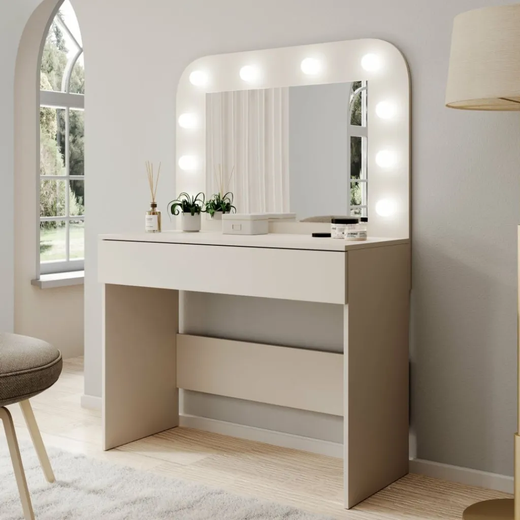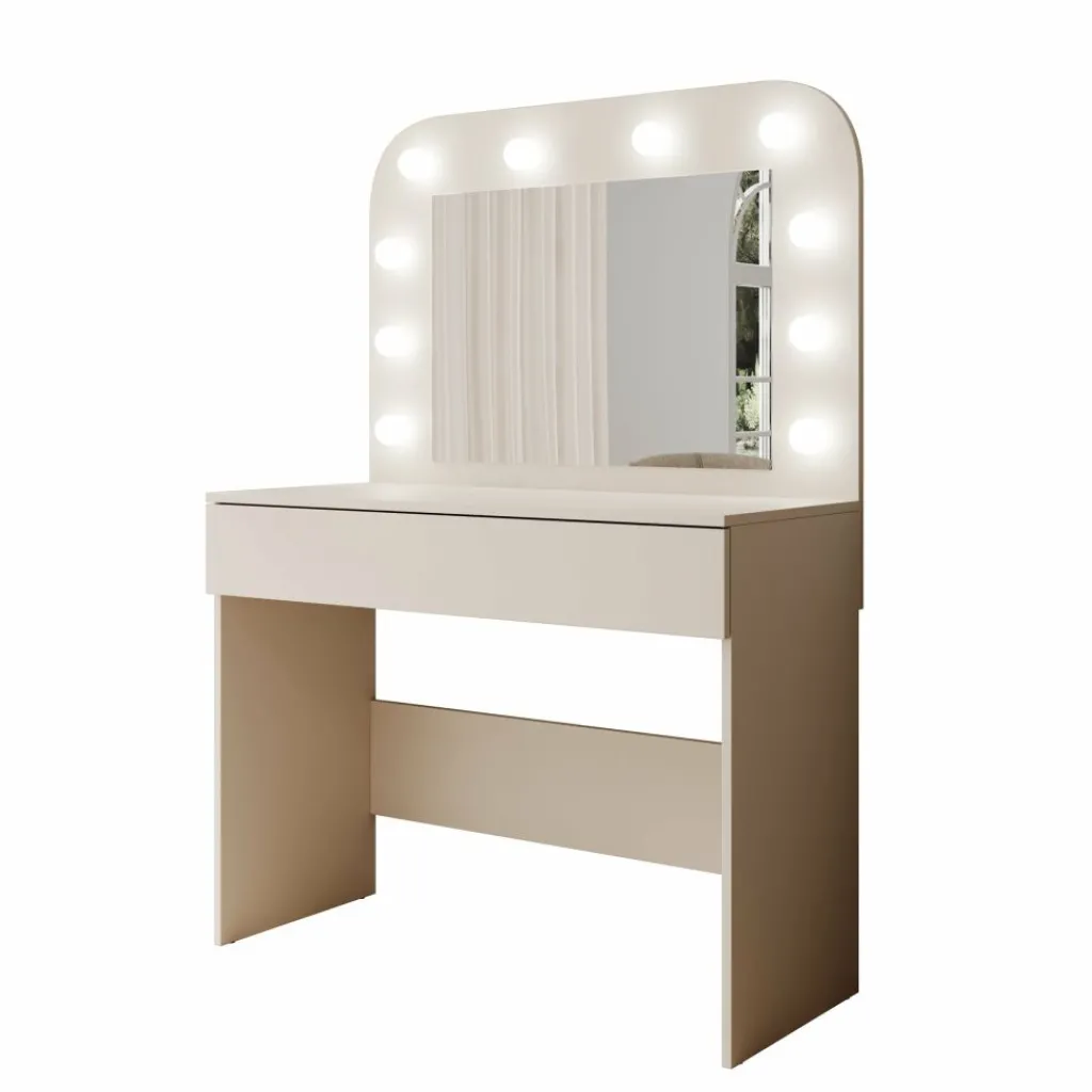 Savoy is een compacte kaptafel met geïntegreerde spiegel en verlichting, uitgevoerd in een beige afwerking. Met een breedte van 100 cm, een diepte van 43 cm en een totale hoogte van 143 cm biedt deze kaptafel een vaste plek voor dagelijkse verzorging en make-up, zonder veel ruimte in te nemen.