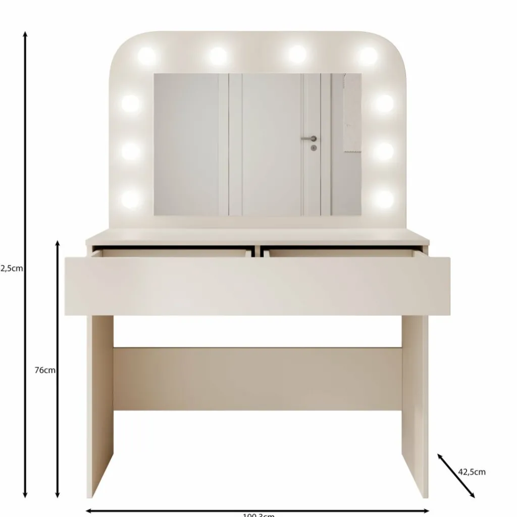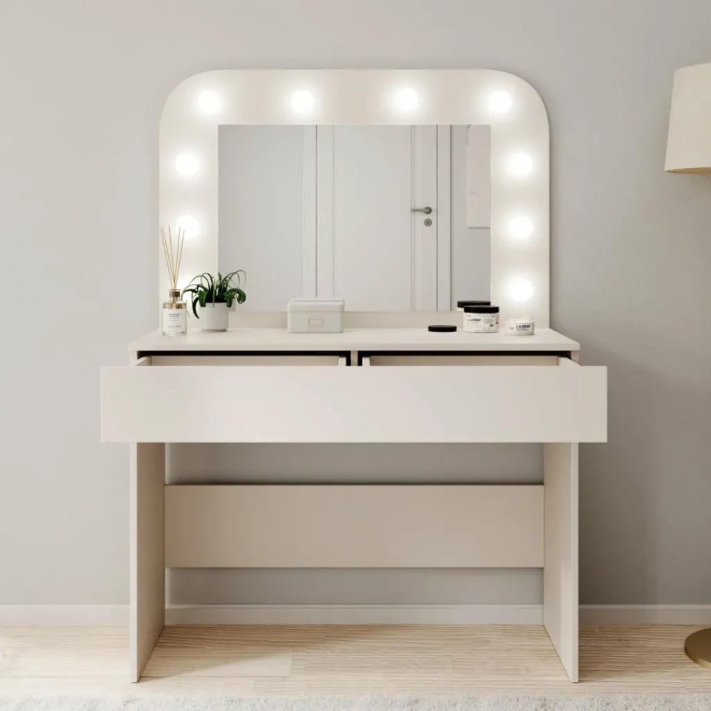 De spiegel is voorzien van ingebouwde verlichting die zorgt voor gelijkmatig licht tijdens gebruik. Onder het blad bevinden zich twee lades voor het opbergen van cosmetica, accessoires of andere kleine items. Elke lade heeft een maximaal draagvermogen van 5 kg. Het totale draagvermogen van de kaptafel bedraagt 20 kg, wat voldoende is voor dagelijks gebruik met verzorgingsproducten en accessoires.