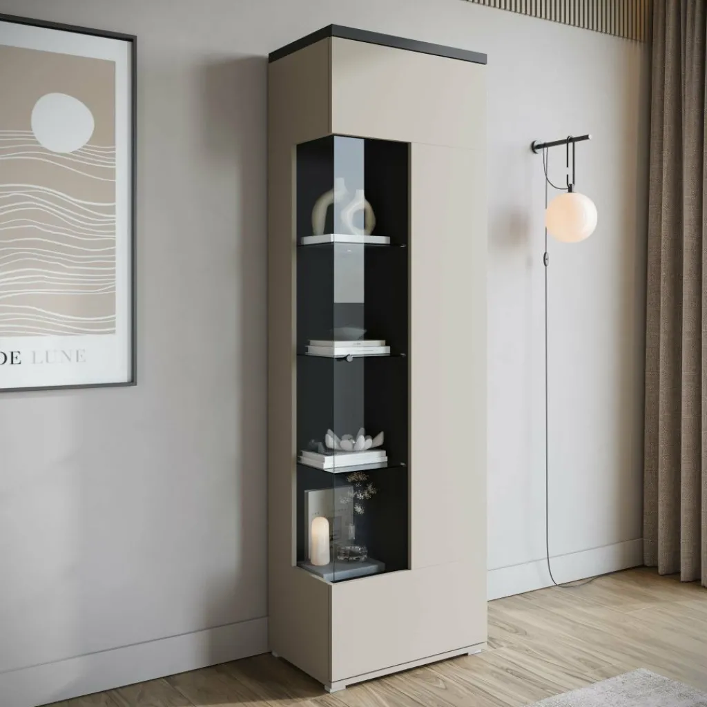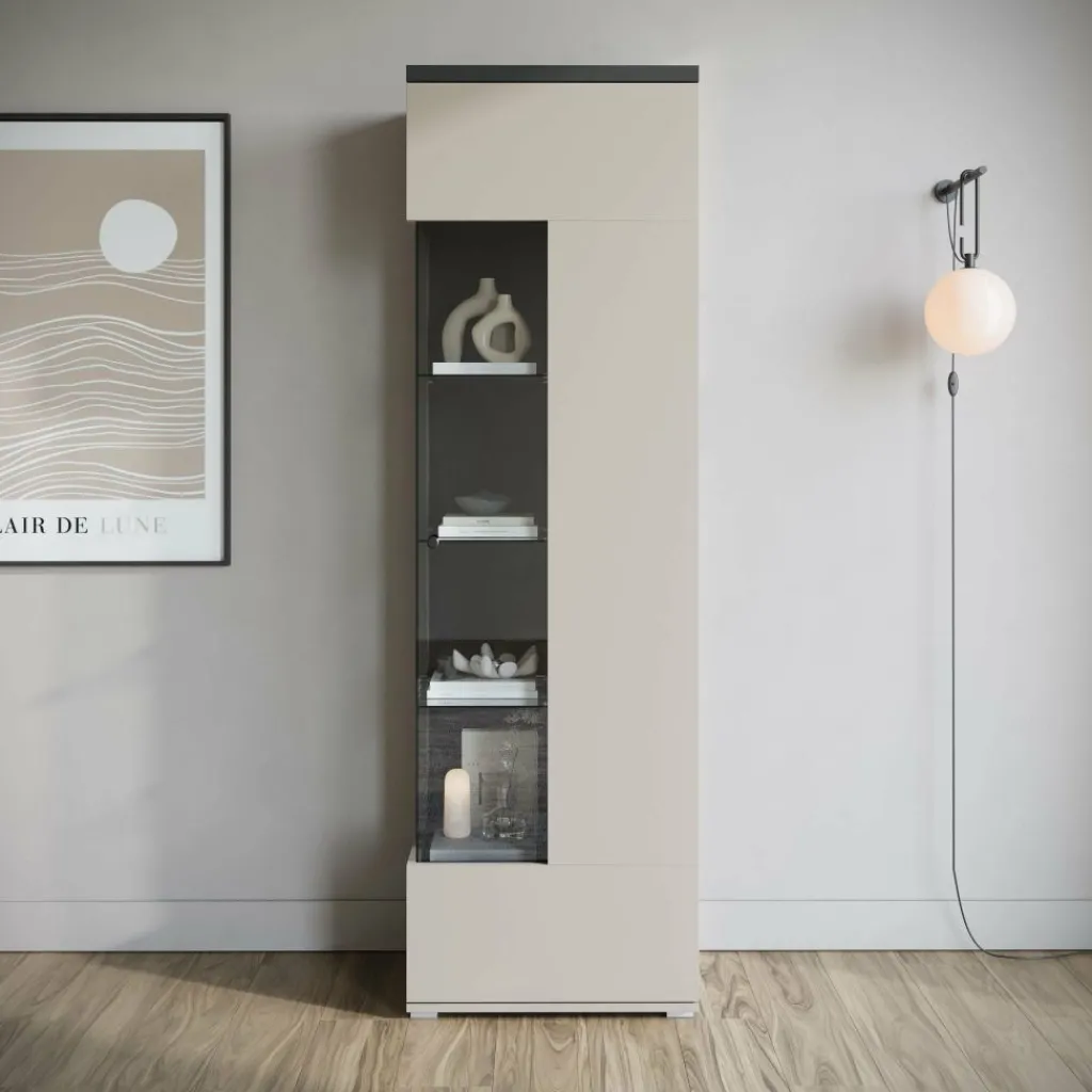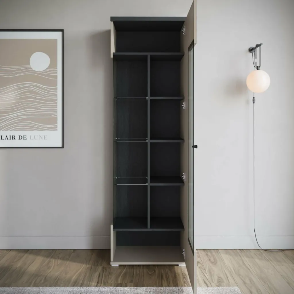 Vitrinekast Sekai is een opbergkast in moderne stijl. De kast beschikt over één grote deur die opent met een zwarte knop. Deze deur is gedeeltelijk voorzien van glas en ook aan de zijkant zit glas, wat het meubel een uniek design geeft. De binnenkant van de kast bestaat uit maar liefst 10 opbergvakken, ideaal om je spullen stijlvol op te bergen. De Sekai is uitgevoerd in beige met zwarte details en staat op slanke pootjes.