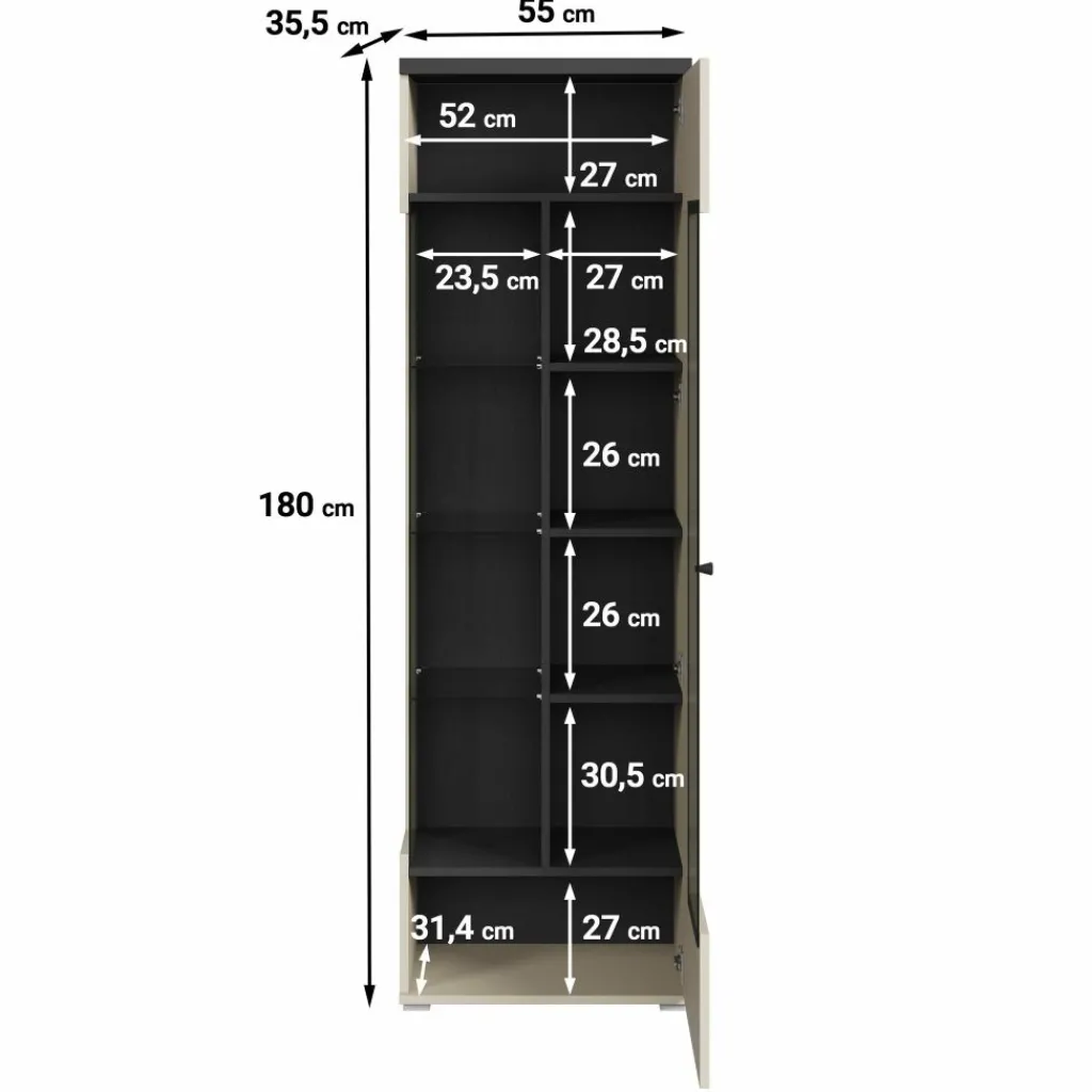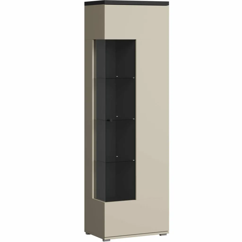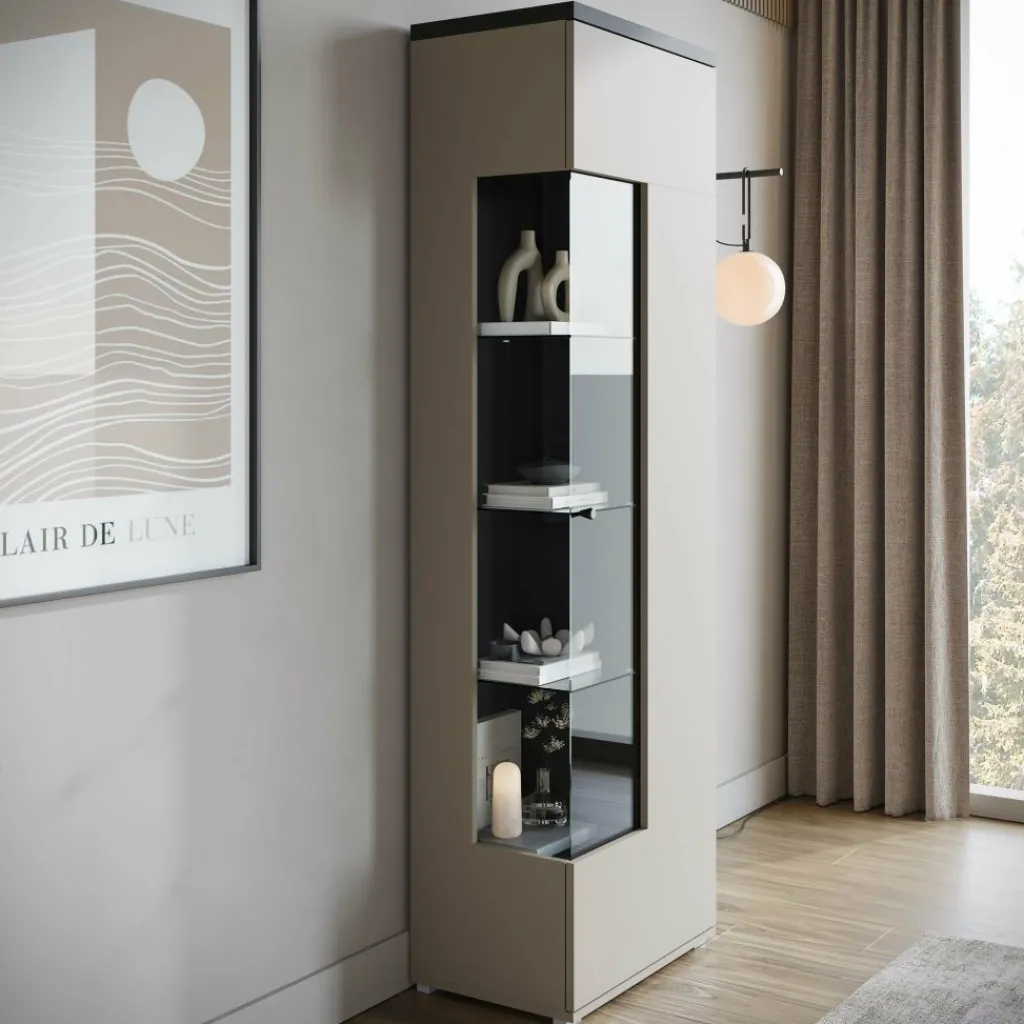 Vitrinekast Sekai is een opbergkast in moderne stijl. De kast beschikt over één grote deur die opent met een zwarte knop. Deze deur is gedeeltelijk voorzien van glas en ook aan de zijkant zit glas, wat het meubel een uniek design geeft. De binnenkant van de kast bestaat uit maar liefst 10 opbergvakken, ideaal om je spullen stijlvol op te bergen. De Sekai is uitgevoerd in beige met zwarte details en staat op slanke pootjes.
