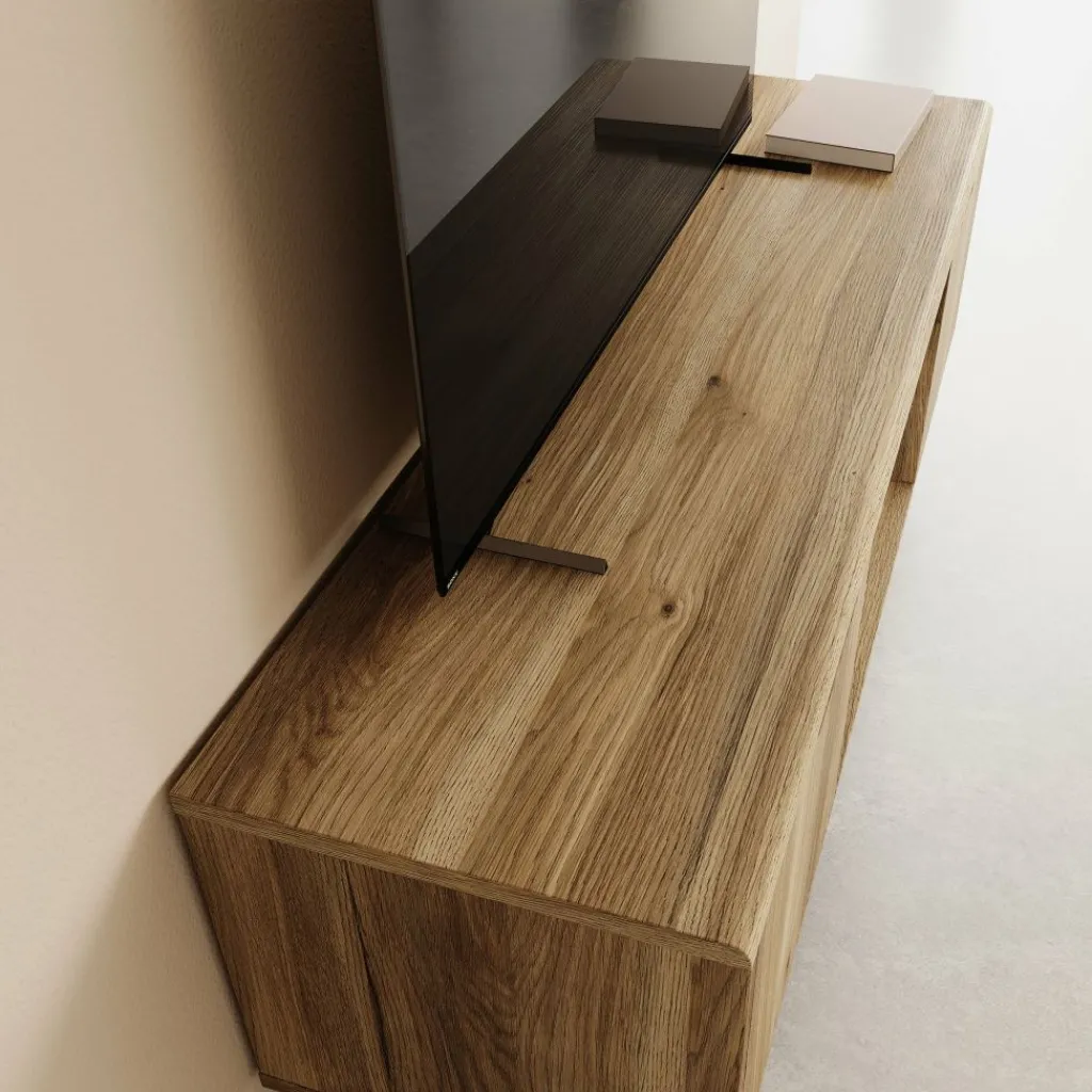 Achter de twee deuren vind je ruime vakken voor apparatuur, accessoires of spelcomputers. In het open middenvak plaats je eenvoudig je mediabox of boeken, terwijl de kabeldoorvoer zorgt dat snoeren netjes uit het zicht blijven. Het brede blad biedt voldoende ruimte voor een televisie en decoratie.
