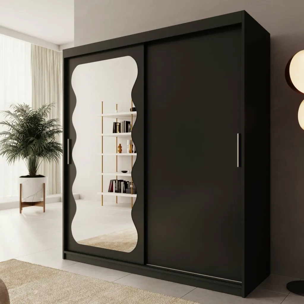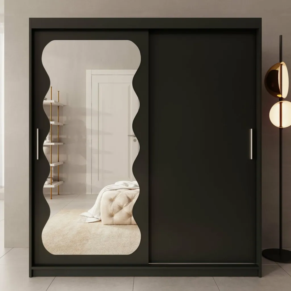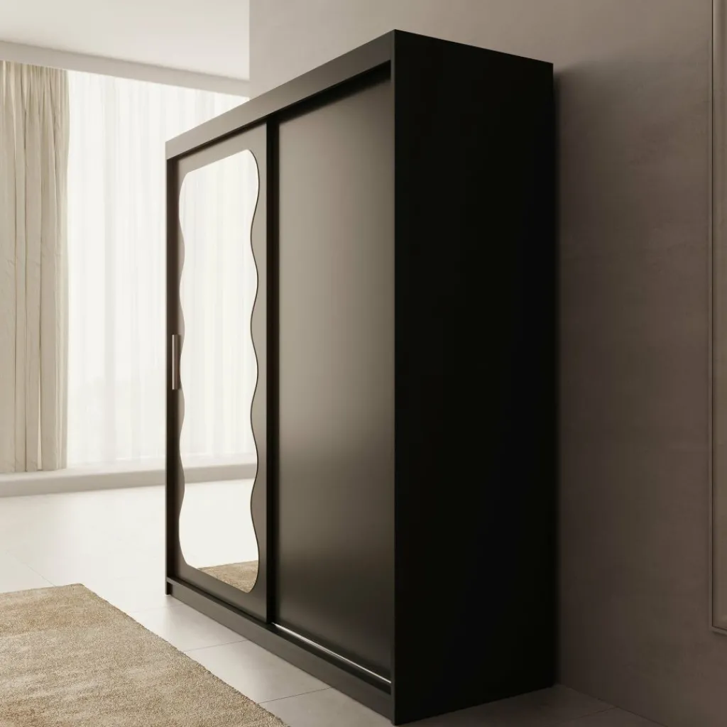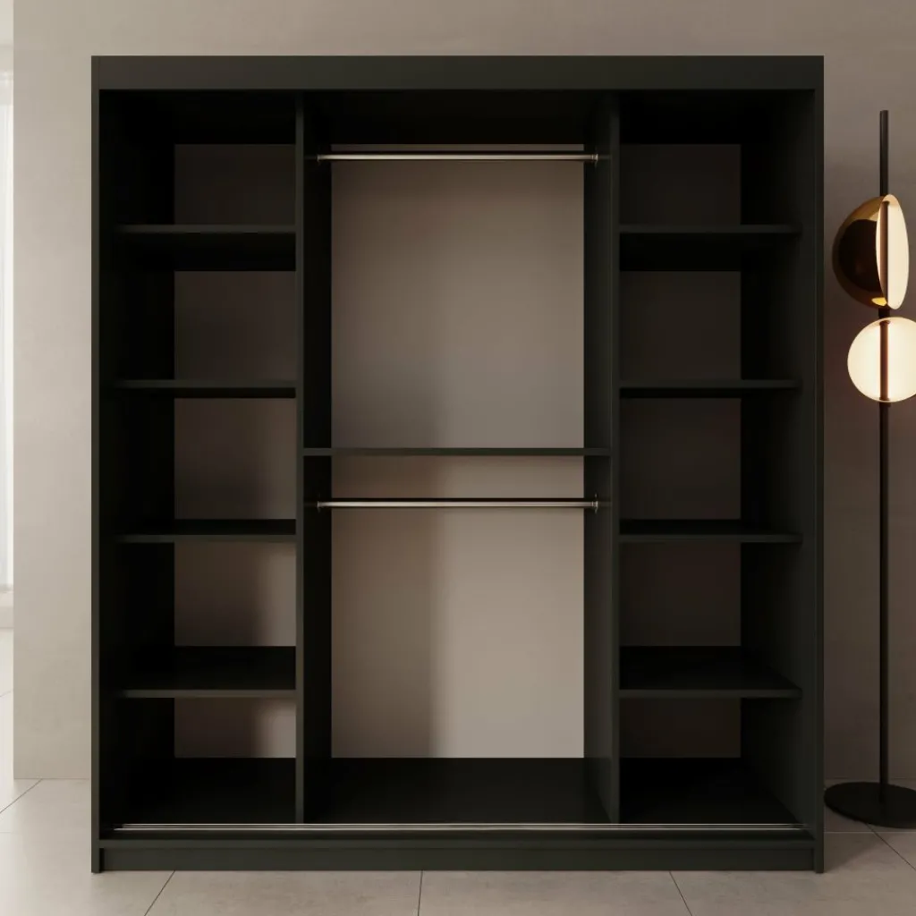 De Sentoji kledingkast is een praktische schuifdeurkast uitgevoerd in zwart en geschikt voor de slaapkamer of dressing. Met een breedte van 100 cm, een diepte van 62 cm en een hoogte van 200 cm biedt de kast overzichtelijke opbergruimte in een compact formaat.