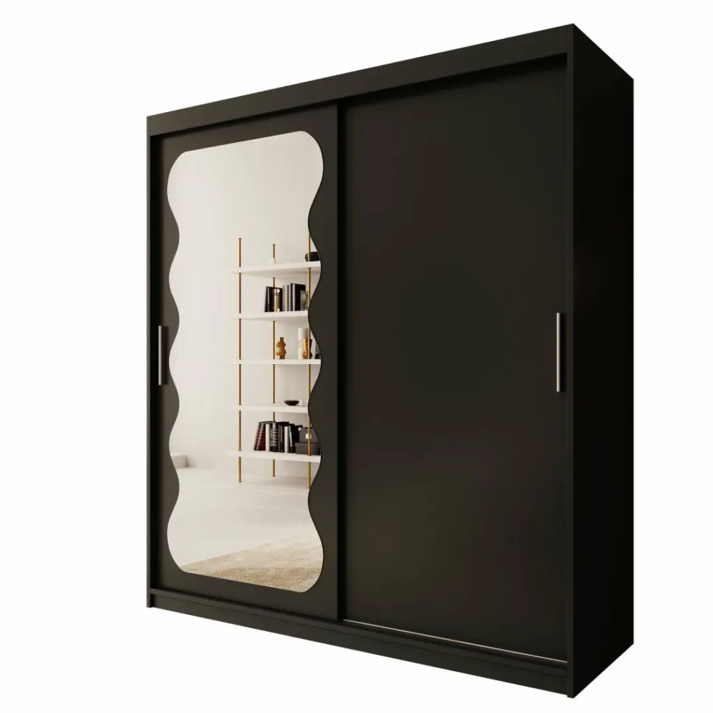 De kast is voorzien van twee schuifdeuren, waarvan één deur is afgewerkt met een spiegel aan de voorzijde. Hierdoor kun je gemakkelijk je outfit bekijken en wordt de ruimte optisch groter. Binnenin is de kast verdeeld in twee gedeeltes. Aan de ene zijde bevinden zich twee metalen kledingroedes boven elkaar voor het ophangen van kleding. Aan de andere zijde zijn meerdere legplanken geplaatst met daaronder twee lades voor kleinere kledingstukken of accessoires.