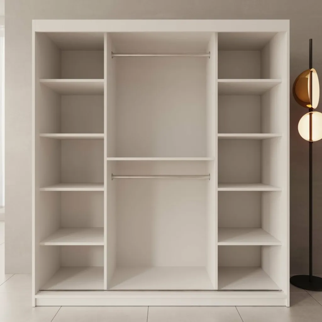 De Sentoji kledingkast is een ruime schuifdeurkast uitgevoerd in wit en geschikt voor de slaapkamer of dressing. Met een breedte van 180 cm, een diepte van 62 cm en een hoogte van 200 cm biedt de kast veel opbergruimte voor kleding, accessoires en andere items.