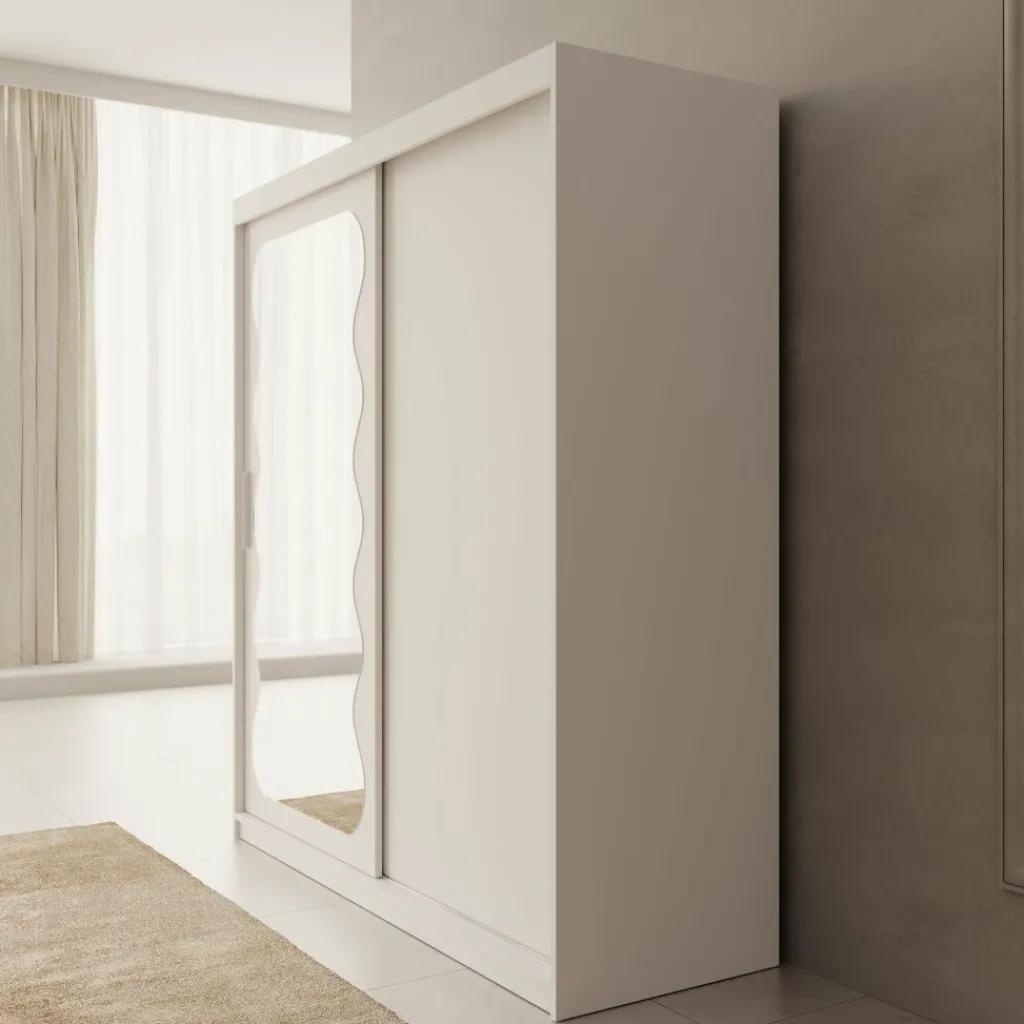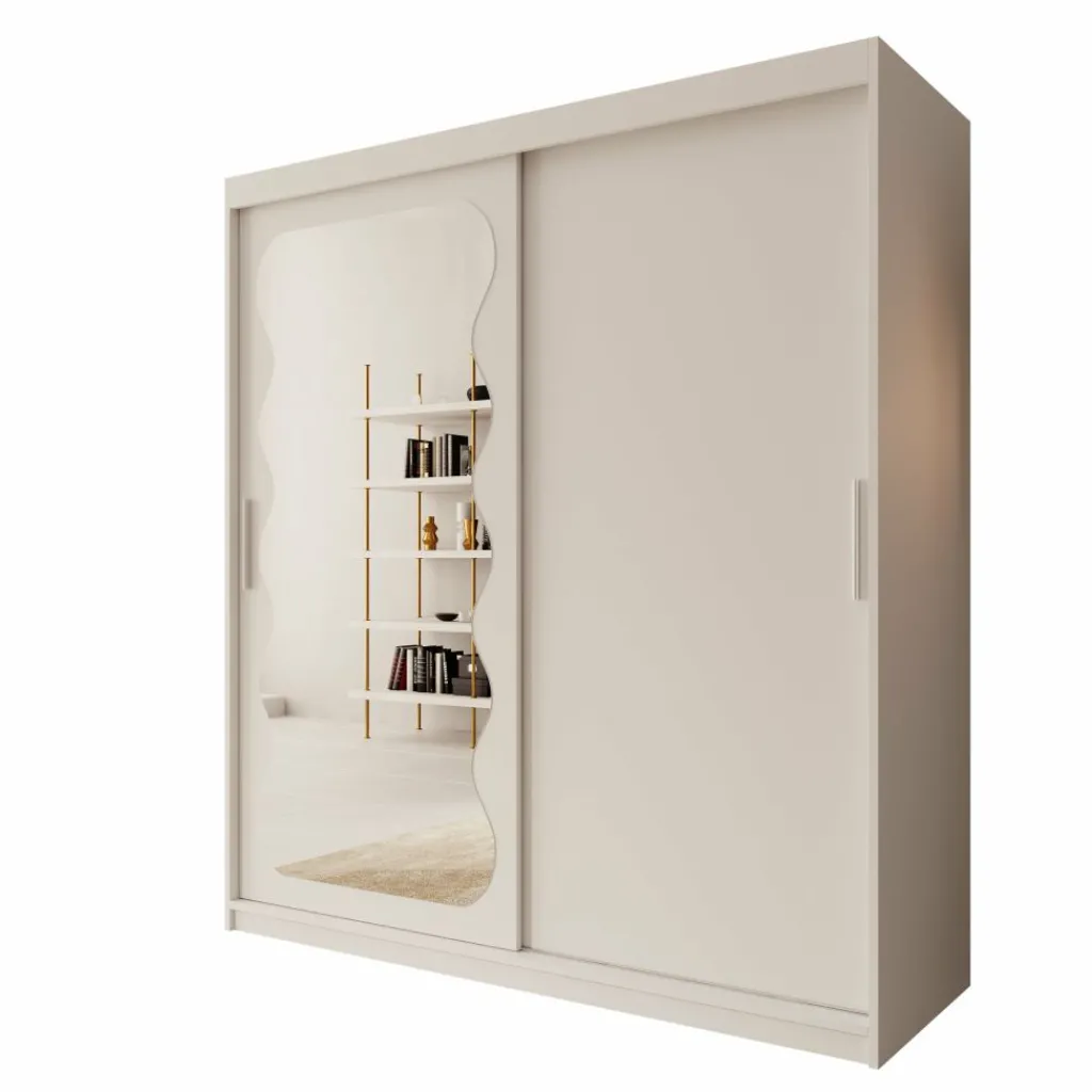 De kast is voorzien van twee schuifdeuren, waarvan één deur is afgewerkt met een grote spiegel aan de voorzijde. Hierdoor kun je gemakkelijk je outfit bekijken en oogt de ruimte optisch groter. Binnenin is de kast verdeeld in drie secties. In het middelste gedeelte bevinden zich twee metalen kledingroedes boven elkaar voor het ophangen van kleding. Aan de linkerzijde zijn meerdere legplanken geplaatst met daaronder twee lades voor kleinere kledingstukken of accessoires. Aan de rechterzijde bevindt zich een kolom met legplanken en eveneens twee lades voor extra opbergruimte.