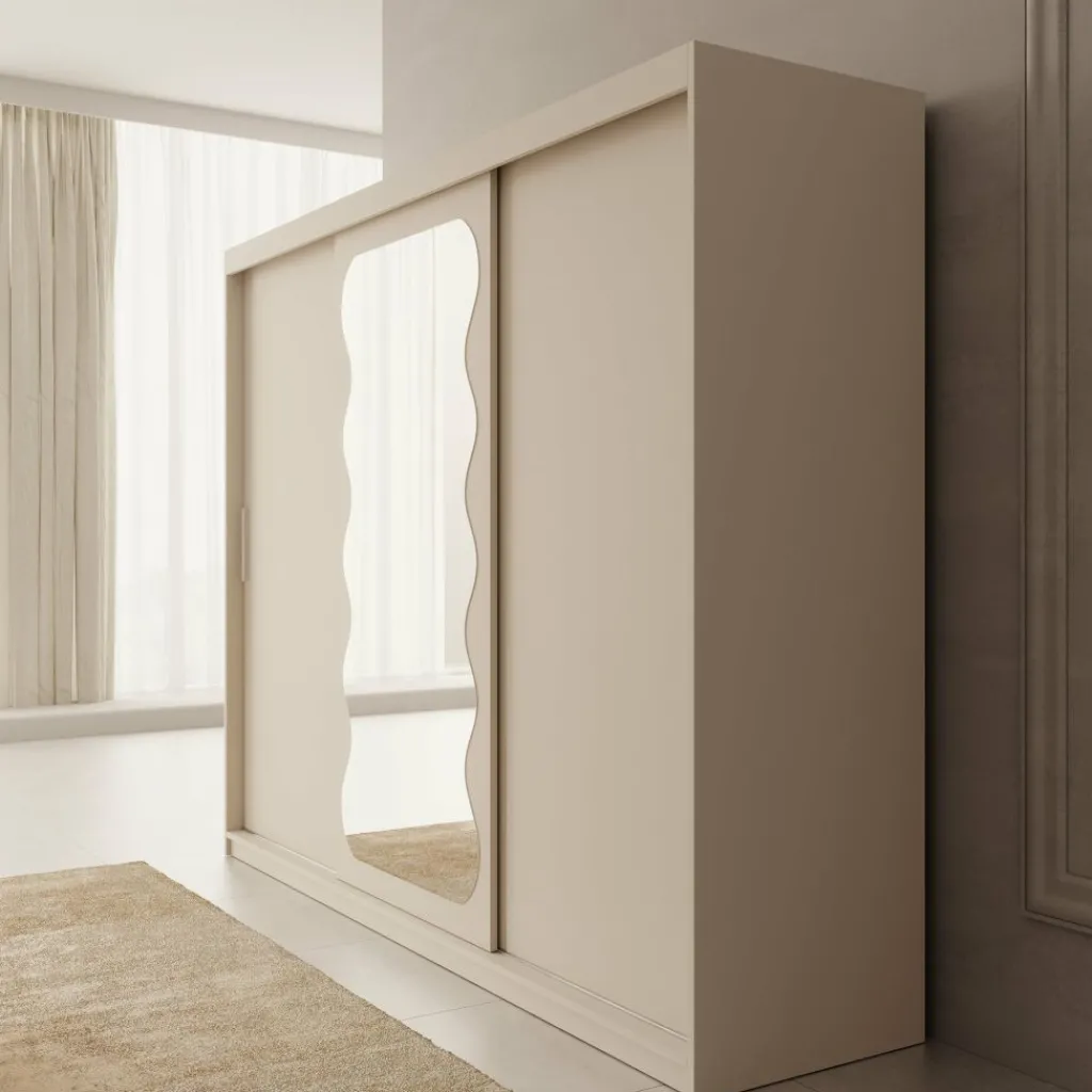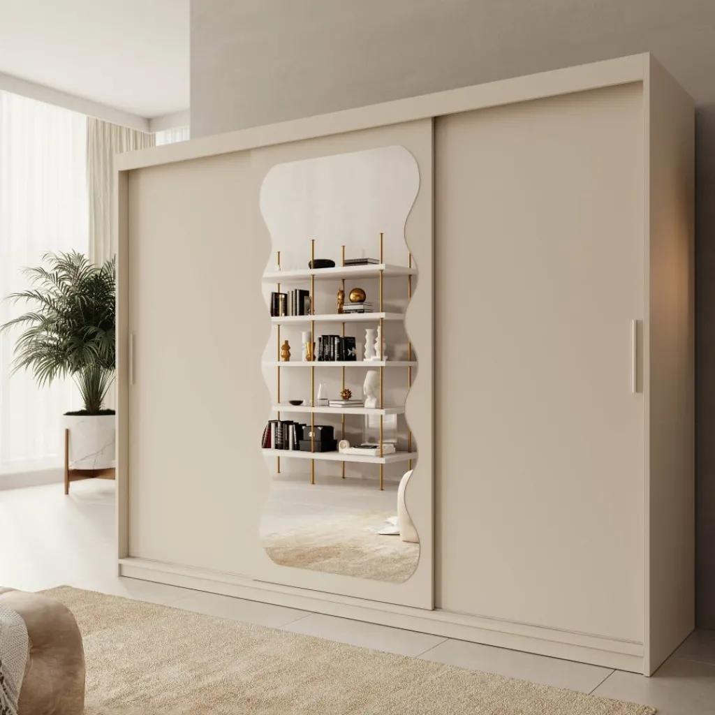 De kast is voorzien van drie schuifdeuren, waarbij de middelste deur is uitgerust met een grote spiegel. Hierdoor kun je gemakkelijk je outfit bekijken en oogt de ruimte optisch groter. Achter de deuren is de kast verdeeld in drie ruime compartimenten. In het middelste gedeelte bevinden zich twee metalen kledingroedes boven elkaar voor het ophangen van kleding. Aan zowel de linker- als rechterzijde zijn meerdere legplanken geplaatst voor gevouwen kleding, dozen of accessoires. Daarnaast bevinden zich aan beide zijden twee ruime lades voor het opbergen van kleinere kledingstukken.