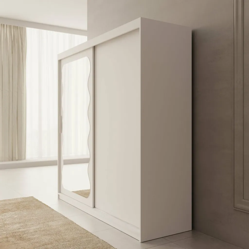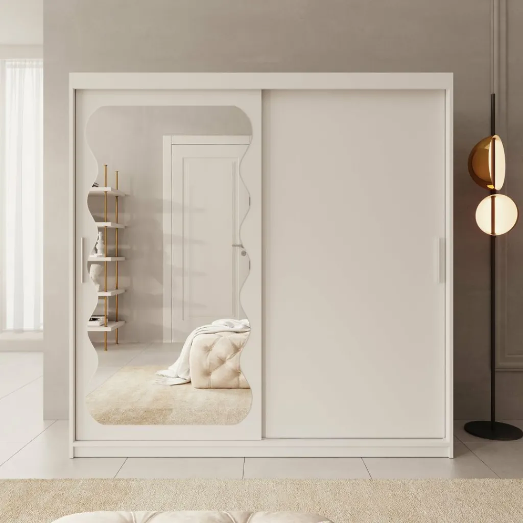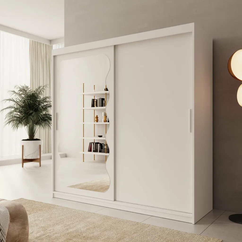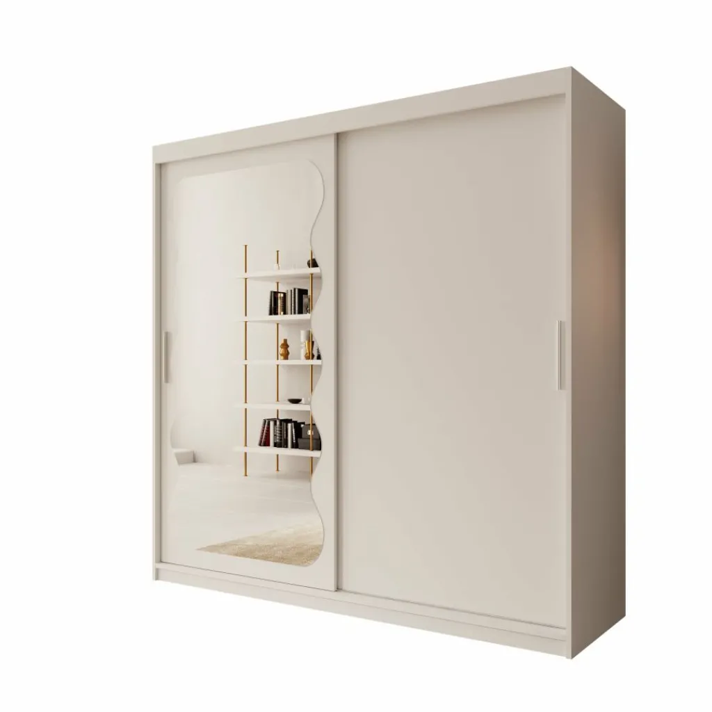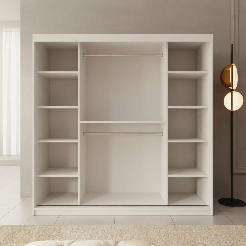De kast is voorzien van twee schuifdeuren, waarvan één deur is afgewerkt met een grote spiegel aan de voorzijde. Hierdoor kun je gemakkelijk je outfit bekijken en oogt de ruimte optisch groter. Binnenin is de kast verdeeld in drie compartimenten. In het middelste gedeelte bevinden zich twee metalen kledingroedes boven elkaar voor het ophangen van kleding. Aan zowel de linker- als rechterzijde bevinden zich meerdere legplanken voor gevouwen kleding of accessoires. Daarnaast zijn aan beide zijden twee lades geplaatst voor het opbergen van kleinere kledingstukken.