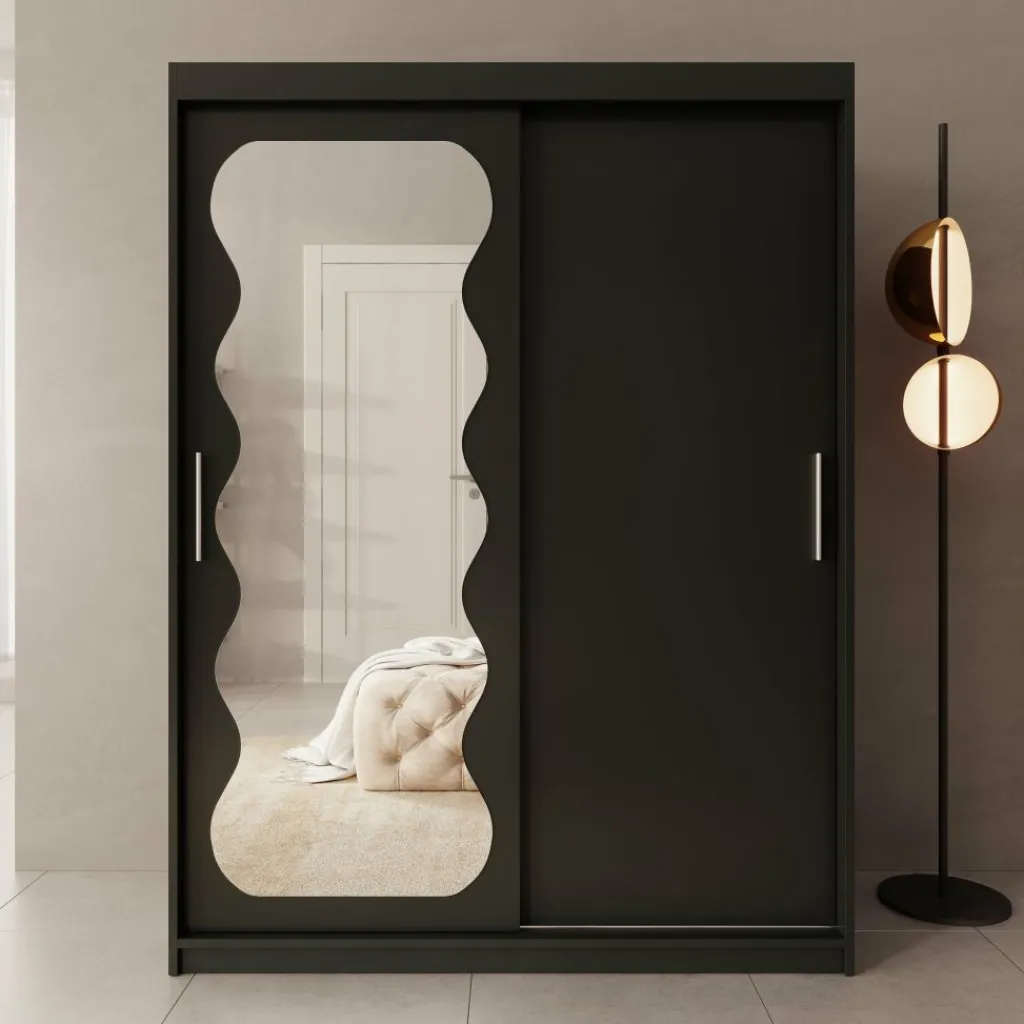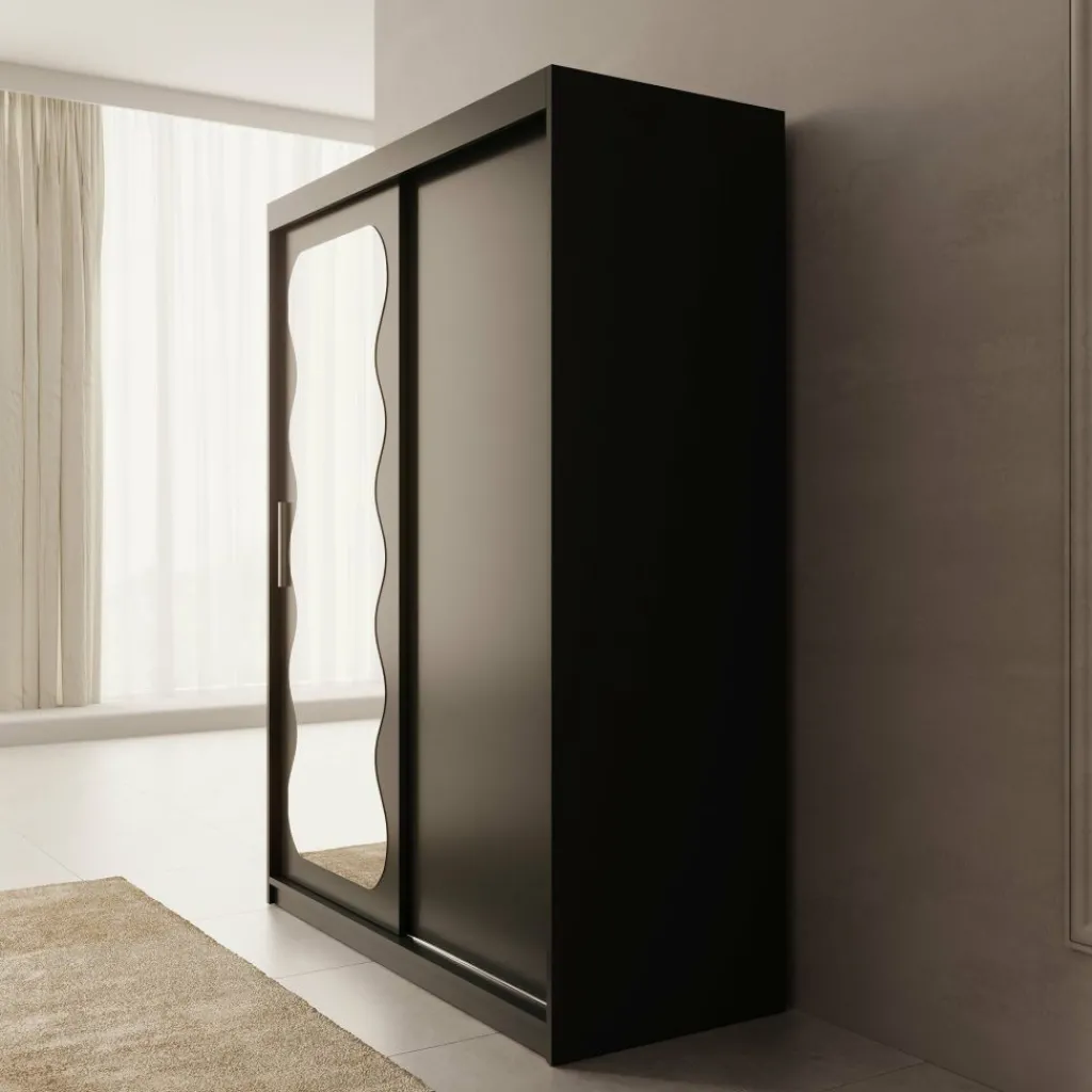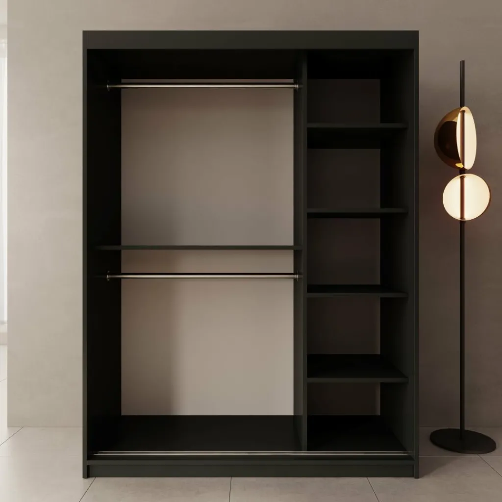 De Sentoji kledingkast is een praktische schuifdeurkast uitgevoerd in zwart en geschikt voor de slaapkamer of dressing. Met een breedte van 150 cm, een diepte van 62 cm en een hoogte van 200 cm biedt de kast ruime en overzichtelijke opbergruimte zonder veel vloeroppervlak in te nemen.