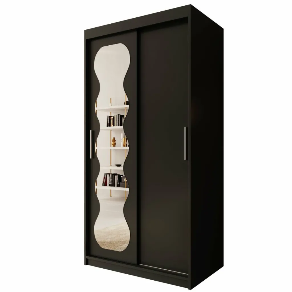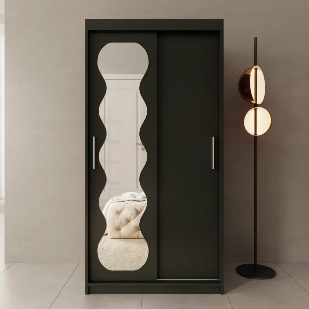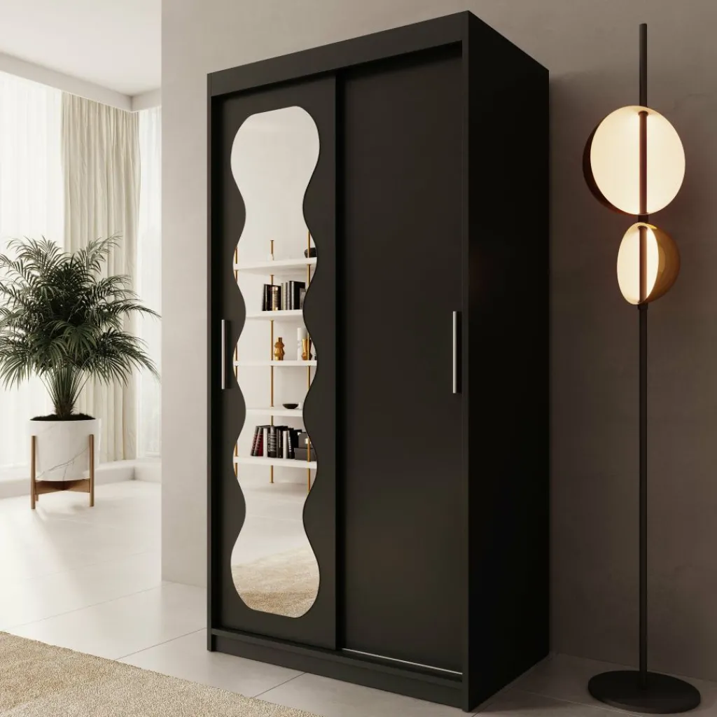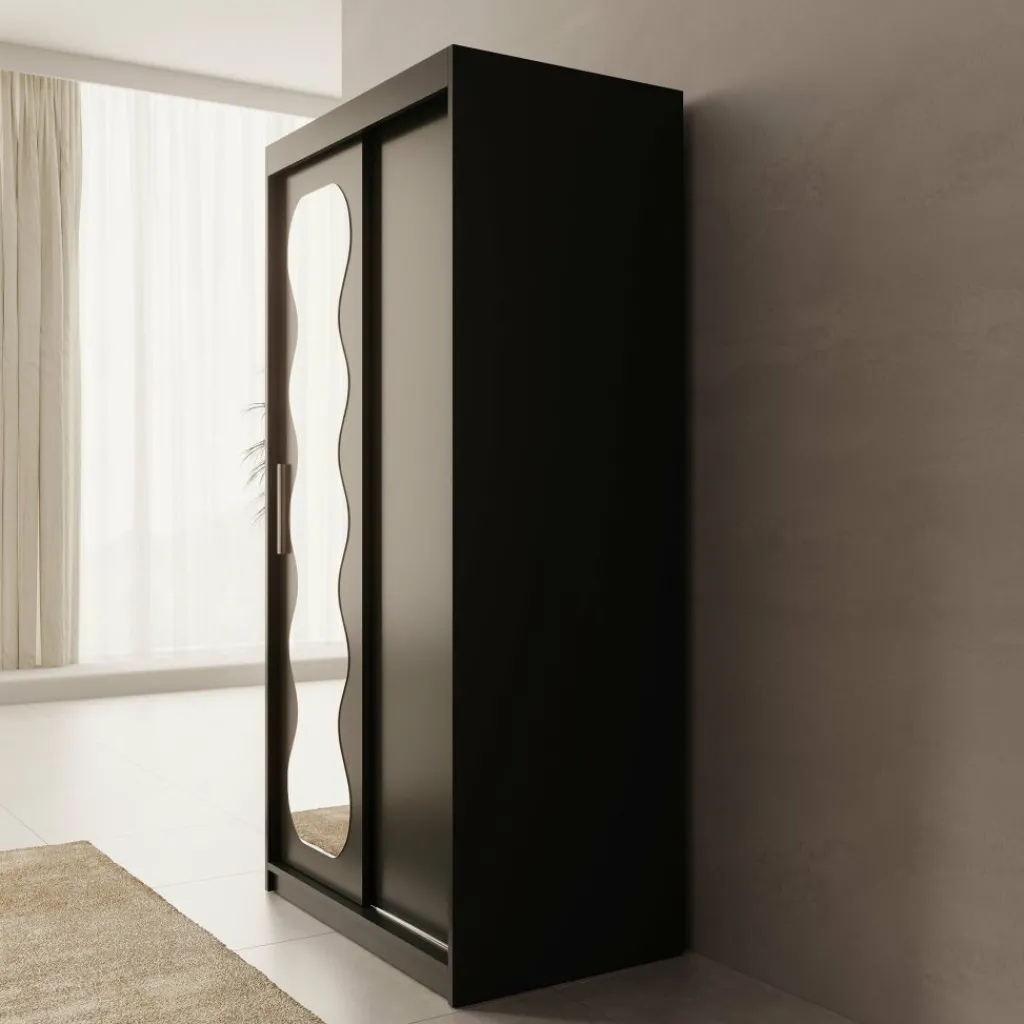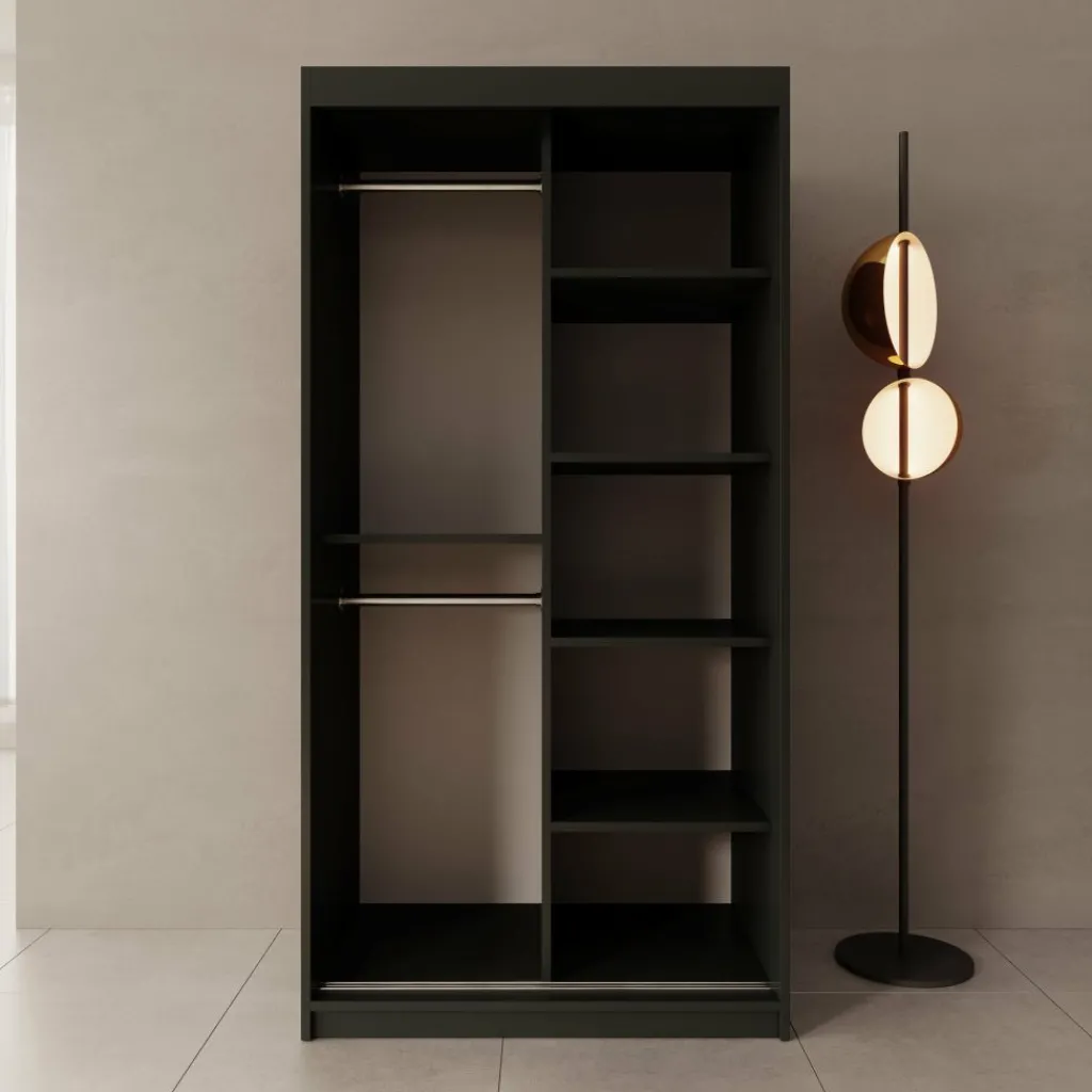 De Sentoji kledingkast is een praktische schuifdeurkast uitgevoerd in zwart en geschikt voor de slaapkamer of dressing. Met een breedte van 100 cm, een diepte van 62 cm en een hoogte van 200 cm biedt de kast overzichtelijke opbergruimte zonder veel vloeroppervlak in te nemen.