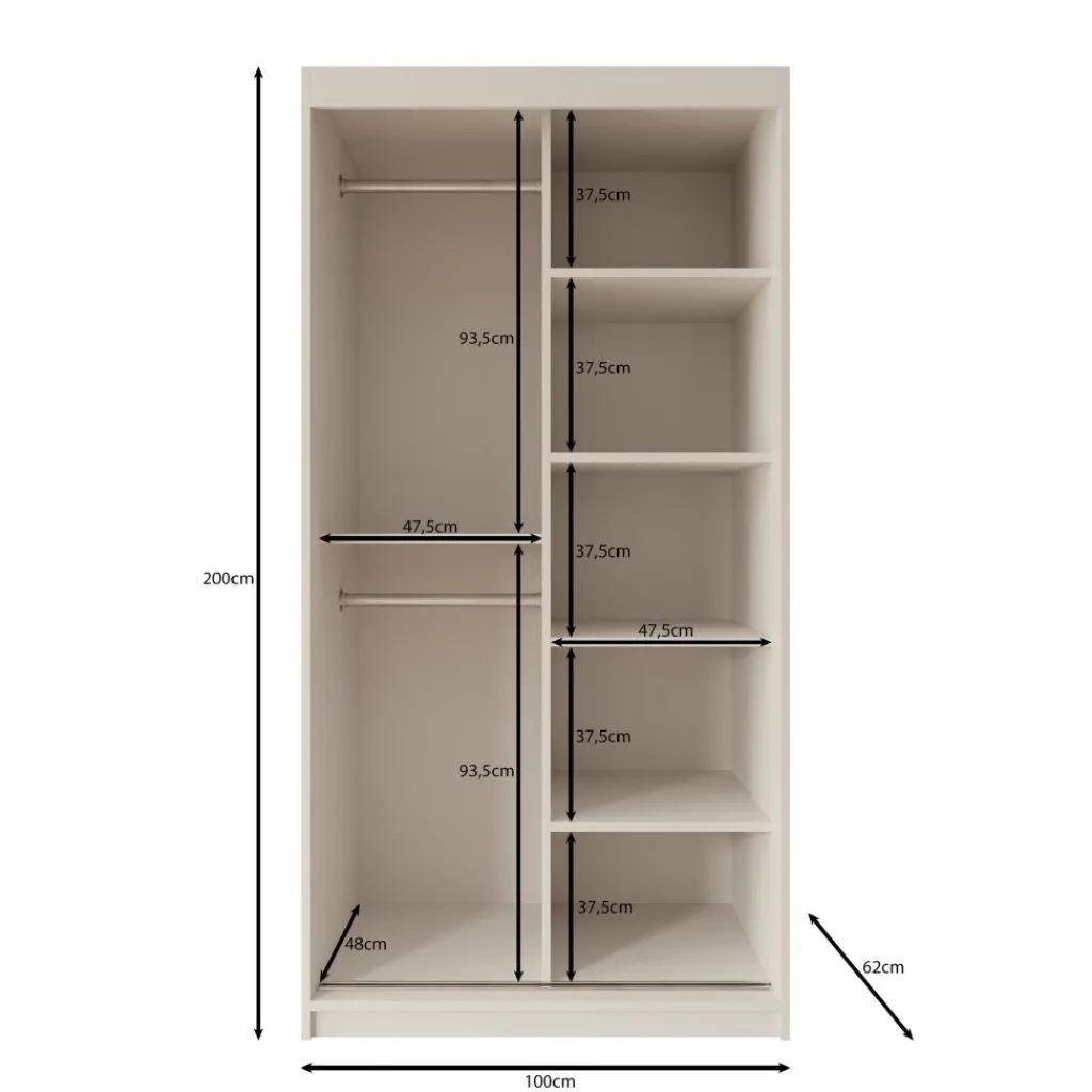De kast is voorzien van twee schuifdeuren, waarvan één deur is afgewerkt met een gepolijste spiegel aan de voorzijde. Hierdoor kun je gemakkelijk je outfit controleren en wordt de ruimte optisch groter. Binnenin is de kast verdeeld in een hanggedeelte met een metalen kledingroede en meerdere legvakken. Daarnaast beschikt de kast over twee lades voor kleinere kledingstukken of accessoires.