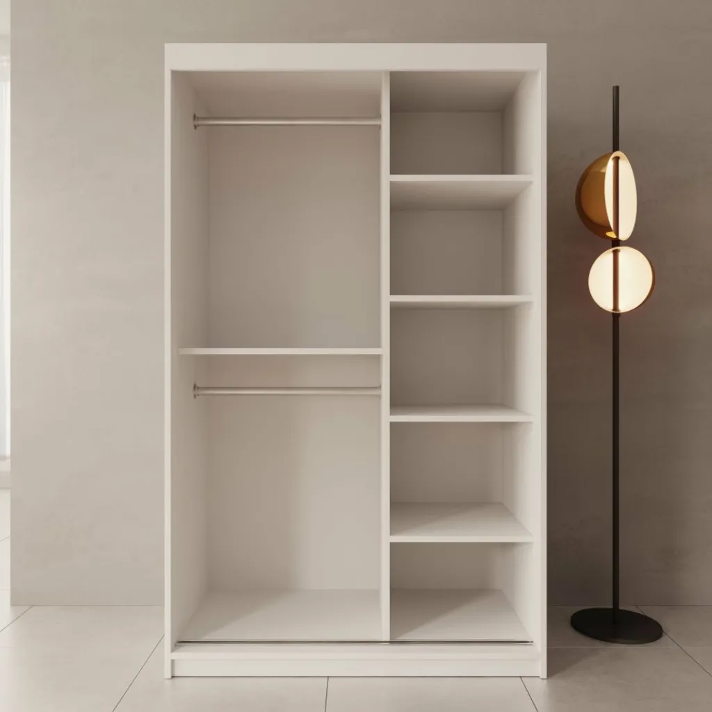 De Sentoji kledingkast is een praktische schuifdeurkast uitgevoerd in wit en geschikt voor de slaapkamer of dressing. Met een breedte van 120 cm, een diepte van 62 cm en een hoogte van 200 cm biedt de kast ruime en overzichtelijke opbergruimte zonder veel vloeroppervlak in te nemen.