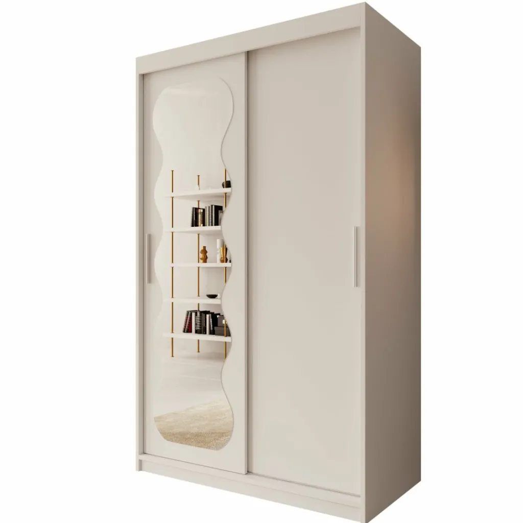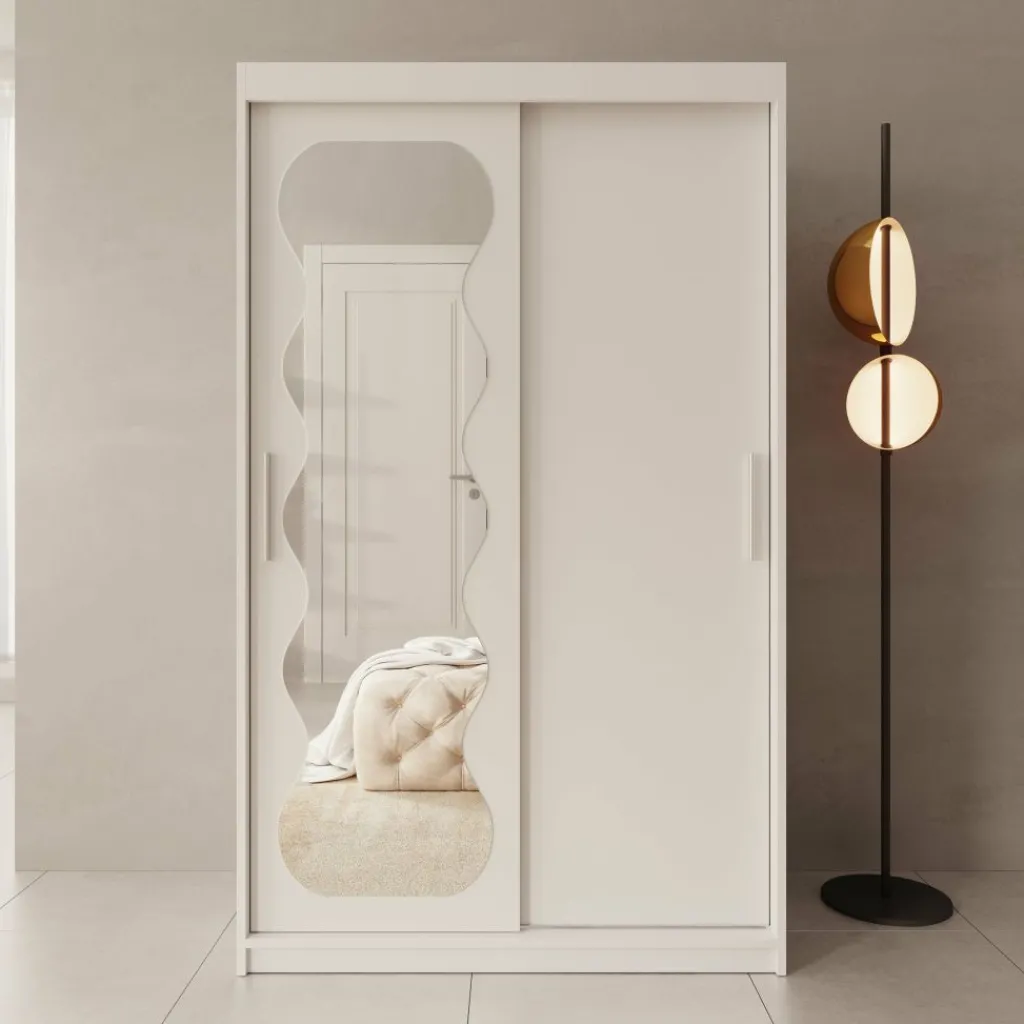De kast is voorzien van twee schuifdeuren, waarvan één deur is afgewerkt met een gepolijste spiegel aan de voorzijde. Hierdoor kun je gemakkelijk je outfit controleren en wordt de ruimte optisch groter. Binnenin is de kast verdeeld in een hanggedeelte met metalen kledingroedes en meerdere legvakken. Daarnaast beschikt de kast over twee lades voor kleinere kledingstukken of accessoires.