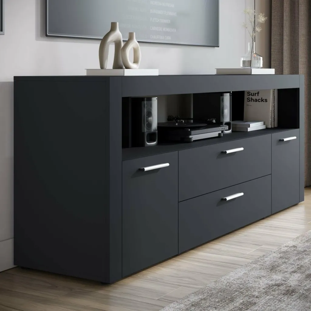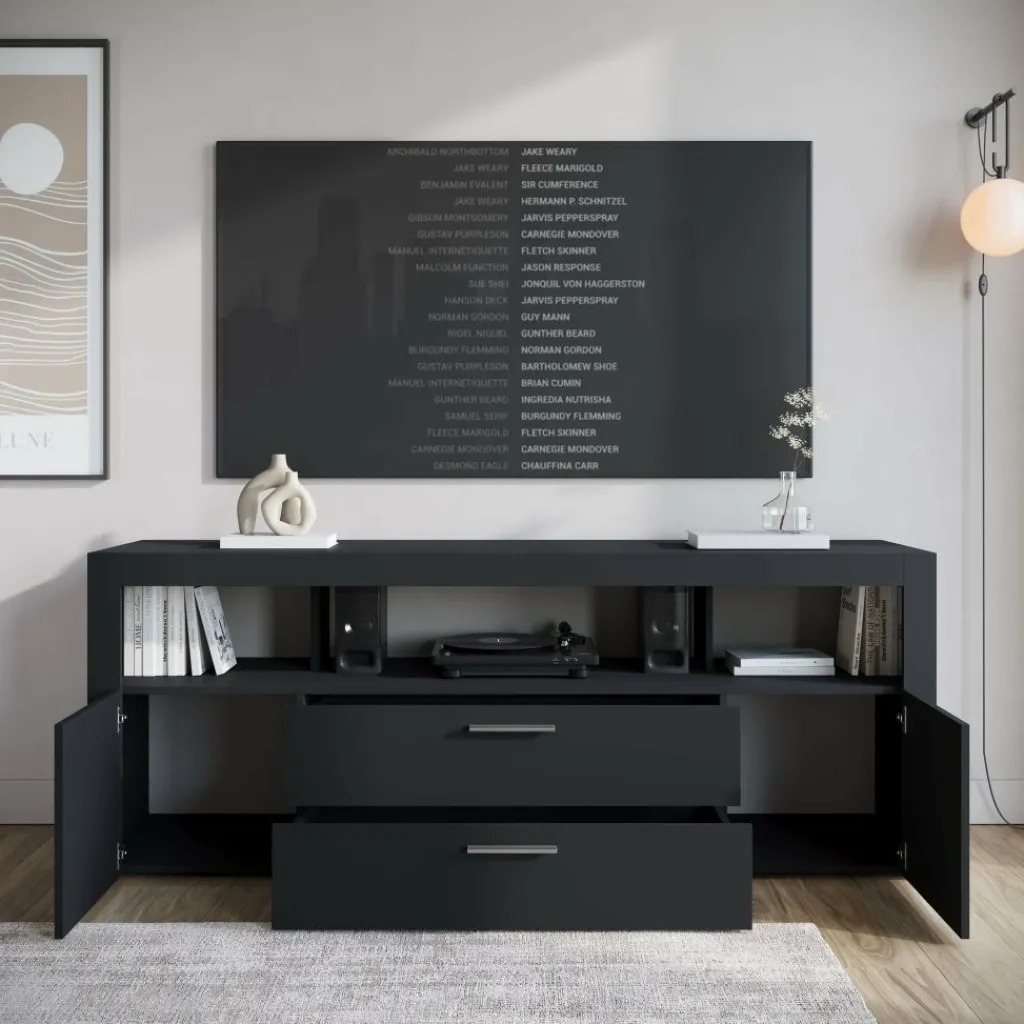 Achter de twee deuren berg je kabels, accessoires of spelcomputers netjes uit het zicht. De twee ruime lades zijn ideaal voor afstandsbedieningen, opladers of andere losse spullen. Bovenin vind je drie open vakken met plek voor bijvoorbeeld een tv-ontvanger, speaker of wat decoratie.