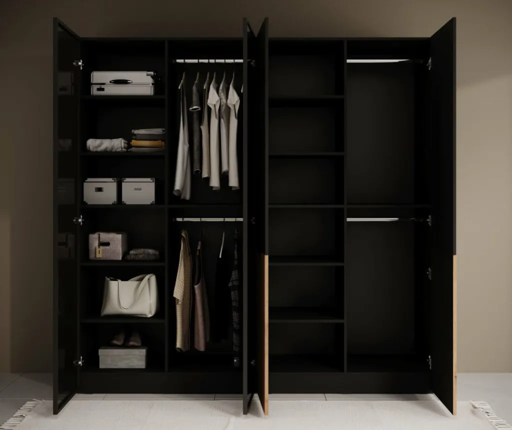 Deze kledingkast is voorzien van vier openslaande deuren (scharnierdeuren), waarmee je eenvoudig toegang hebt tot alle compartimenten. Achter de deuren vind je een slimme indeling met meerdere legplanken en een royale hangruimte. Ideaal voor het opbergen van zowel gevouwen kleding als hangende items zoals overhemden, jurken of jassen.