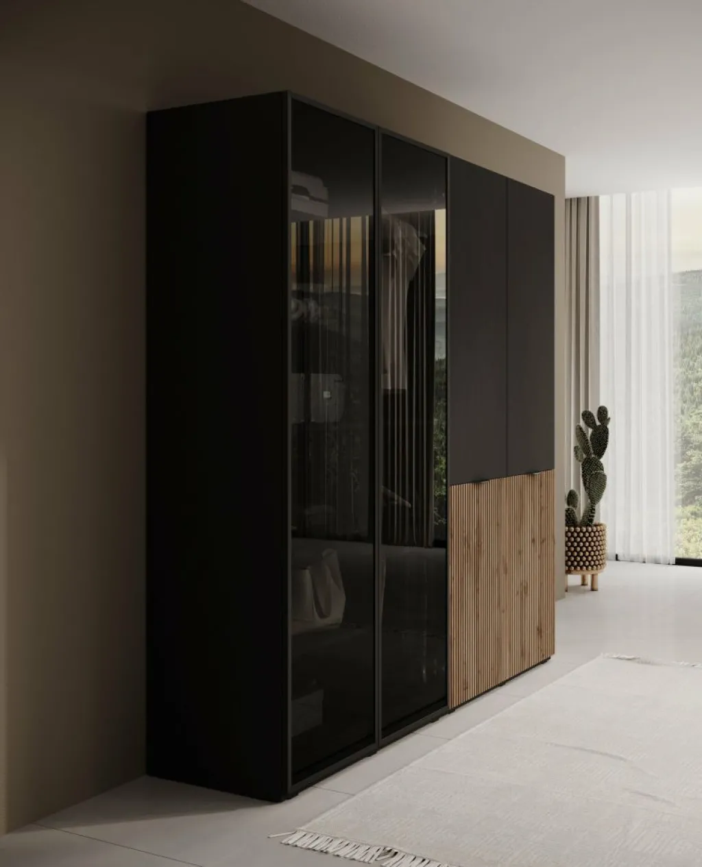 De kast is uitgevoerd in een combinatie van mat zwart en Wotan eikenhout-look, wat zorgt voor een warme, eigentijdse uitstraling.