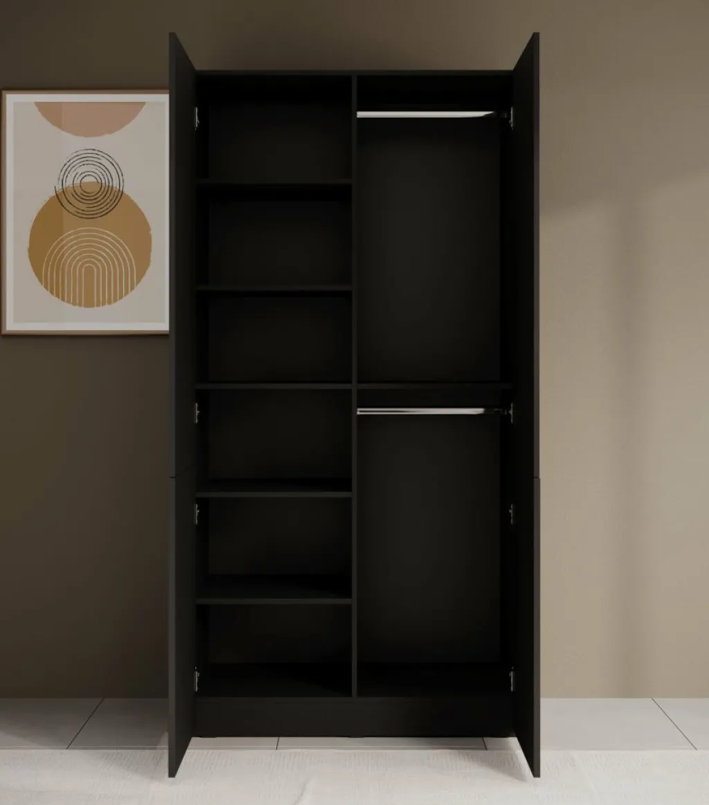 De Shelton kledingkast is een praktische opbergoplossing met twee draaideuren, ideaal voor slaapkamers, gangen of andere ruimtes waar extra kastruimte nodig is. Achter de deuren vind je een kledingroede voor het netjes ophangen van kledingstukken zoals jassen, jurken en overhemden. Daarnaast zijn er legplanken beschikbaar om bijvoorbeeld truien, broeken of schoenen overzichtelijk op te bergen, zodat alles snel terug te vinden is.